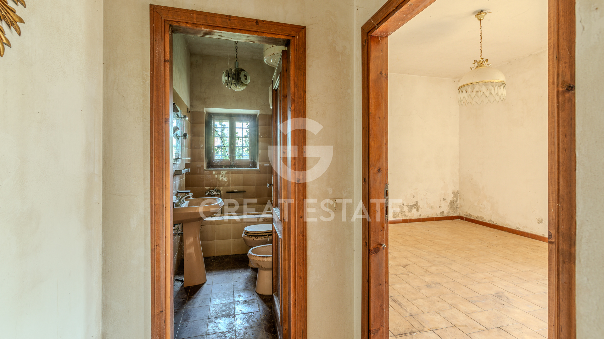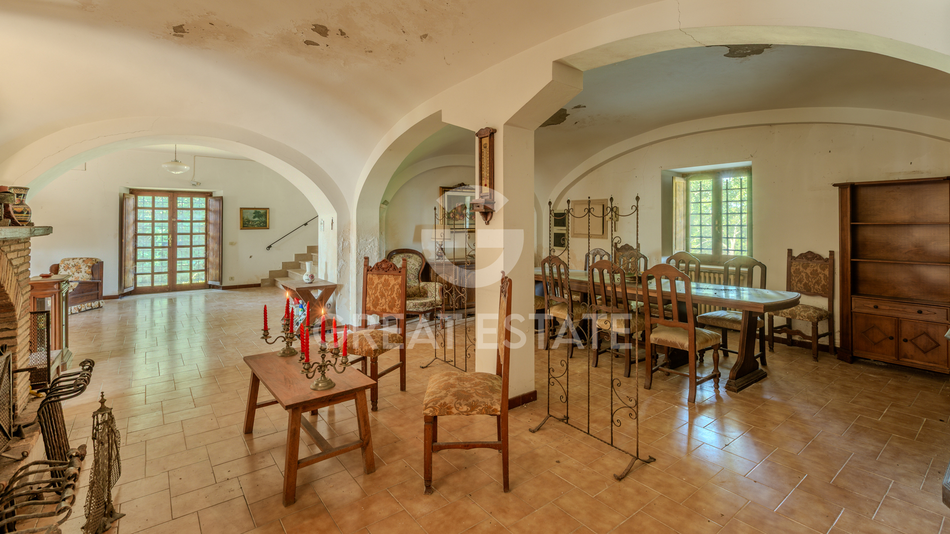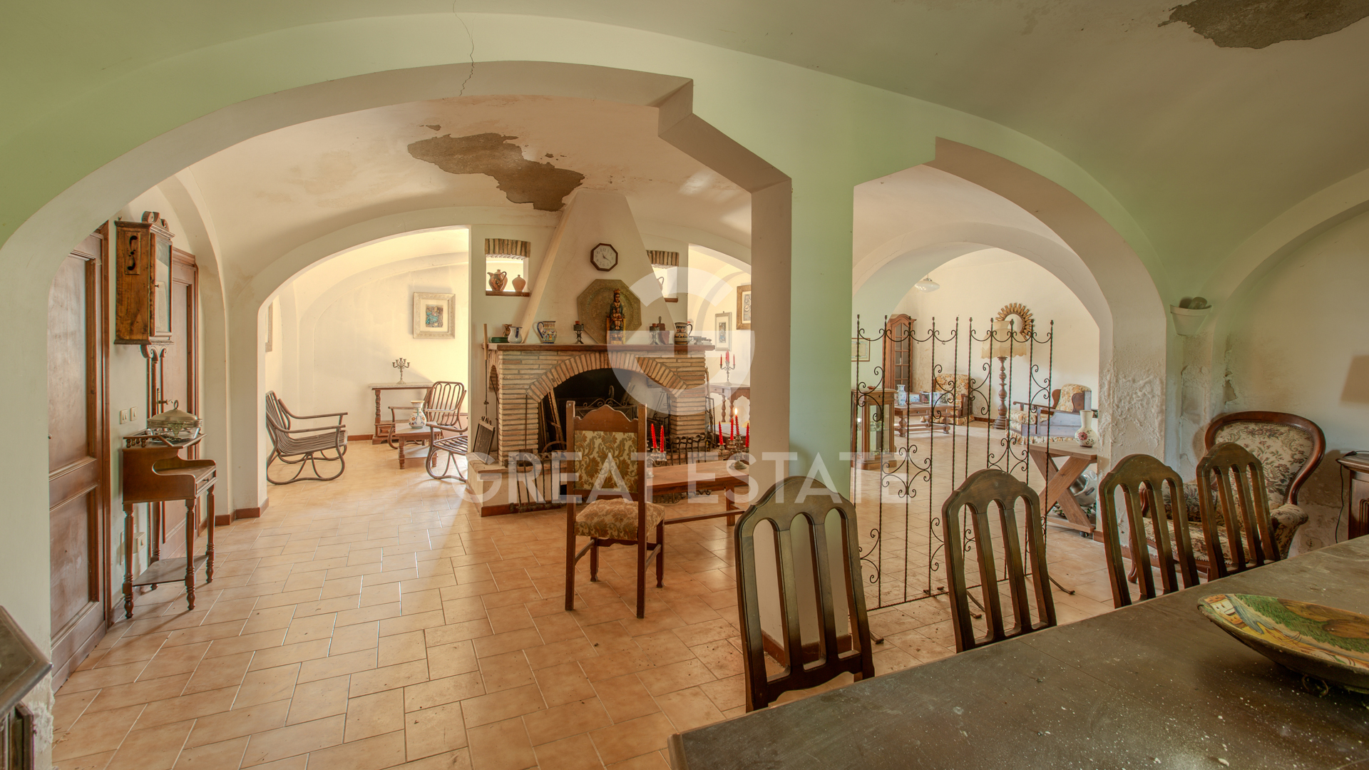 The main farmhouse, in need of restoration, features an apartment spread over two levels (connected by an internal staircase) comprising: a large and characterful L-shaped living room with a central fireplace and vaulted ceilings, a study/bedroom, a spacious kitchen, a hallway, one bathroom, a bedroom, and a generous porch on the ground floor. Ascending the staircase, one reaches the first floor which offers a wide sleeping area with five bedrooms (or alternatively a second apartment), including a large salon with wooden and terracotta ceilings that opens onto a vast panoramic terrace, a kitchenette, a large bathroom, and a WC. With careful renovation, additional bathrooms can be created to serve the bedrooms.