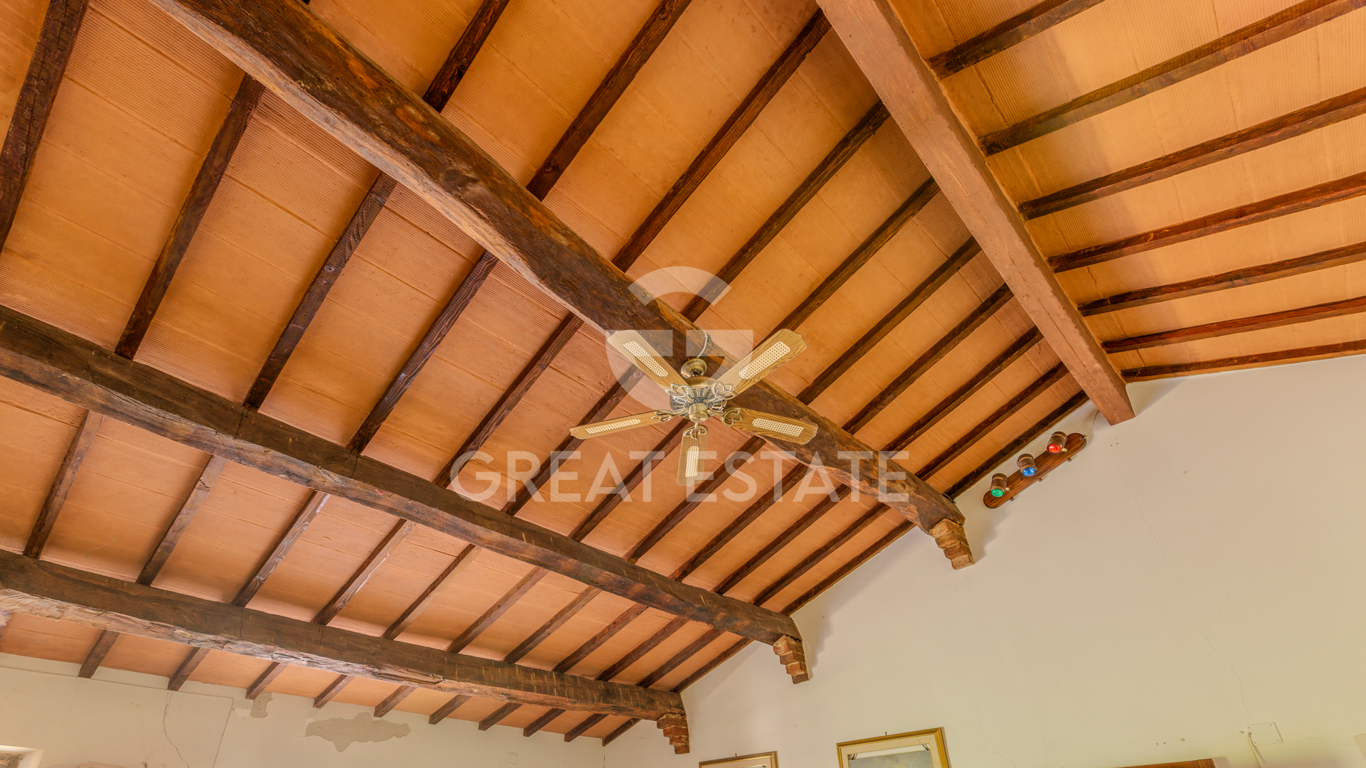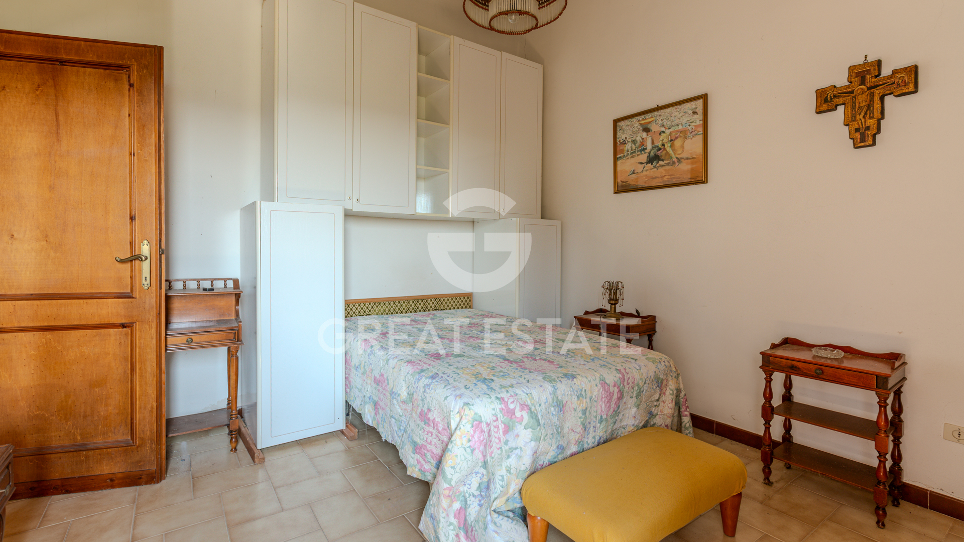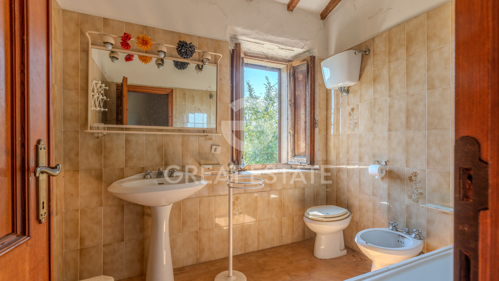 The main farmhouse, in need of restoration, features an apartment spread over two levels (connected by an internal staircase) comprising: a large and characterful L-shaped living room with a central fireplace and vaulted ceilings, a study/bedroom, a spacious kitchen, a hallway, one bathroom, a bedroom, and a generous porch on the ground floor. Ascending the staircase, one reaches the first floor which offers a wide sleeping area with five bedrooms (or alternatively a second apartment), including a large salon with wooden and terracotta ceilings that opens onto a vast panoramic terrace, a kitchenette, a large bathroom, and a WC. With careful renovation, additional bathrooms can be created to serve the bedrooms.