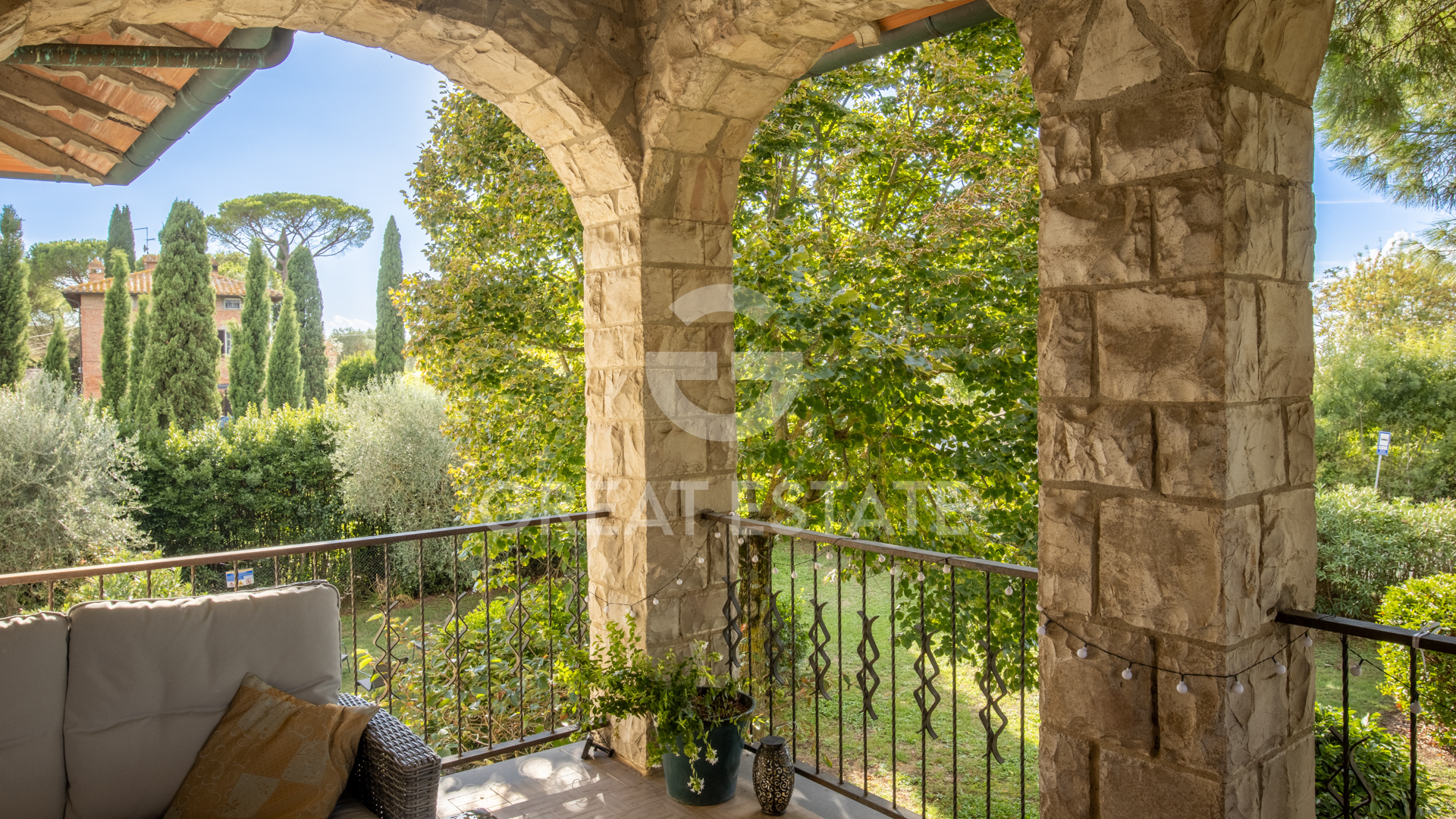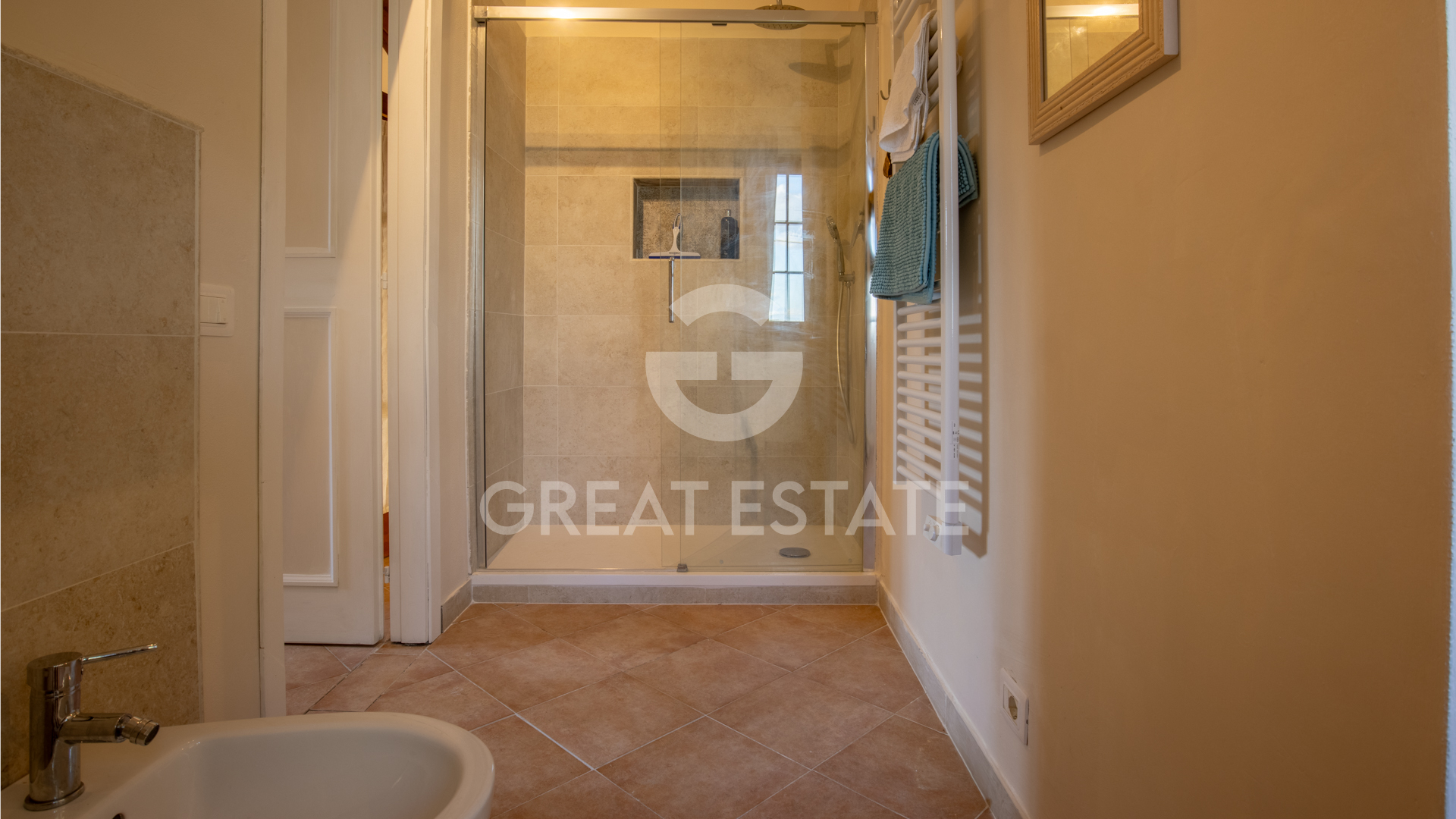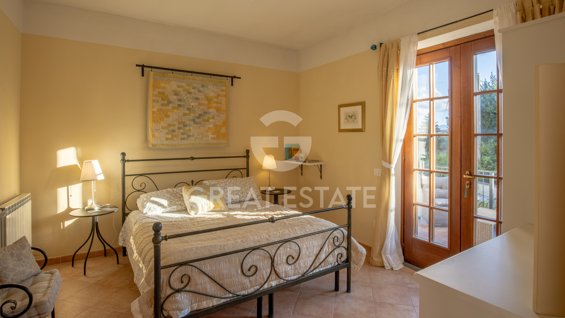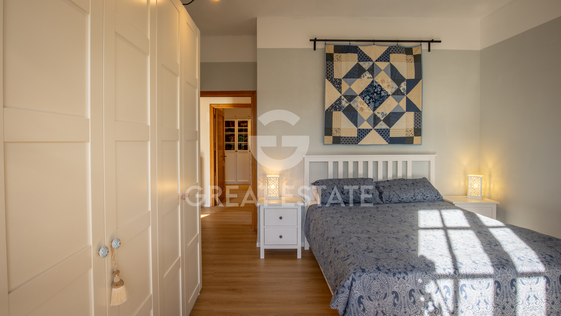 2) A master apartment on the first floor of approximately 120 square meters, consisting of a living room with balcony, an eat-in kitchen/dining room with 3 sets of French windows opening onto a wrap-around balcony and a charming stone-arched loggia where one can admire magnificent sunsets; two bedrooms, two bathrooms, a dressing room, plus a small guest bathroom/laundry room.