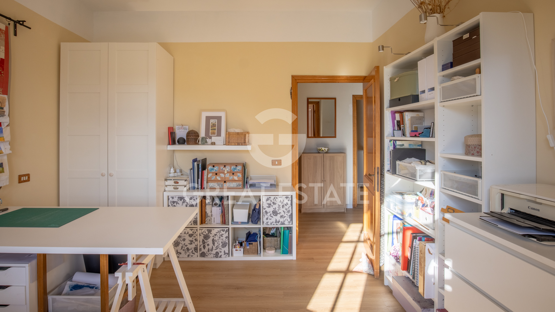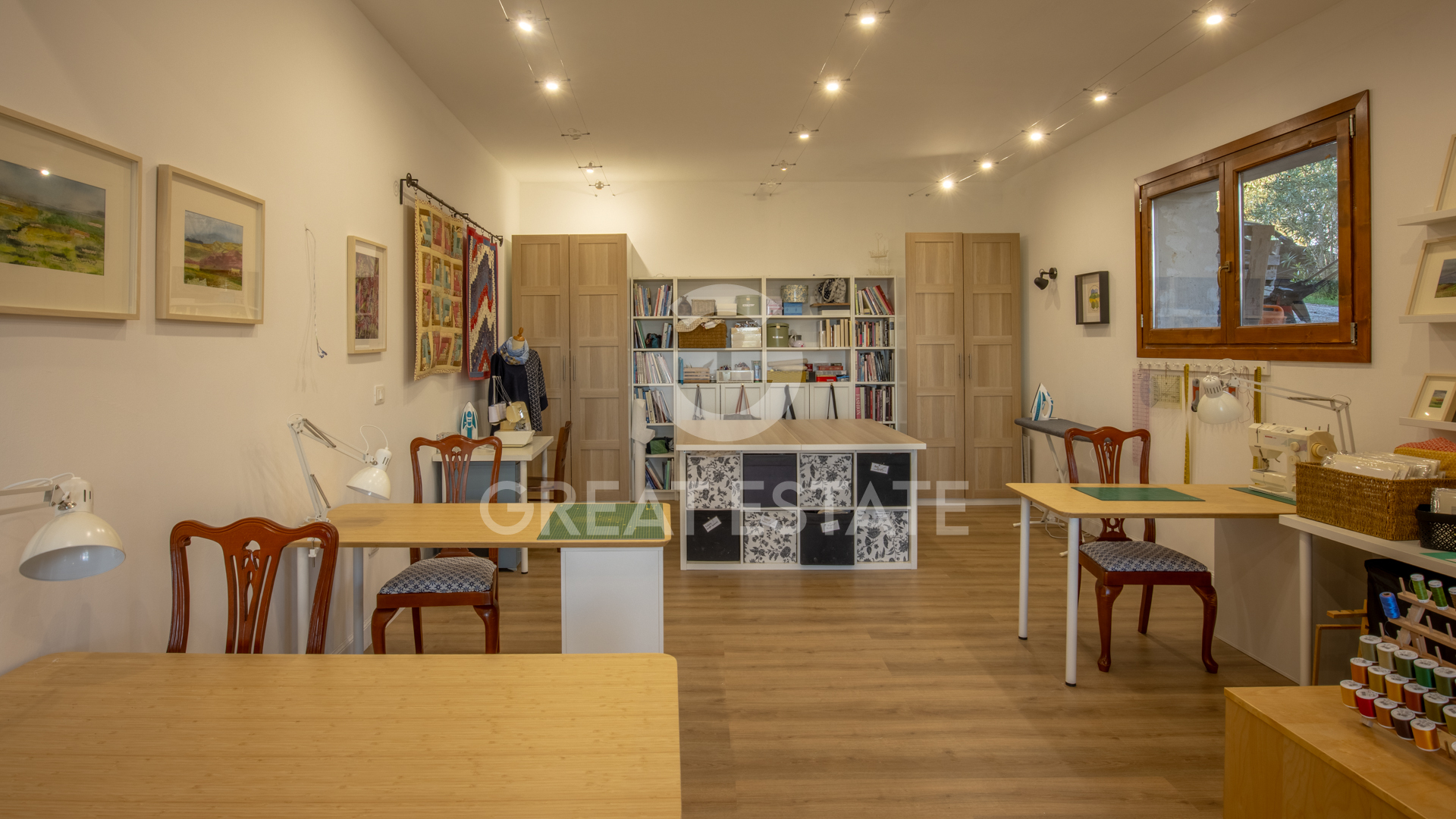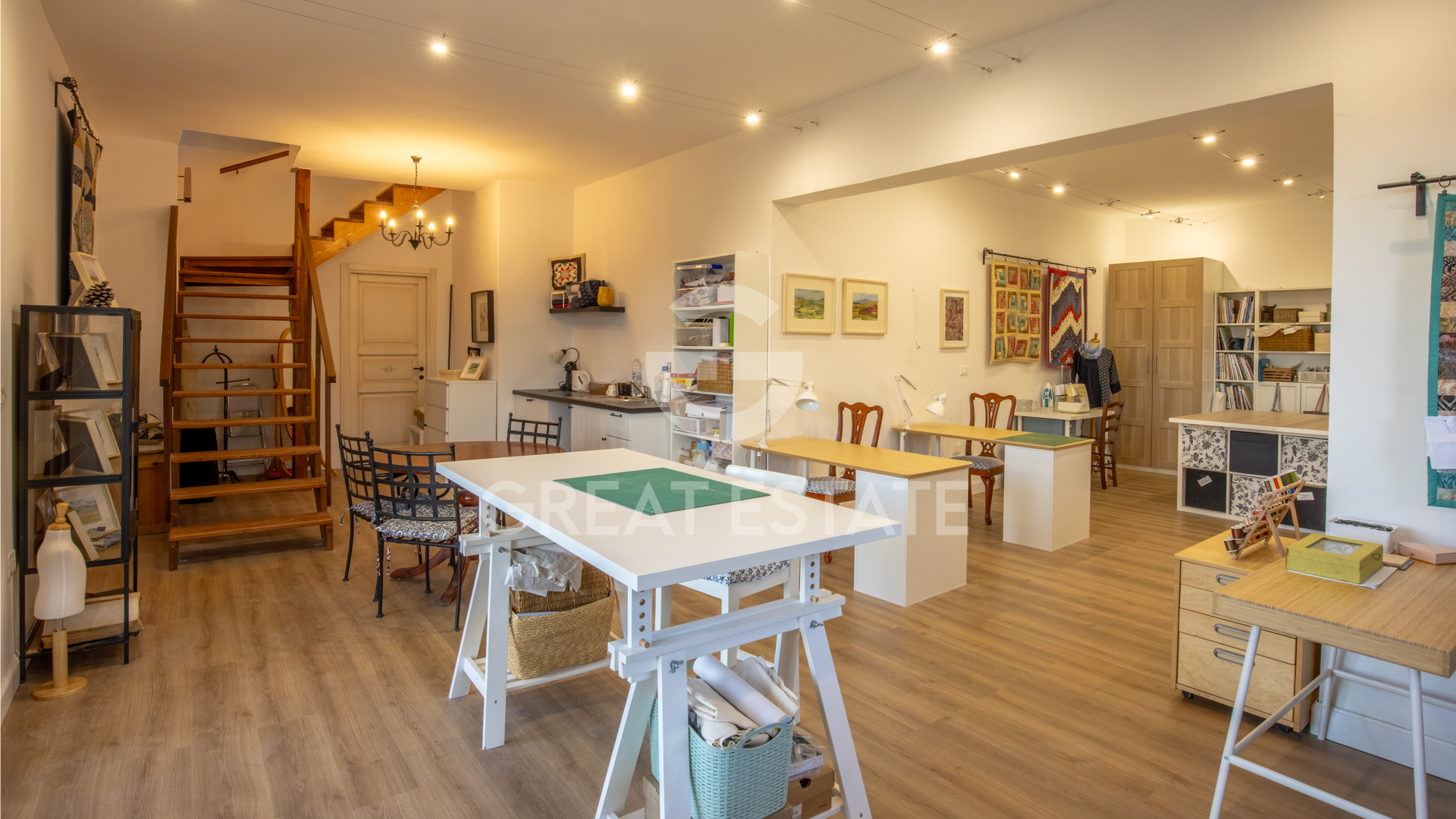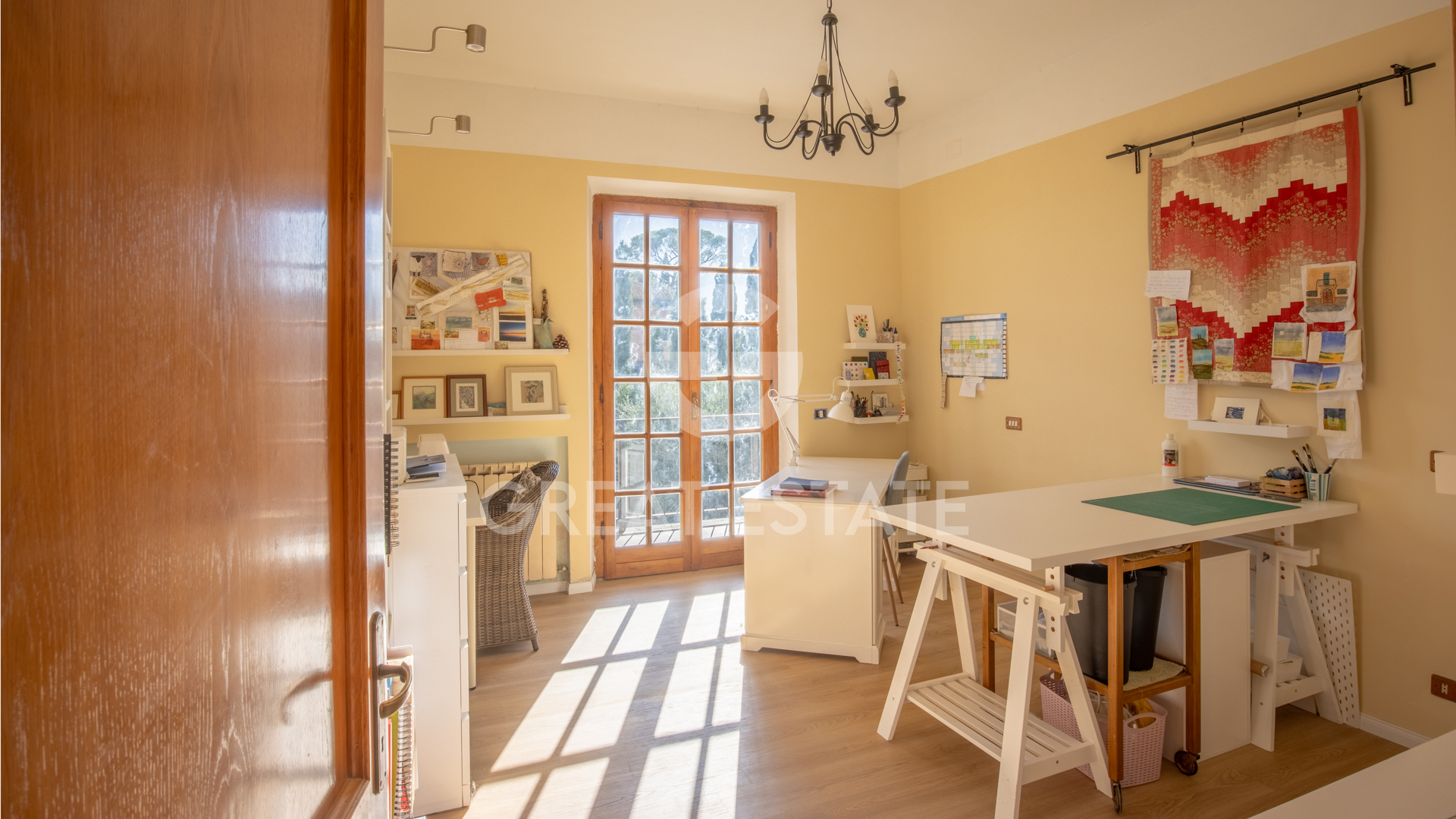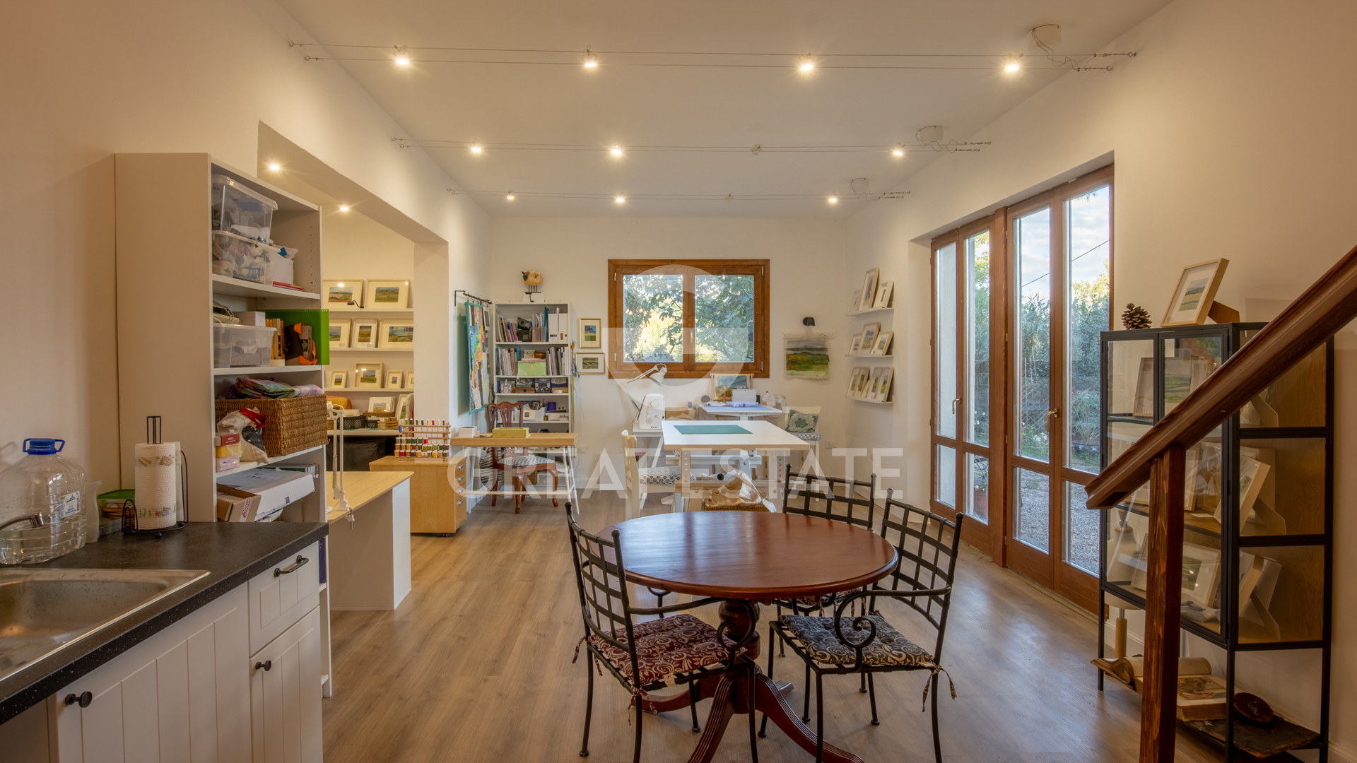 3) There is a large and bright tavern of approximately 65 square meters, with French doors opening onto a gravel terrace at the rear of the house, accessed via stairs from the ground floor apartment. Currently used as an art studio, it could be transformed into a games room, yoga studio, or cinema room.