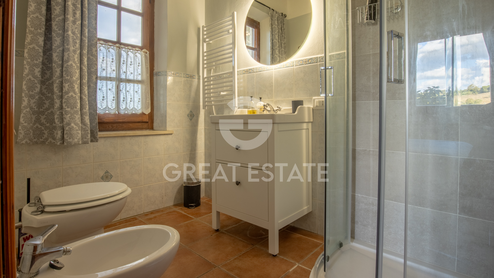 1) A spacious ground-floor apartment of approximately 137 square meters, comprising a living room with French doors leading to a raised terrace overlooking the pool area, offering breathtaking views of Umbria and Tuscany; a kitchen/dining room with French doors opening onto a second raised terrace overlooking the olive grove; a corridor; and 3 generously sized bedrooms, each with an en-suite bathroom with shower. One bedroom features French windows and a private balcony, always overlooking Umbria and Tuscany, while another bedroom has French windows with access to the living room terrace.