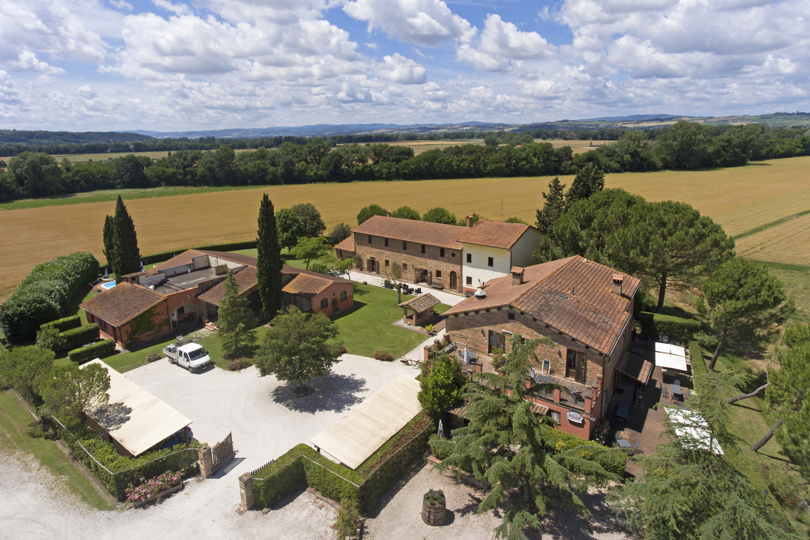 The farmhouses boast open-face brick facades and roof covered with typical tiles. The internal details are particularly well finished: antique cotto pavements, ceilings with wooden beams and tiles, ancient wood doors and windows, brick arches in the common living room, antique furniture, windowsills with cotto bricks.