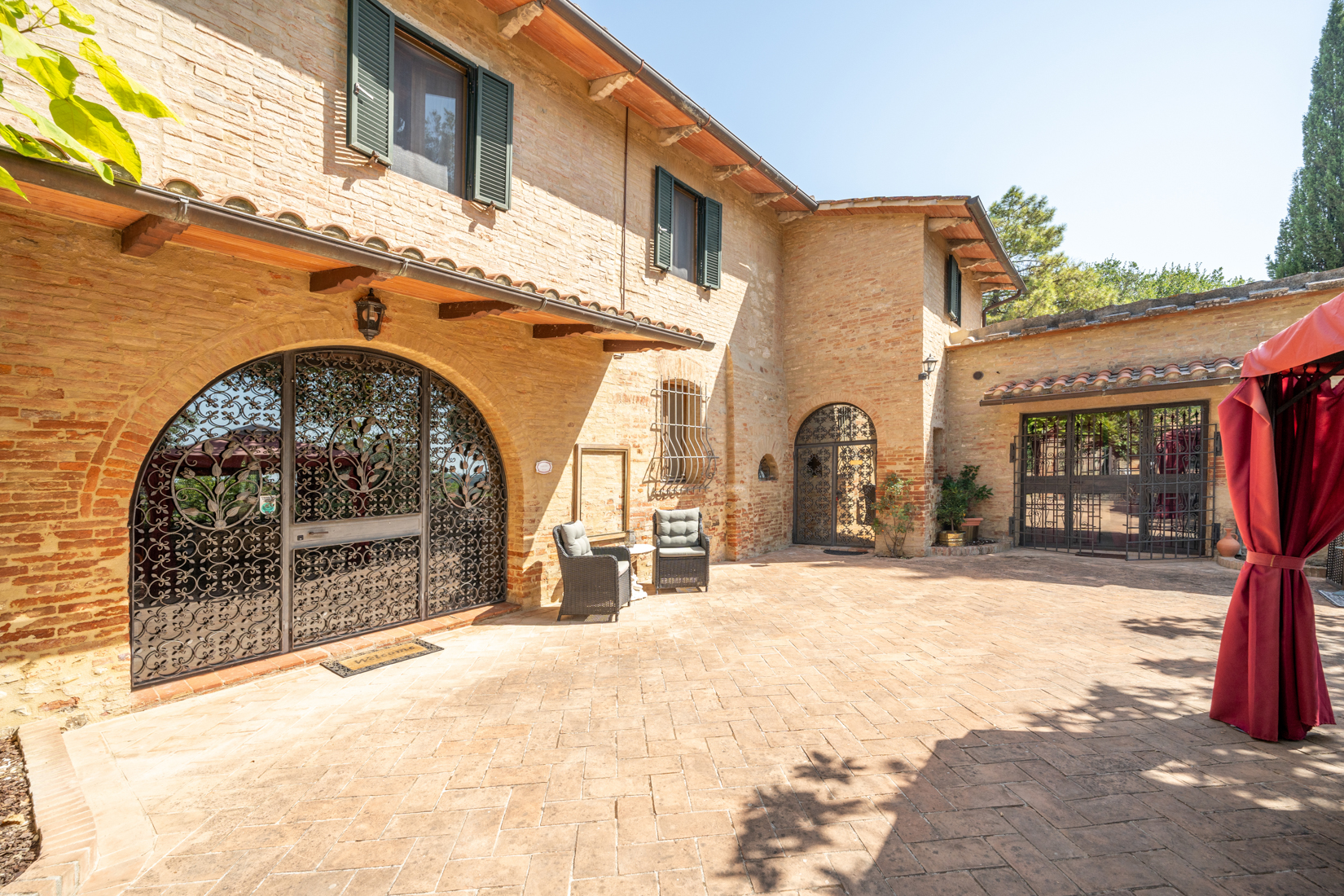 Exclusive renovated farmhouse of 370 sqm for sale with an annexe of 181 sqm and swimming pool in a private location a few steps from Siena, with a total of 9 bedrooms and 12 bathrooms.