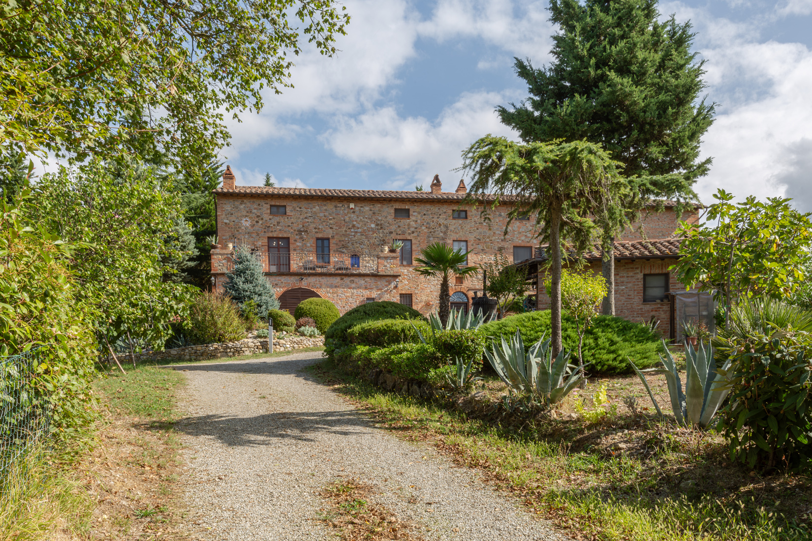 The farmhouse covers an area of about 758 square metres on three levels divided into five flats. On the ground floor, the first flat consists of an entrance hall, a kitchen with an American-style island, a bathroom with shower, a living room with a large French window, on the first floor a large double bedroom with double doors and a terrace and en-suite bathroom, a bedroom, and a cloakroom. The second floor is accessed by an internal staircase where we find a large attic loft. The second flat is on three levels: on the ground floor we find a large kitchen with an arch and a living room; on the first floor via an internal staircase there are two bedrooms, a bathroom, and a hallway; on the second floor, there is a bedroom, a dressing room and a bathroom. The third flat on the ground floor consists of a living area with a living room and kitchenette, a bedroom and an en suite bathroom. The fourth flat on the first floor consists of a bedroom with a bathroom, a service bathroom, a living room with a kitchenette, and a mezzanine bedroom. The fifth flat consists of a living room with a kitchenette, a bathroom, and a mezzanine bedroom. The property is completed by a beautiful garden park of approx. 0.5ha with Mediterranean and succulent plants. Various pergolas with creepers and flowering plants have been set up around the farmhouse, as well as a 14×8 swimming pool with a chlorine system and an exclusive plot of land of about 33ha.