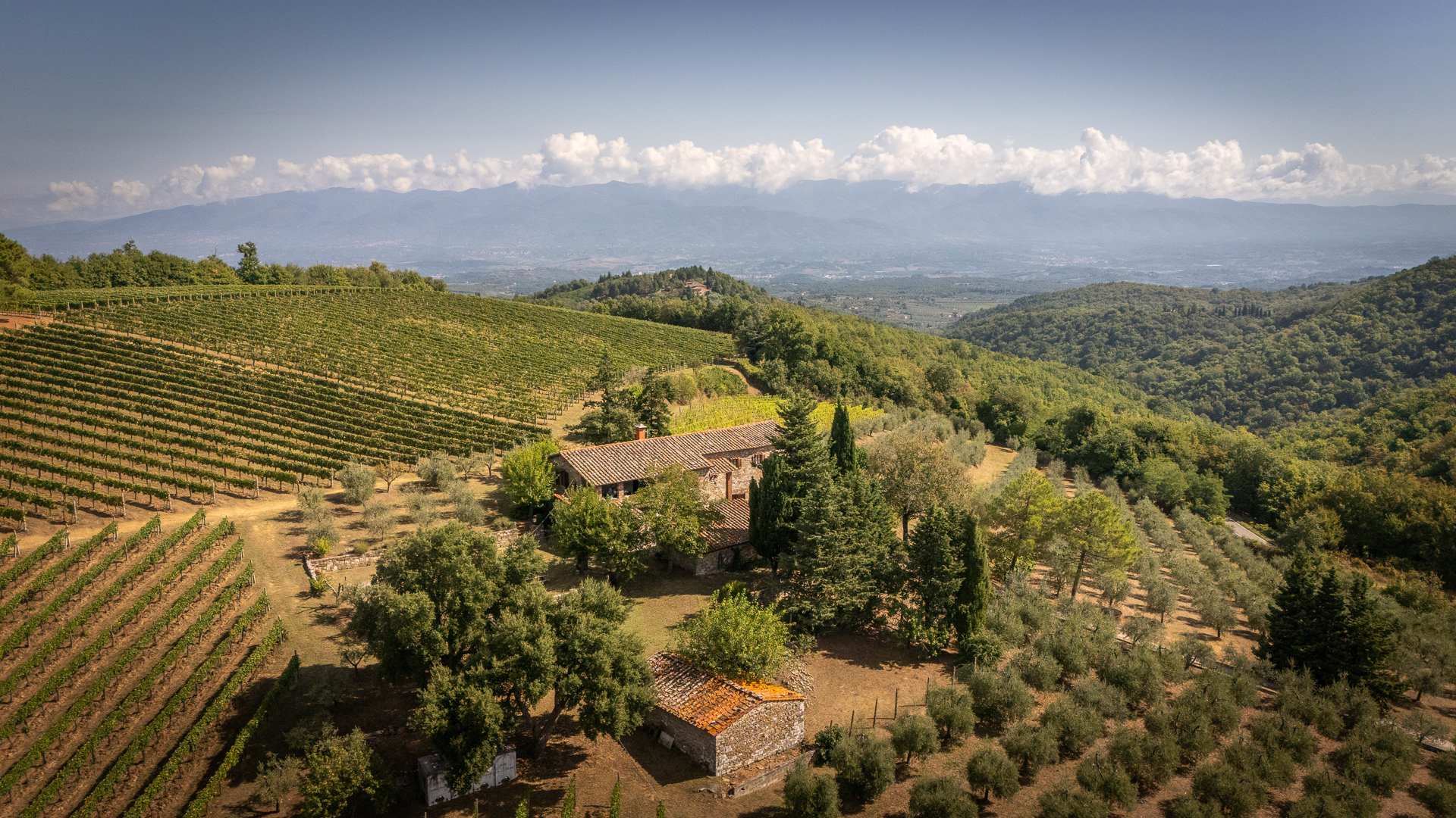 Magnificent winery located in a dominating position in the Chianti hills, comprising a stone farmhouse, cellar, outbuildings, certified organic vineyard, and olive grove.