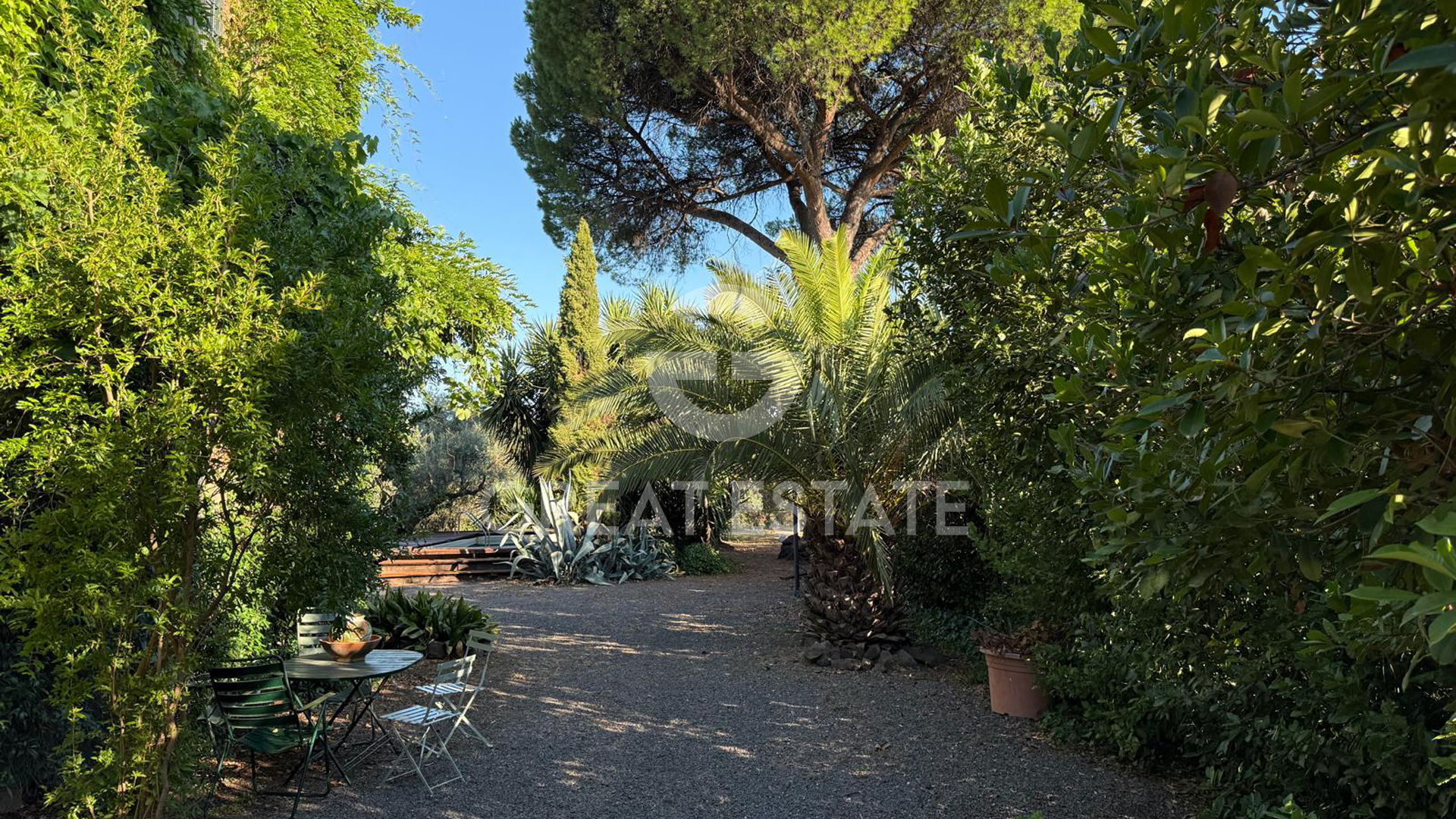The dramatic entrance, framed by towering cypress trees and a wrought iron gate, leads into a secluded and enchanting environment.