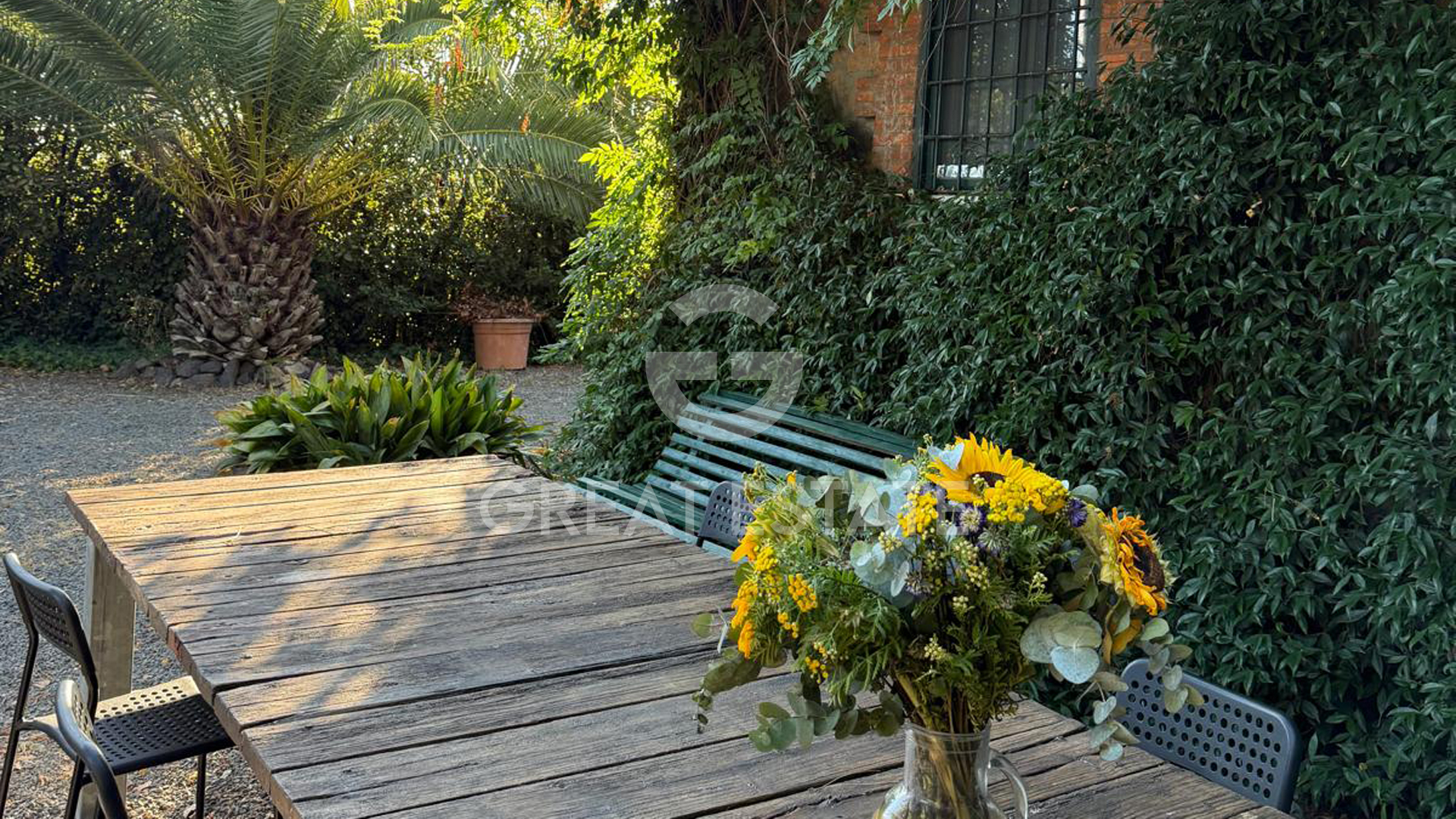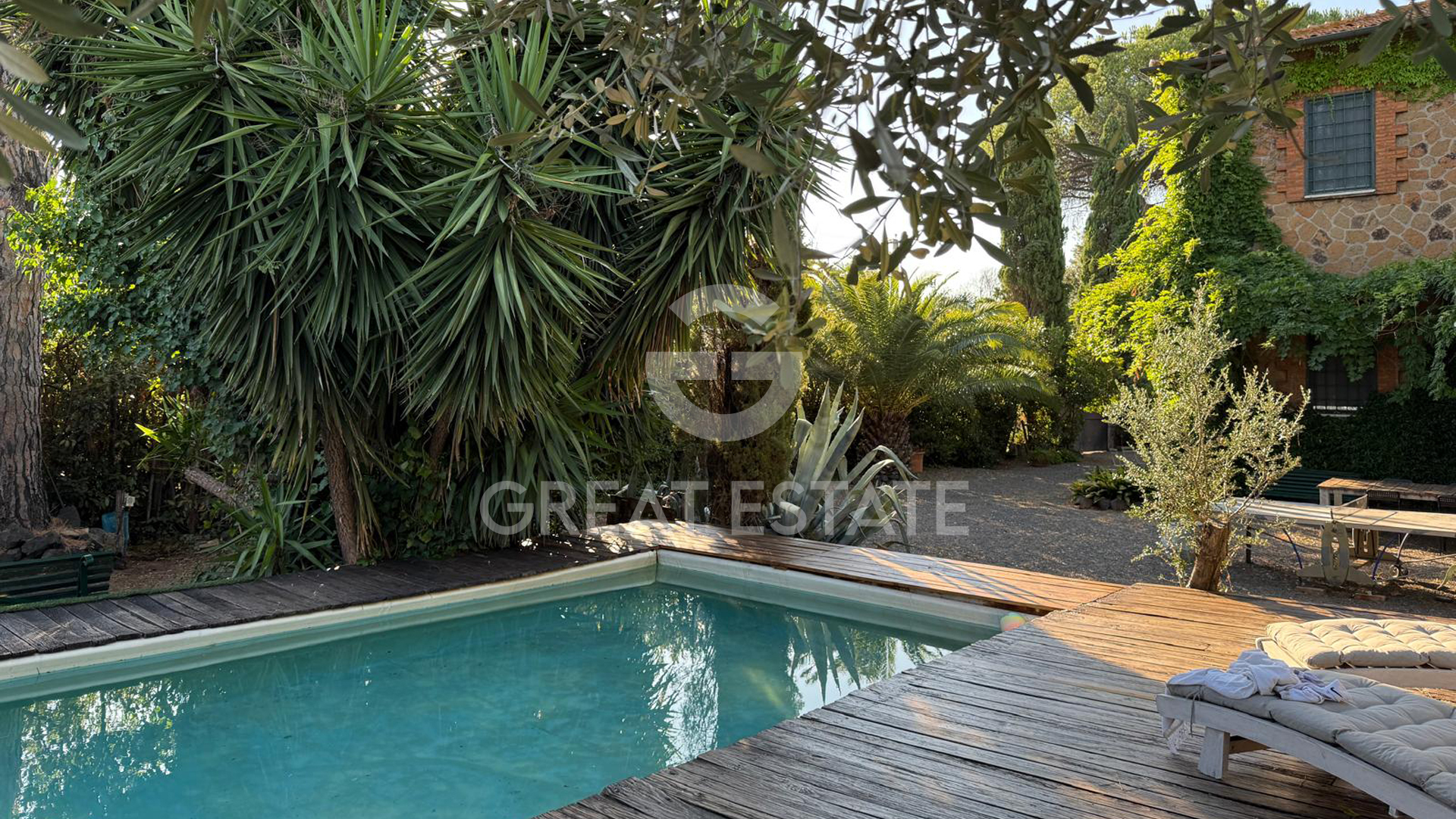 The stone and brick façades of the residence are adorned with climbing plants that transform the garden through the seasons: from blooming wisteria cascading along the walls to palms and yuccas that add a Mediterranean touch, as well as countless olive trees. This refined balance between nature and architecture makes the garden the beating heart of the property: a peaceful and beautiful retreat just minutes from the city but with the authentic soul of the countryside.
