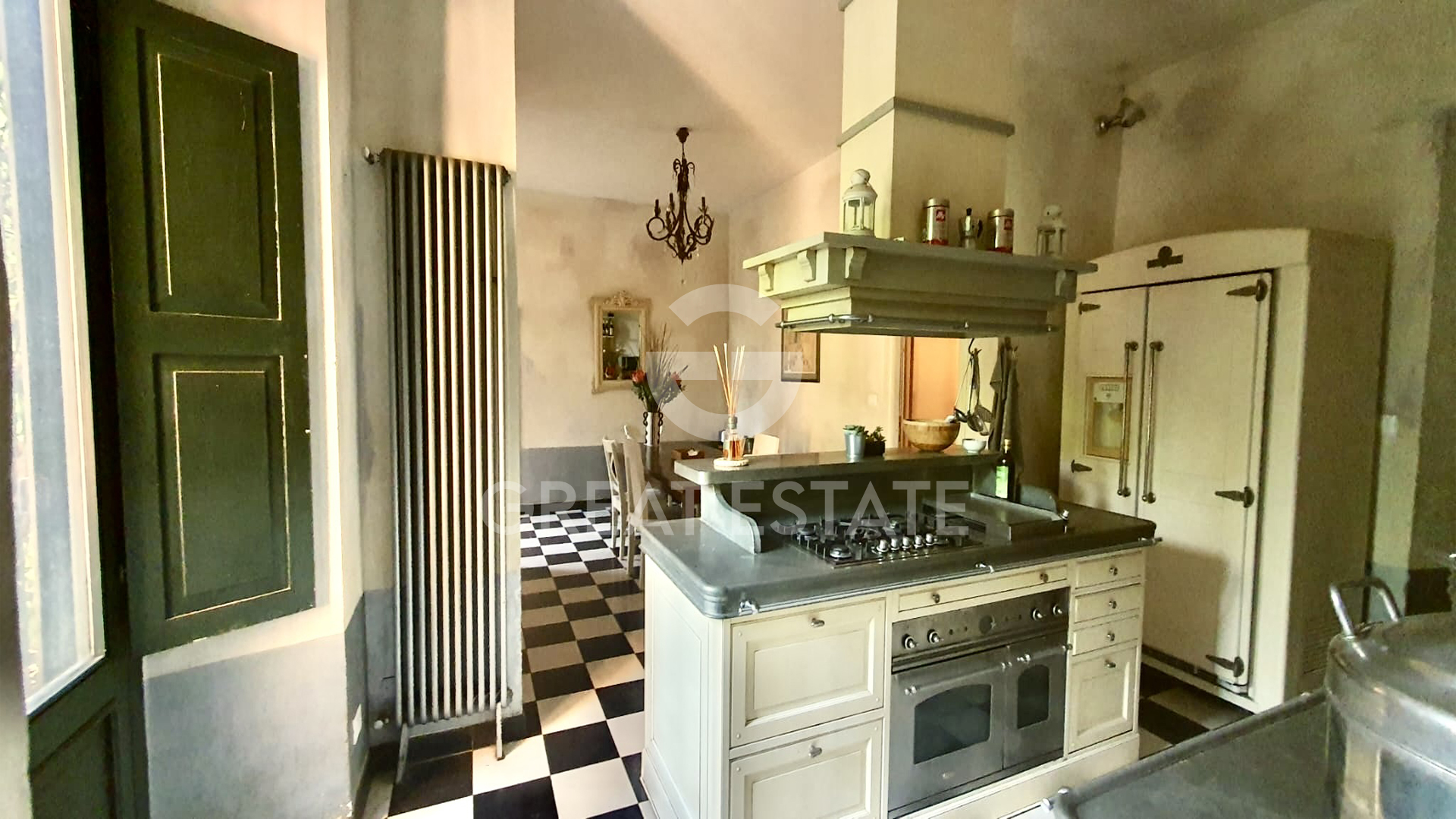 On the raised ground floor, there is a large, bright double living room with flooring made from reclaimed wood sourced from a historic chalet in South Tyrol, a spacious custom kitchen with a central island (enhanced by original black and white ceramic tiles from the Netherlands); the kitchen’s design masterfully blends retro style with modern touches and includes a double oven, a teppanyaki cooking plate, and all the amenities for those who love to entertain.