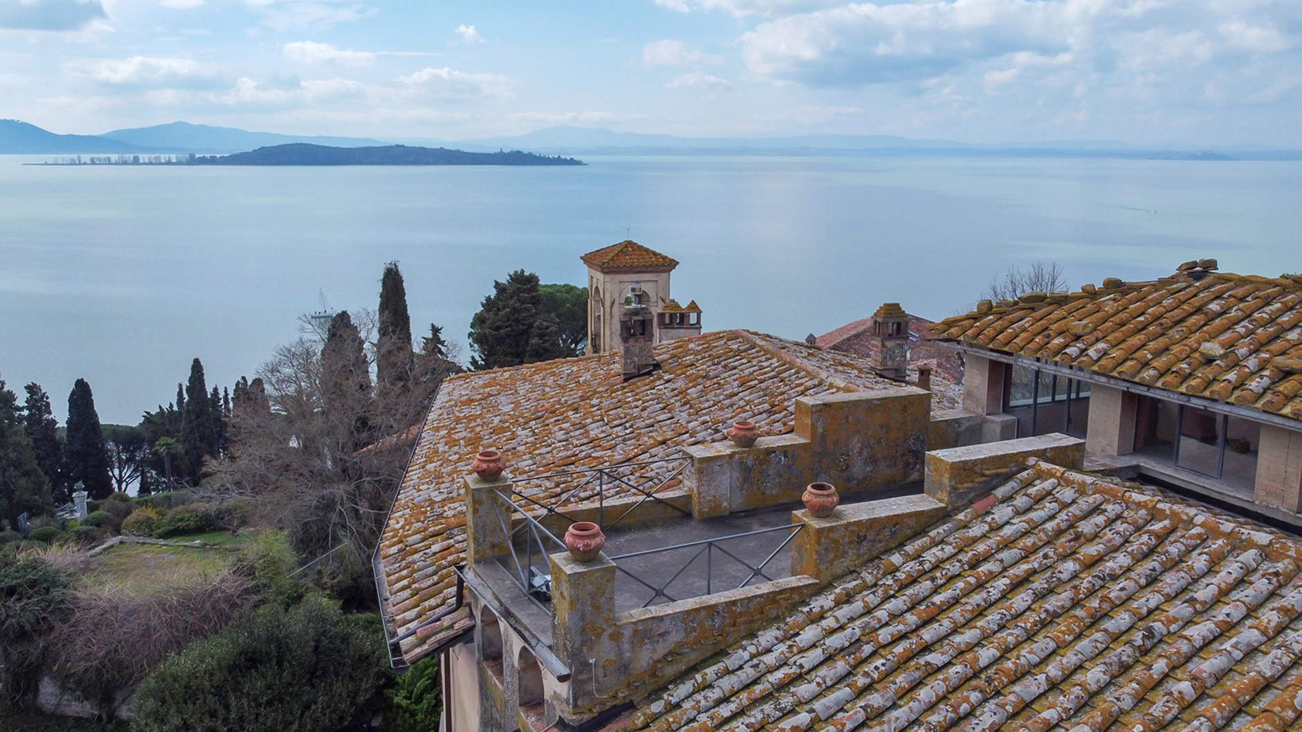 This historic villa is located in the most beautiful point of Lake Trasimeno from which you can enjoy a breathtaking view. The villa was built around the middle of the 19th century and presents various testimonies of the time. It was the home of Guido Pompilj and his wife, the poetess Vittoria Aganoor Pompilj, one of the most important figures of Italian poetry between the 19th and 20th centuries. The villa is on three floors, two of which are habitable and one with cellars. There is also a panoramic tower with a terrace that offers a 360° panorama of the lake and the green hills around. The property is located in the small town of Monte del Lago located on a promontory on the lake shore. The villa is surrounded on three sides by a high wall which allows for a lot of privacy and on one side there is an olive grove where it would be possible to build a swimming pool with lake view. The villa is on three floors including a basement where there are various cellars and a kitchen/rustic to host family reunions or when there are many friends, as well as an ancient bread oven. The first floor connected to the outside both by an external staircase from the front garden and by an internal staircase, houses an apartment with three large frescoed rooms, kitchen, pantry, 5 bedrooms, 3 bathrooms and various hallways. The second floor can be reached via an internal staircase where the second apartment is located, consisting of three rooms, two of which are connected to a large terrace called “La Terrazza della Poetessa” with an amazing view of the lake and a kitchen, three bedrooms, study, three bathrooms as well as a large entrance and various closets and hallways. Going up the stairs to a further floor you find yourself in a room with large windows on all sides and connected to a small terrace from which you can enjoy a unique 360° view of the lake and the green hills that surround it. A place to relax and seek inspiration. Both in front of the villa and in the back there are two Italian gardens with tall trees and elliptical flowerbeds. Also present in the garden is an ancient medieval tower, part of the ancient walls surrounding the property. The villa is, with its position and history, a unique and rare place. It could be used both as a private residence but also for a hospitality business. The villa requires a total renovation regarding systems, bathrooms, kitchens even if the structural condition is good.