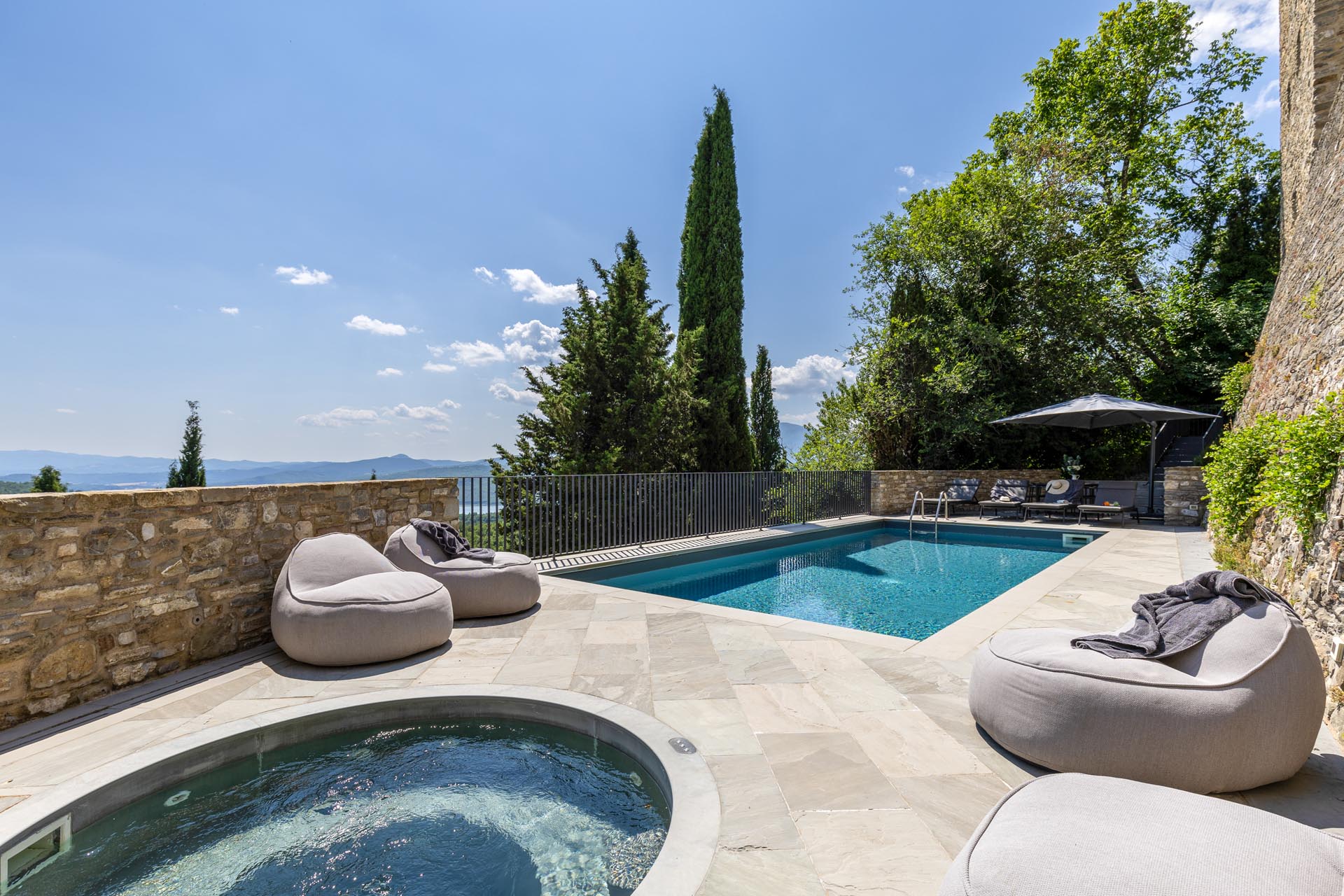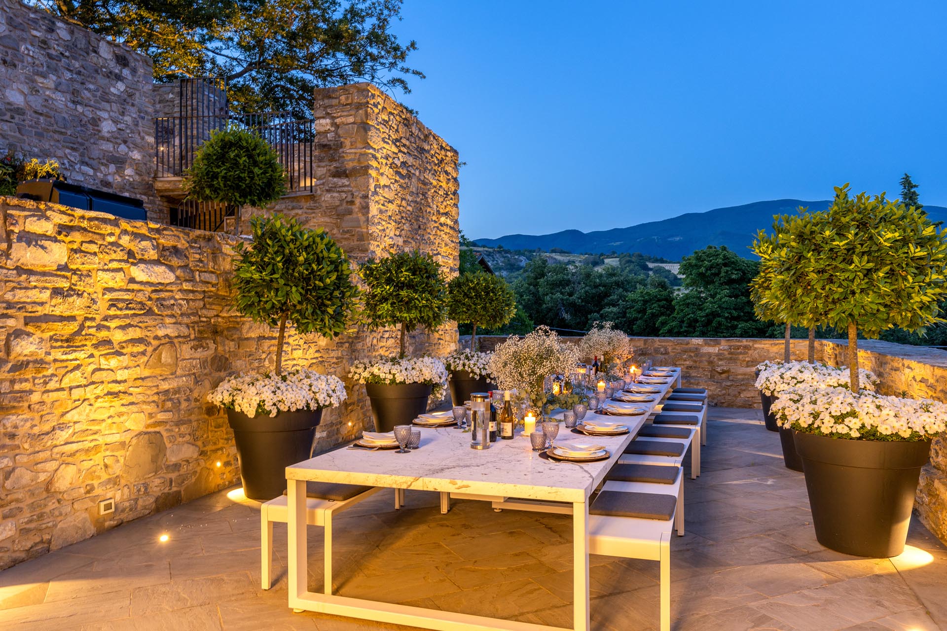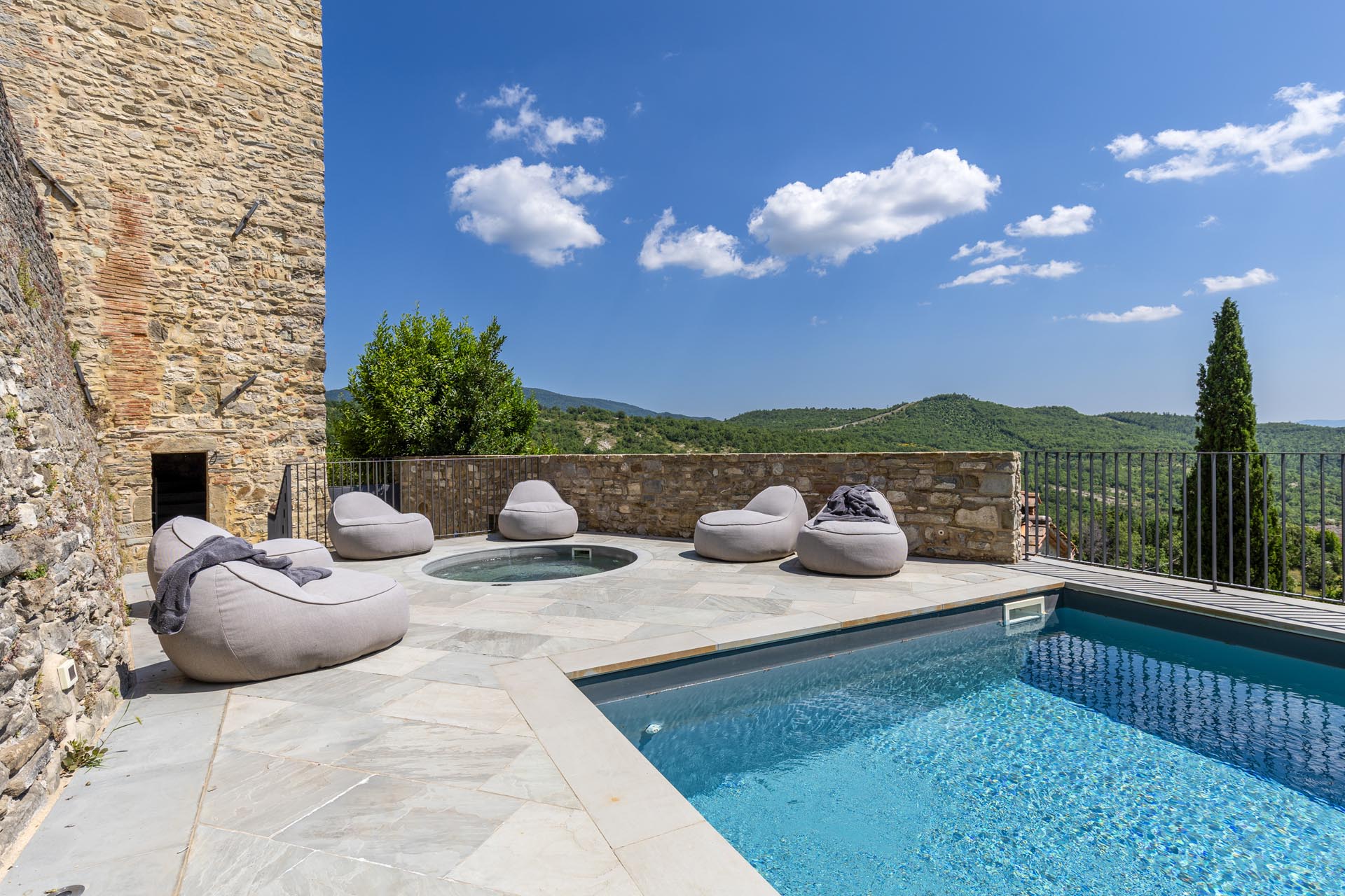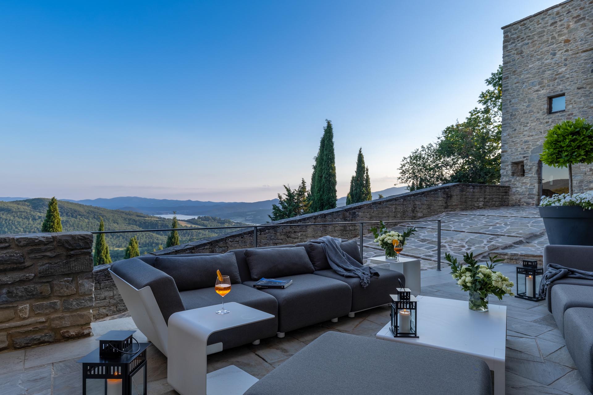 The castle on a hill provides breathtaking valley and lake views. It boasts multiple terraces with seating and sun loungers, a pool area, an outdoor dining terrace, and al fresco dining in the courtyard. The main terrace features a 24 person dining table, and the pool and Jacuzzi offer stunning vistas.
