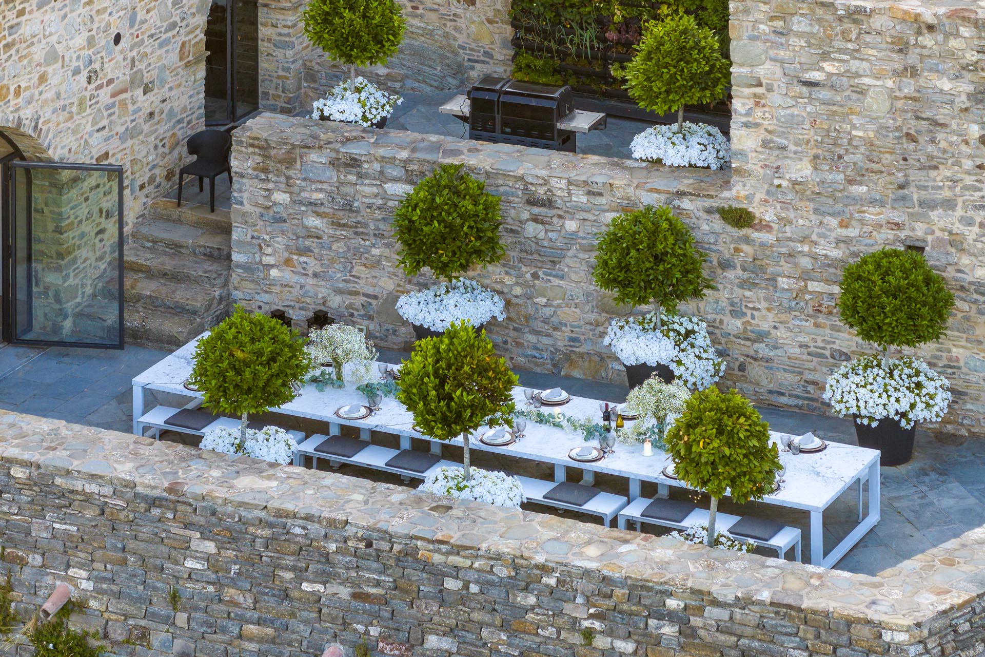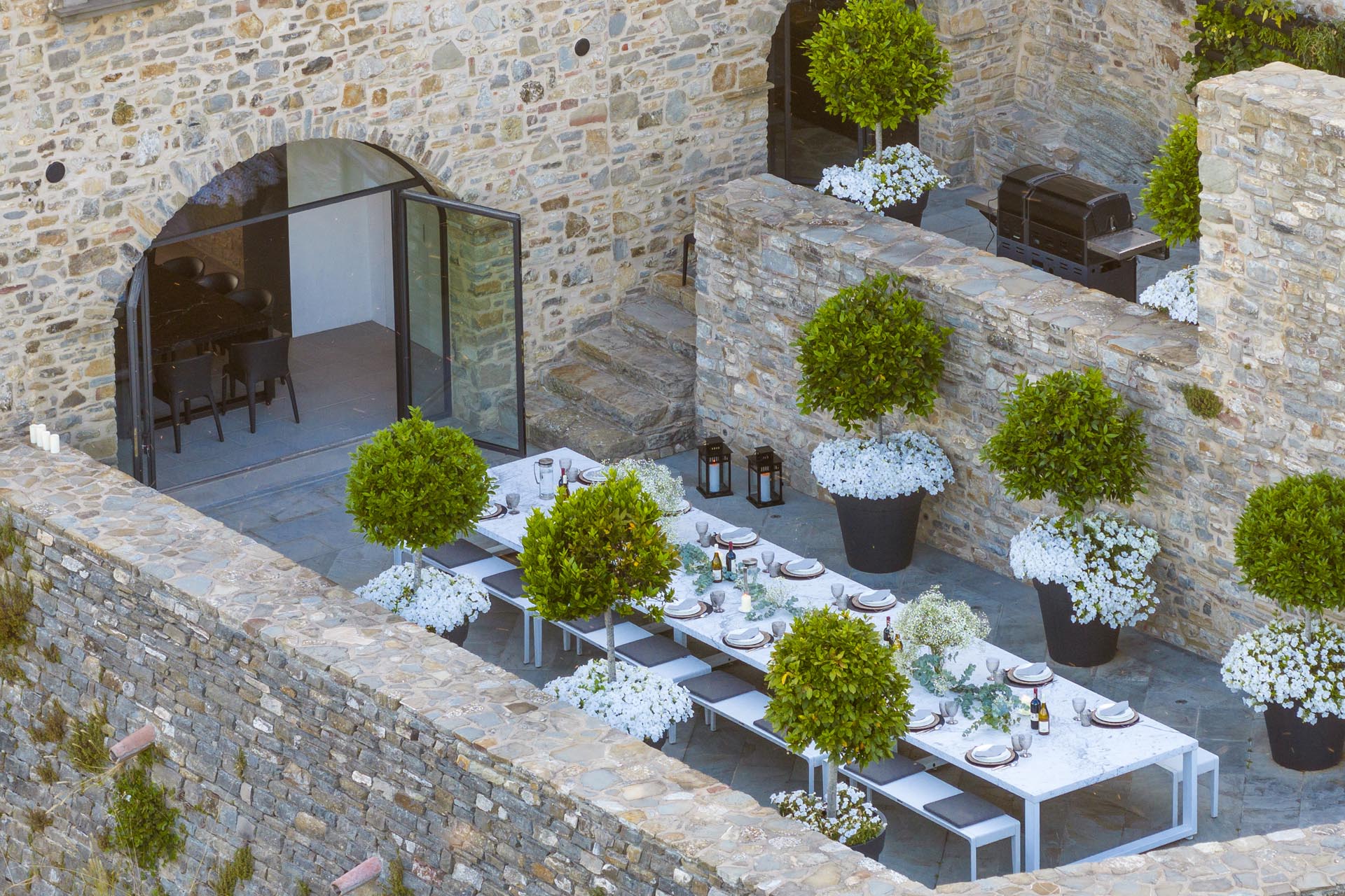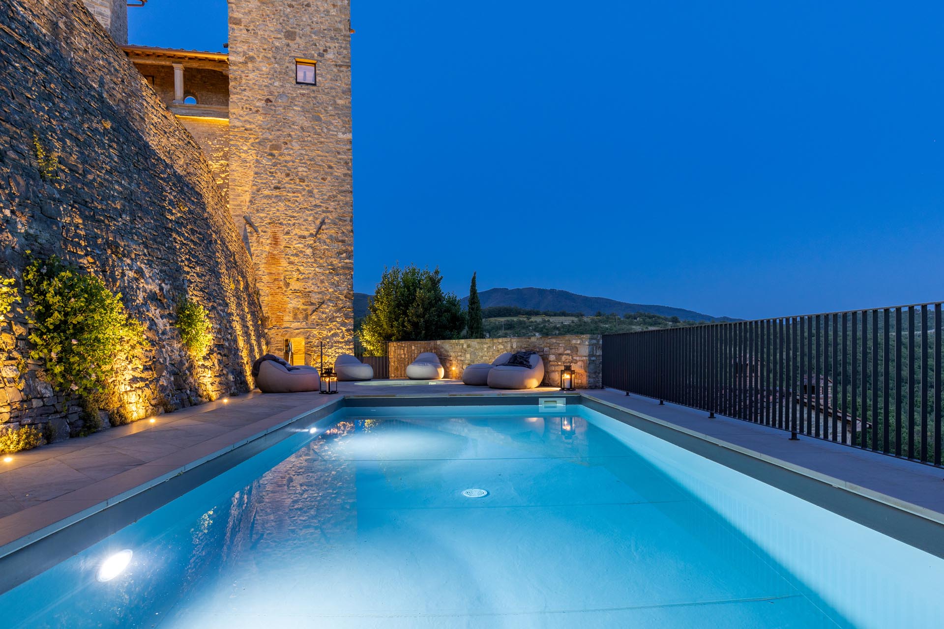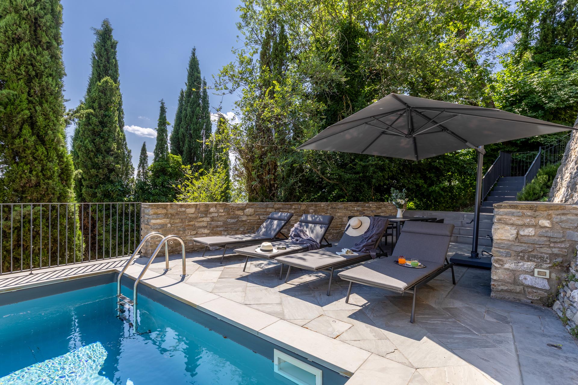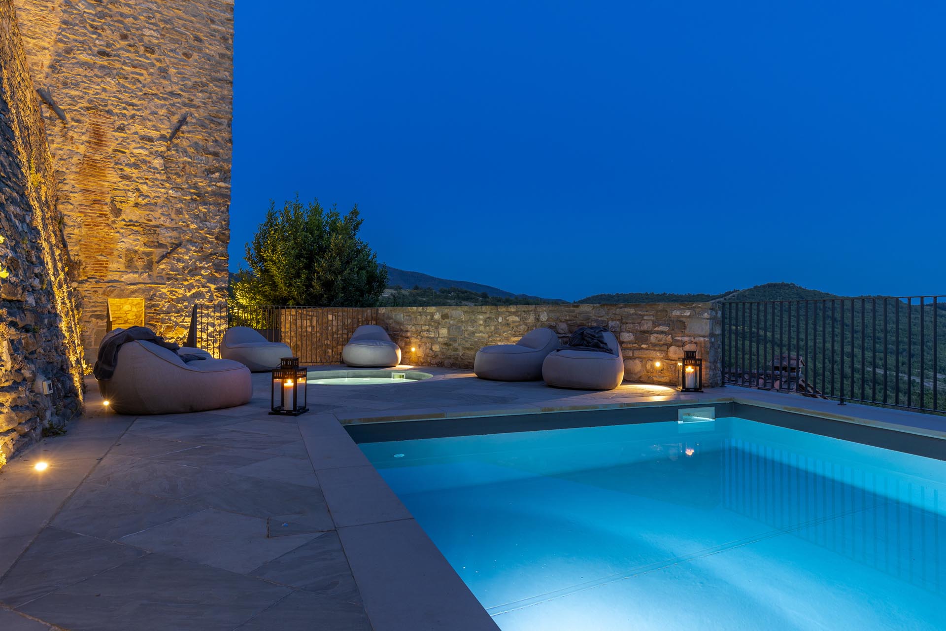 The castle on a hill provides breathtaking valley and lake views. It boasts multiple terraces with seating and sun loungers, a pool area, an outdoor dining terrace, and al fresco dining in the courtyard. The main terrace features a 24 person dining table, and the pool and Jacuzzi offer stunning vistas.