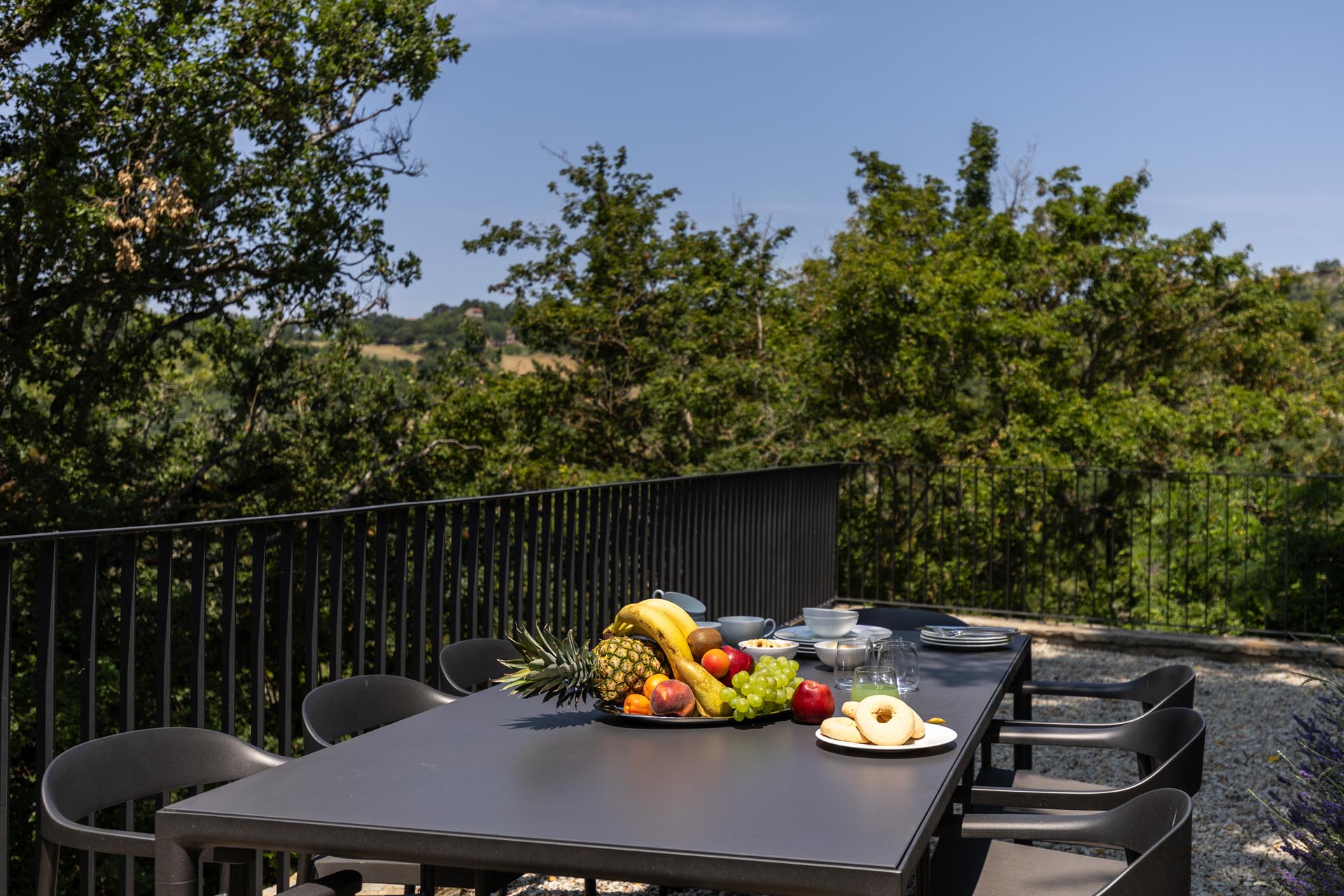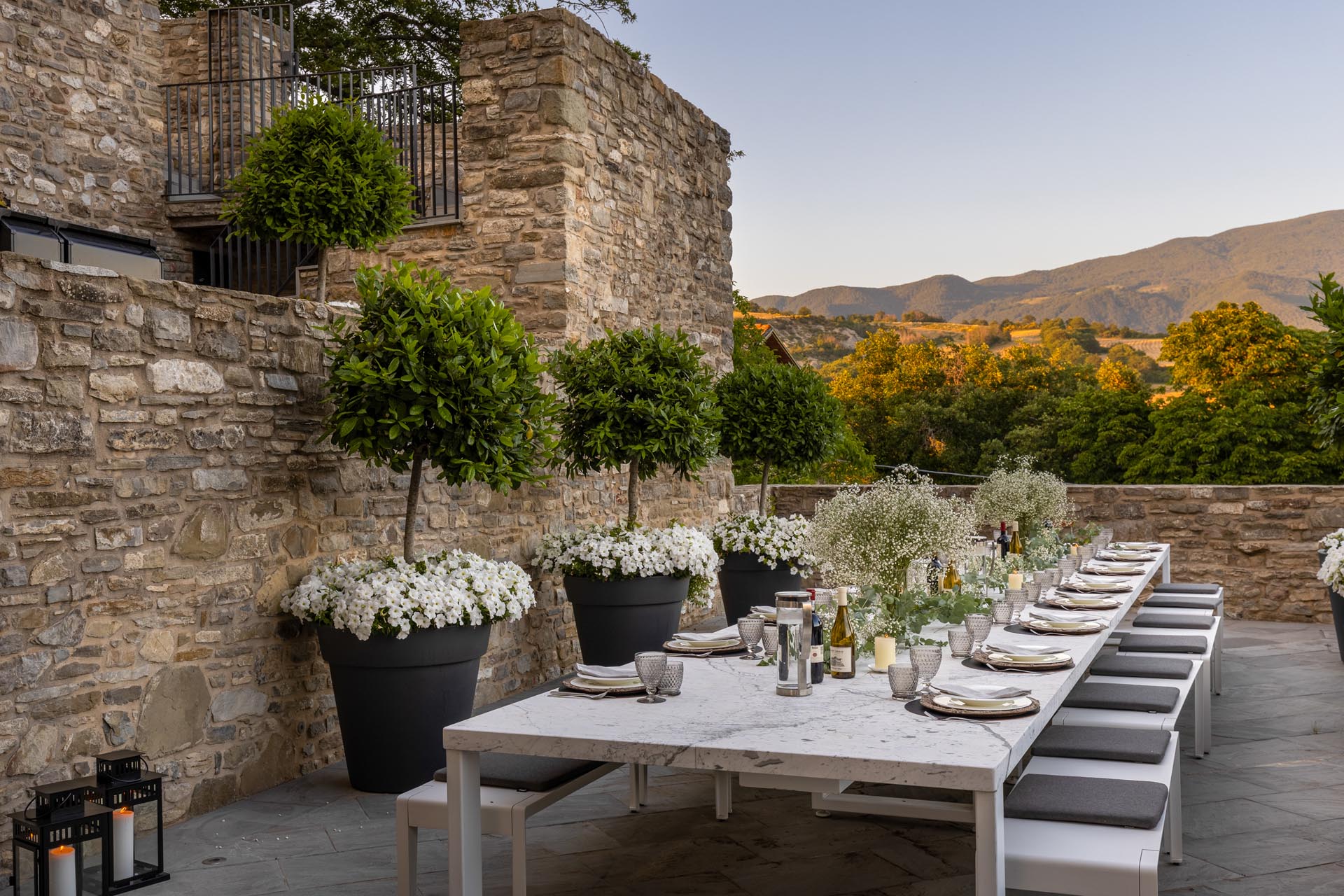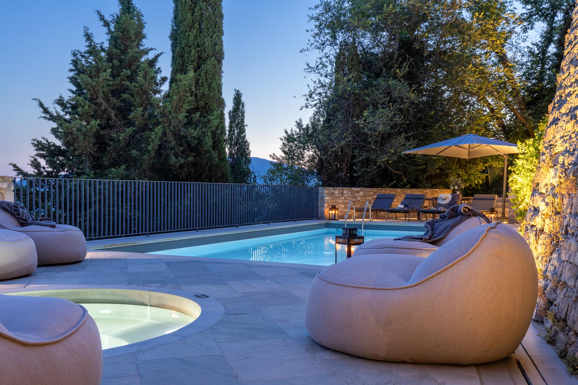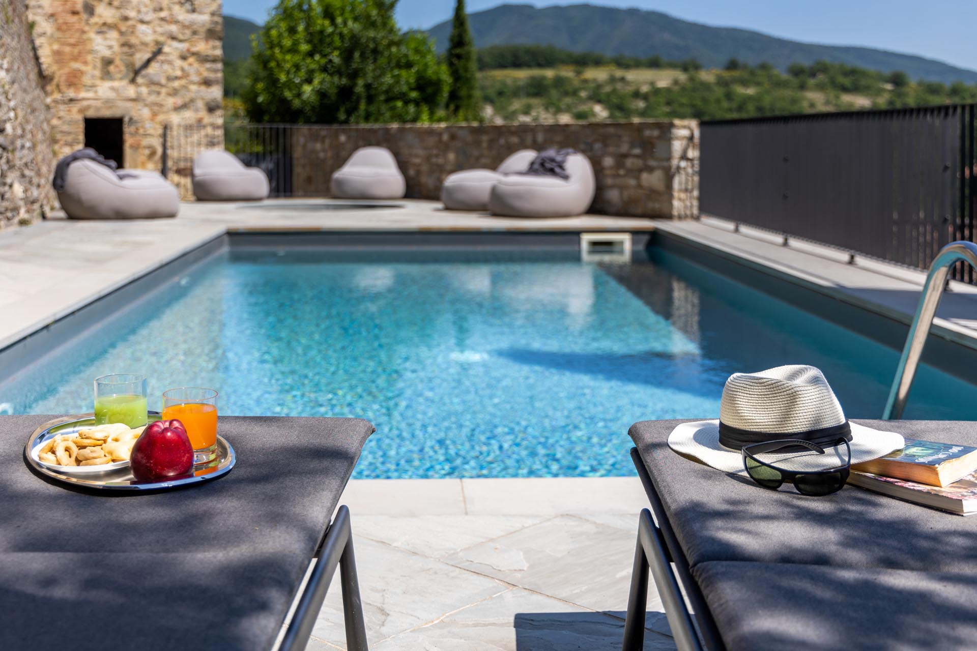 The castle on a hill provides breathtaking valley and lake views. It boasts multiple terraces with seating and sun loungers, a pool area, an outdoor dining terrace, and al fresco dining in the courtyard. The main terrace features a 24 person dining table, and the pool and Jacuzzi offer stunning vistas.