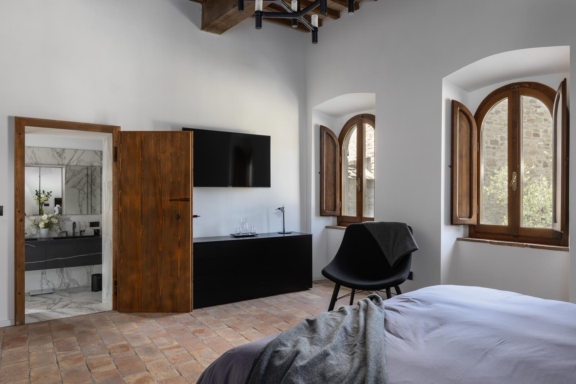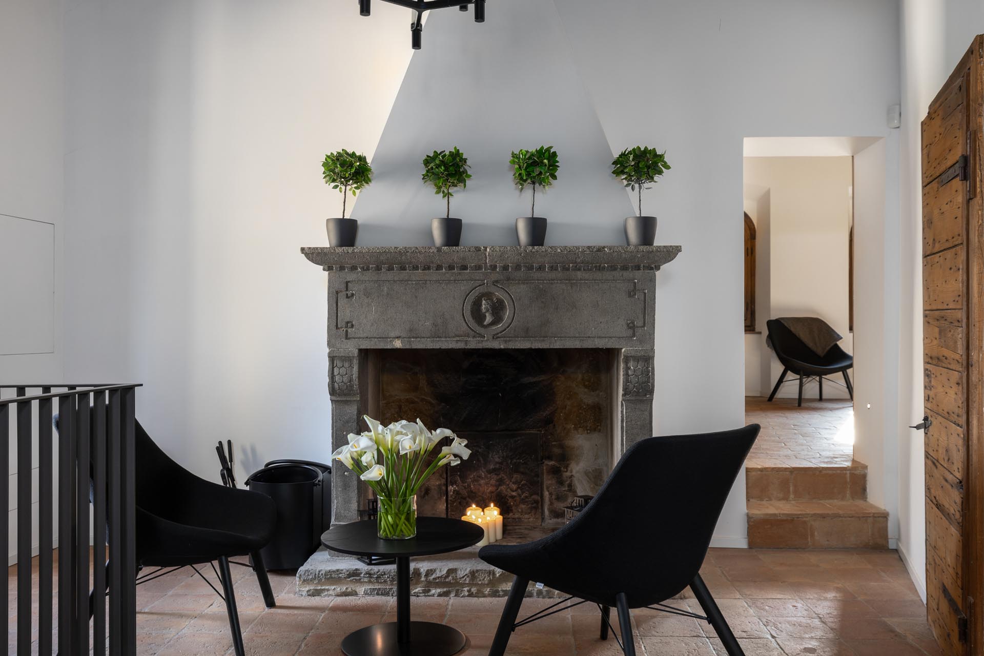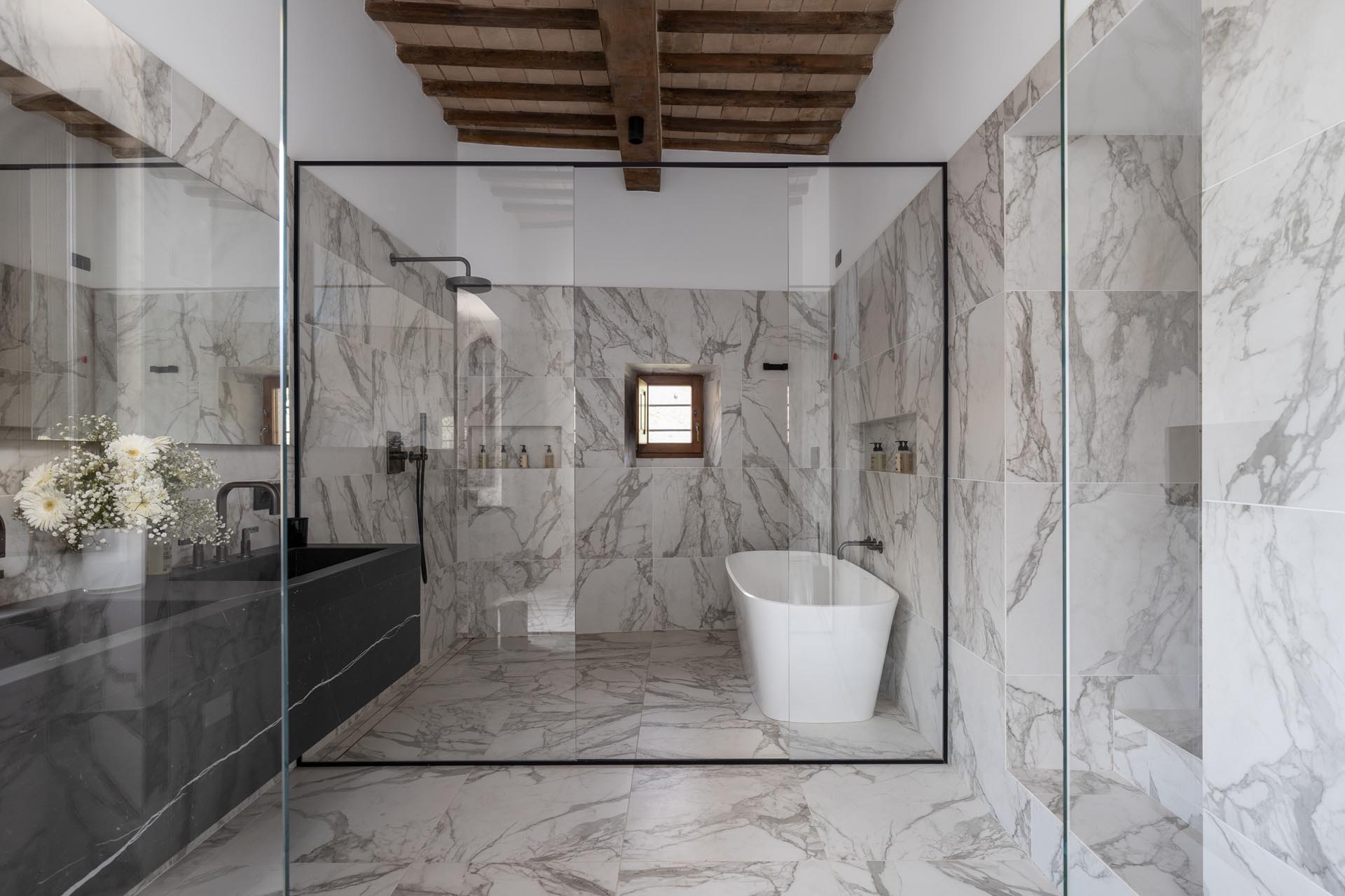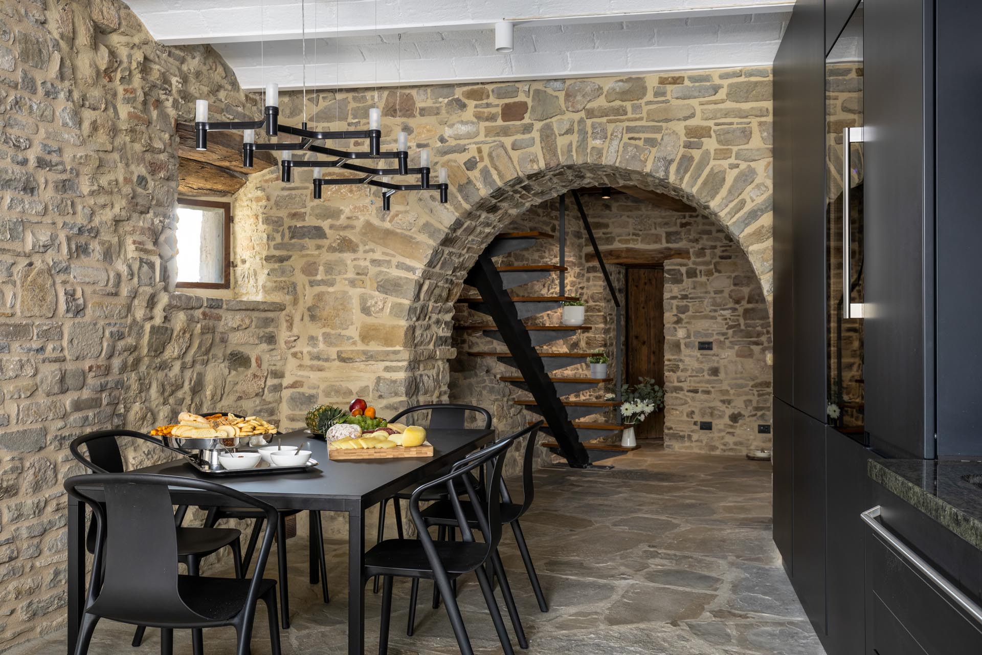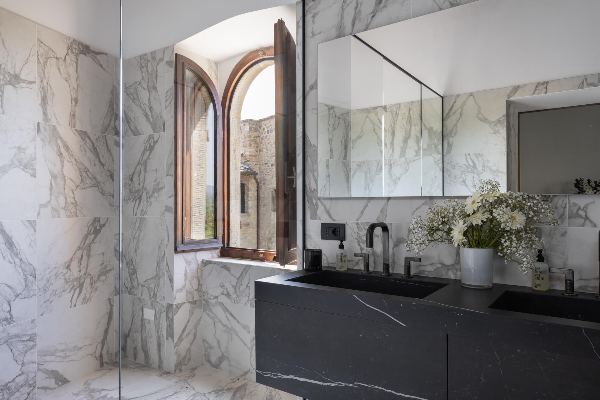 Centuries-old stones and original wooden beams have been thoughtfully integrated with wrought metal frames and fixtures, various marble types, colours, and modern fabrics.