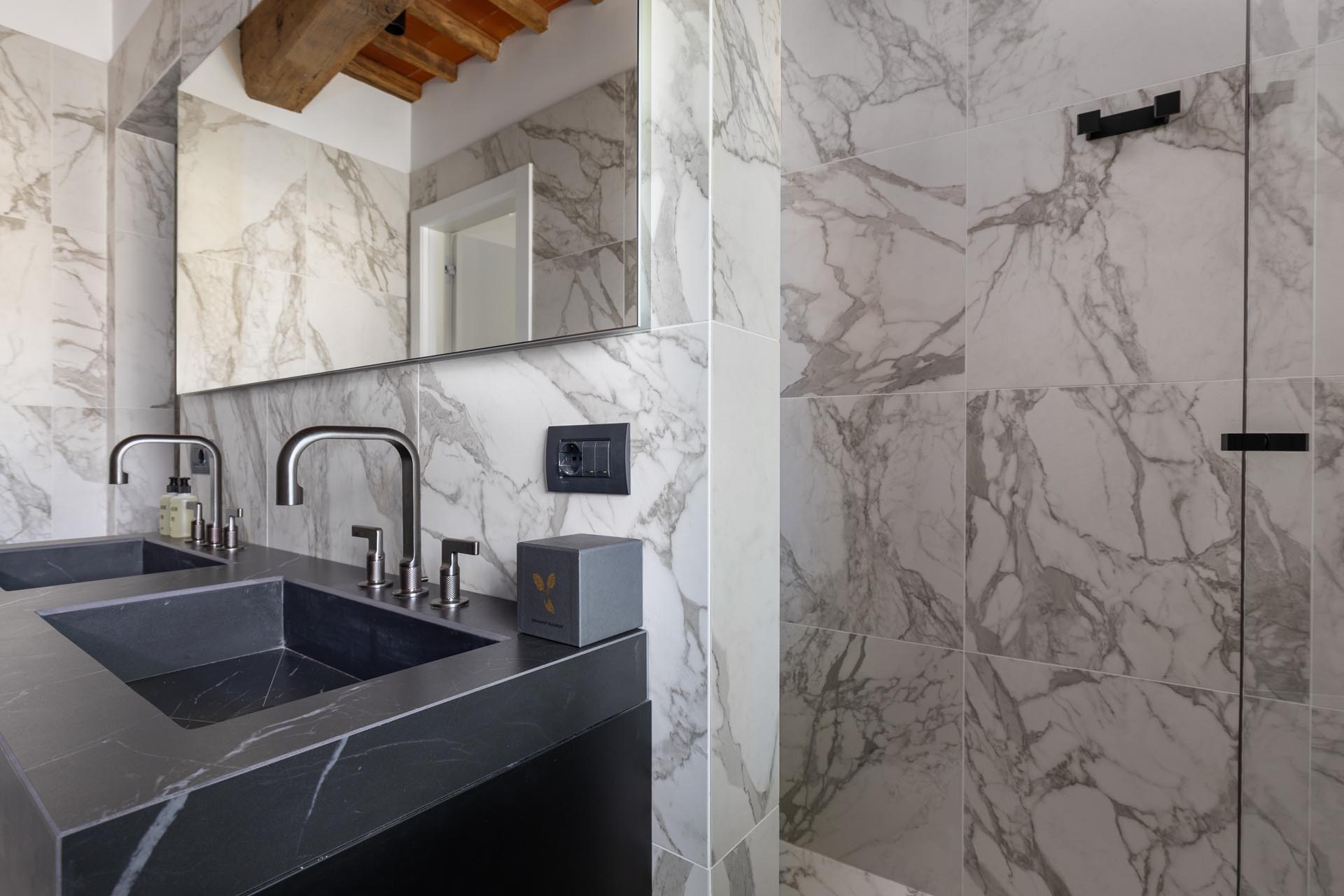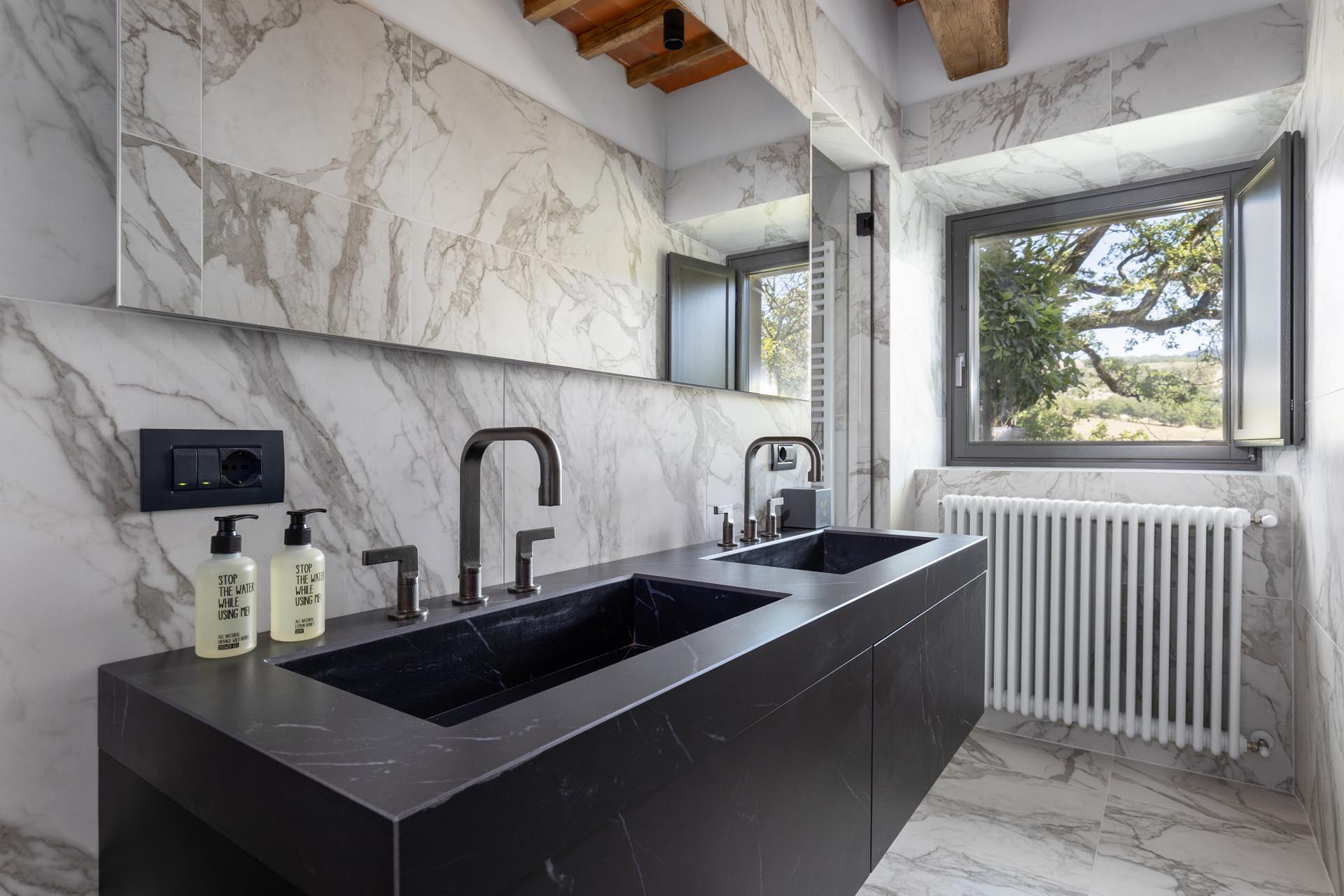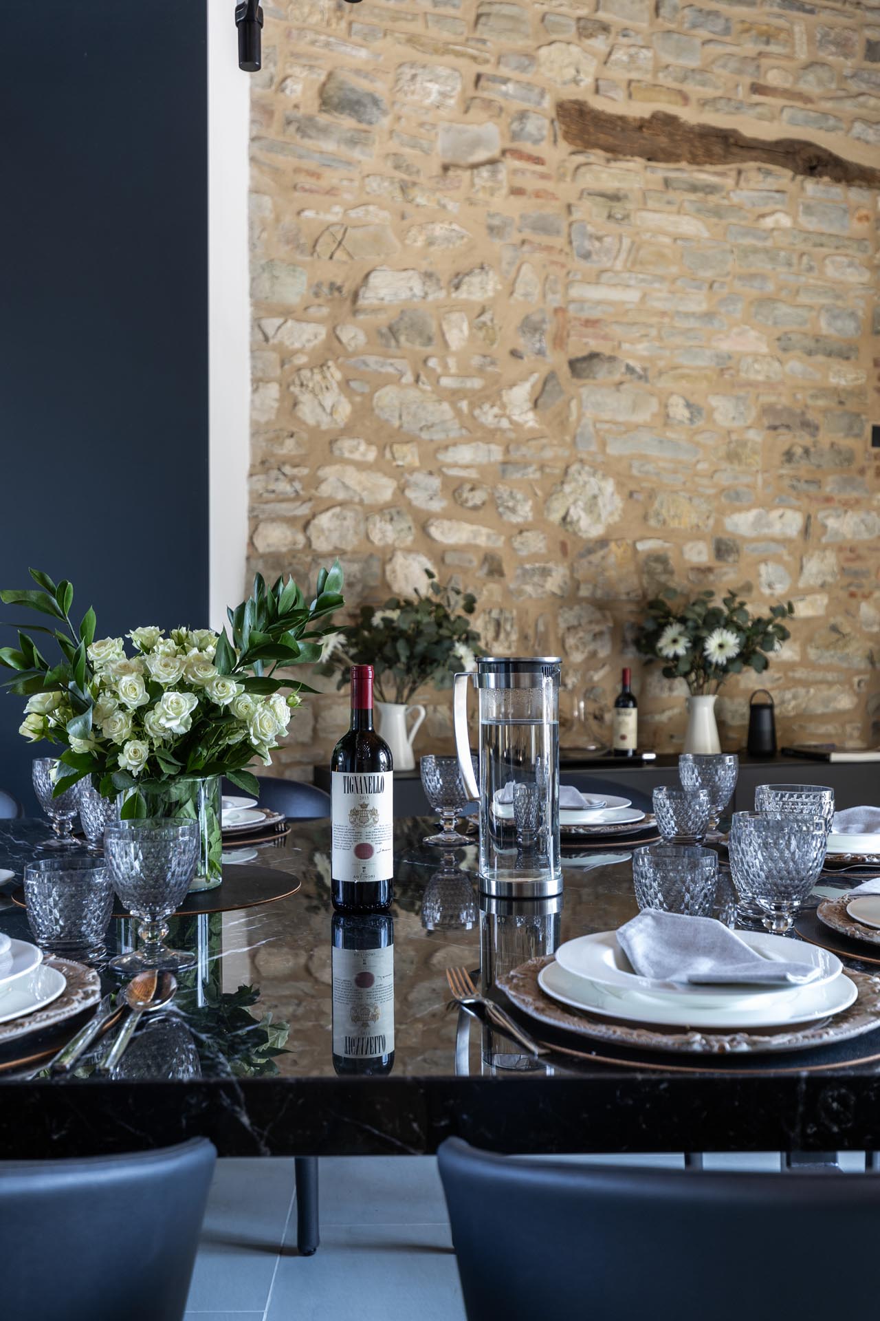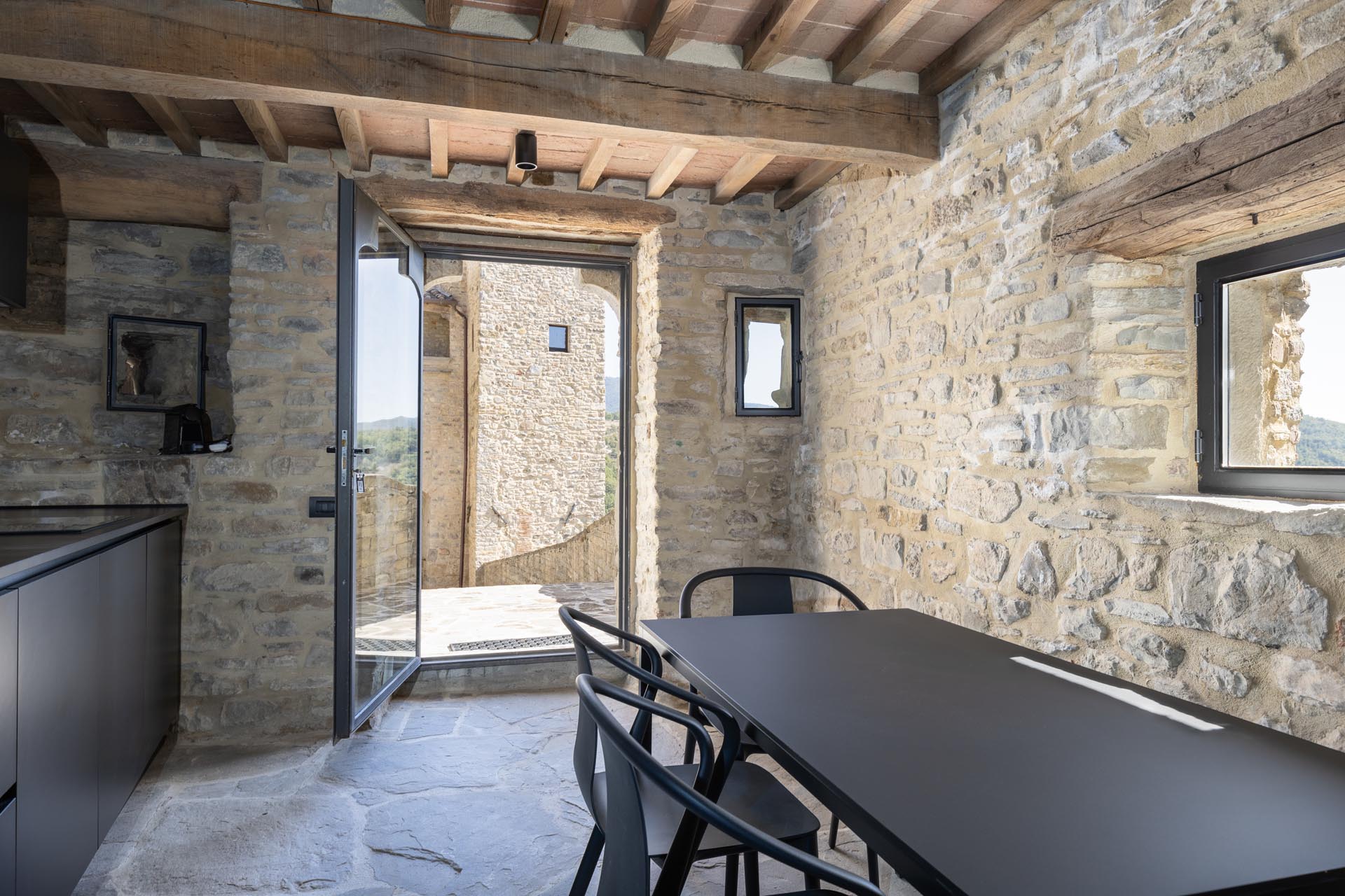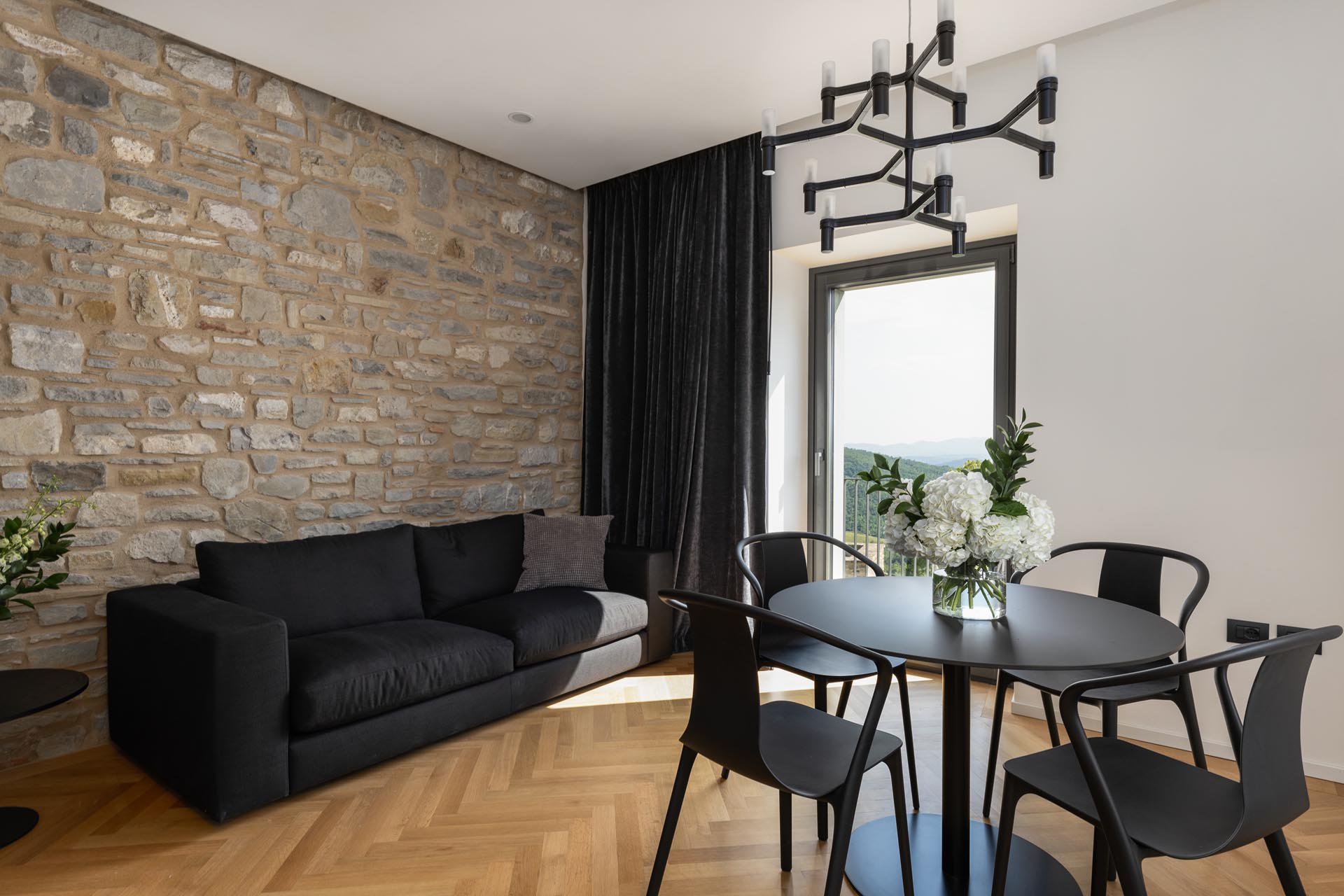 Centuries-old stones and original wooden beams have been thoughtfully integrated with wrought metal frames and fixtures, various marble types, colours, and modern fabrics.