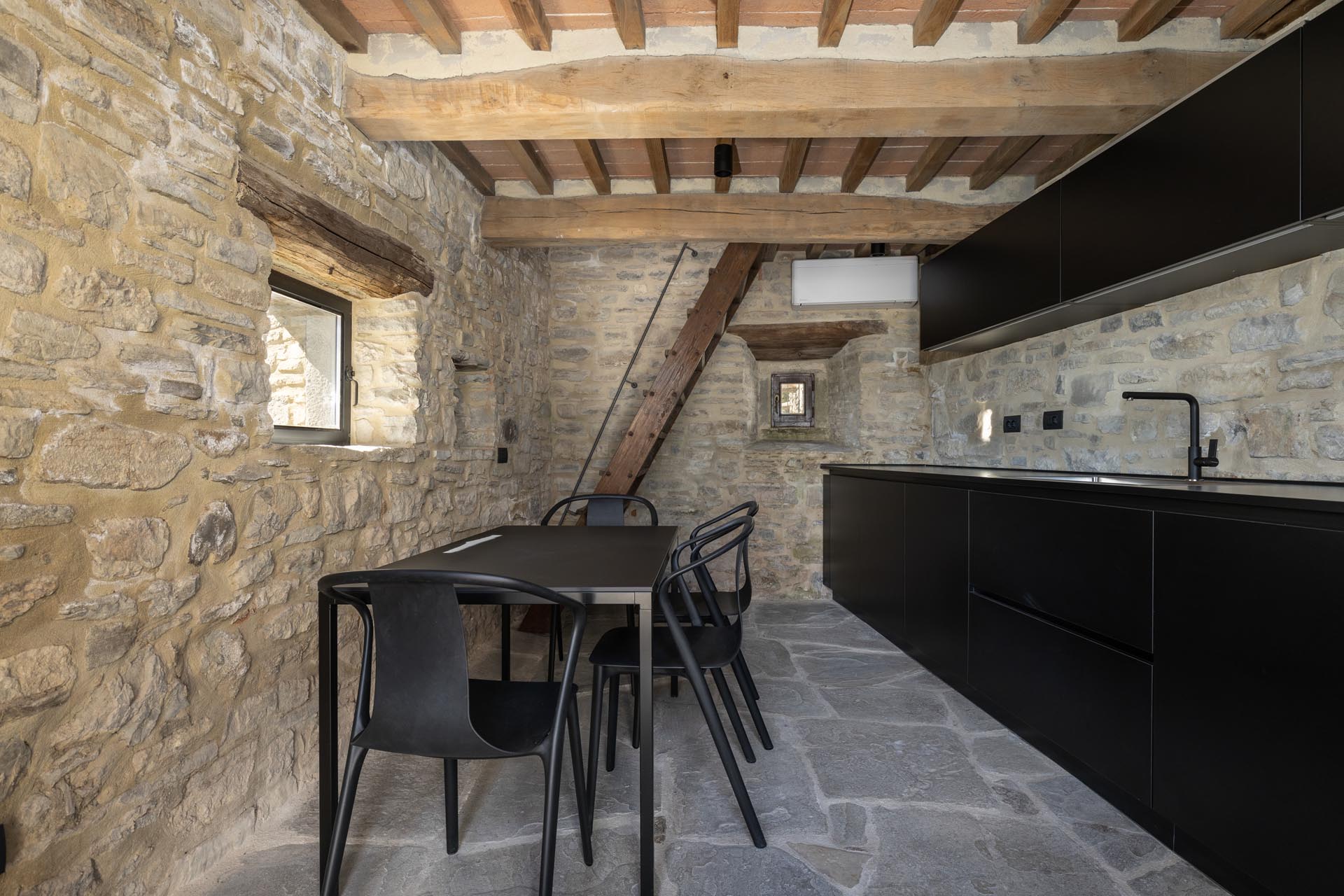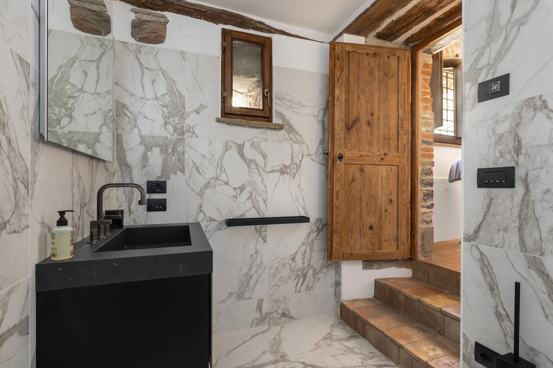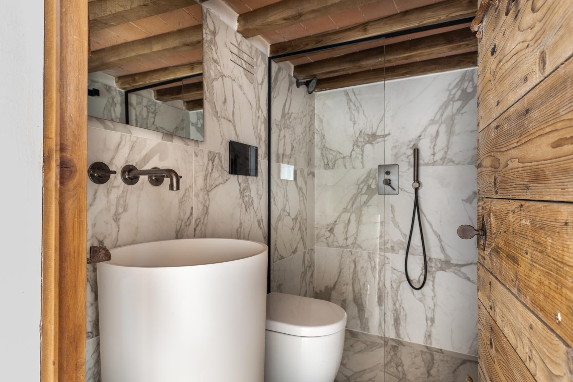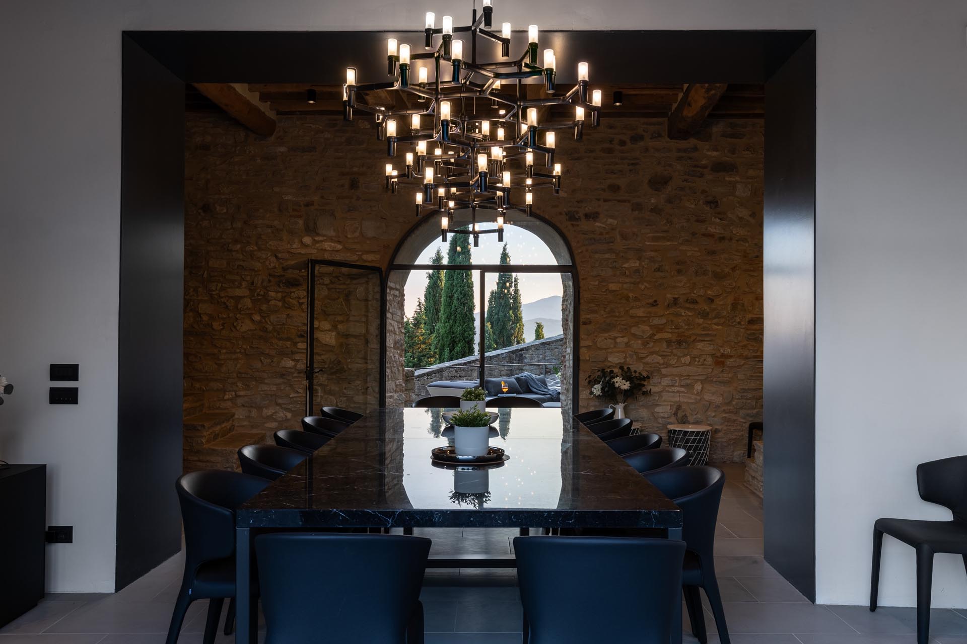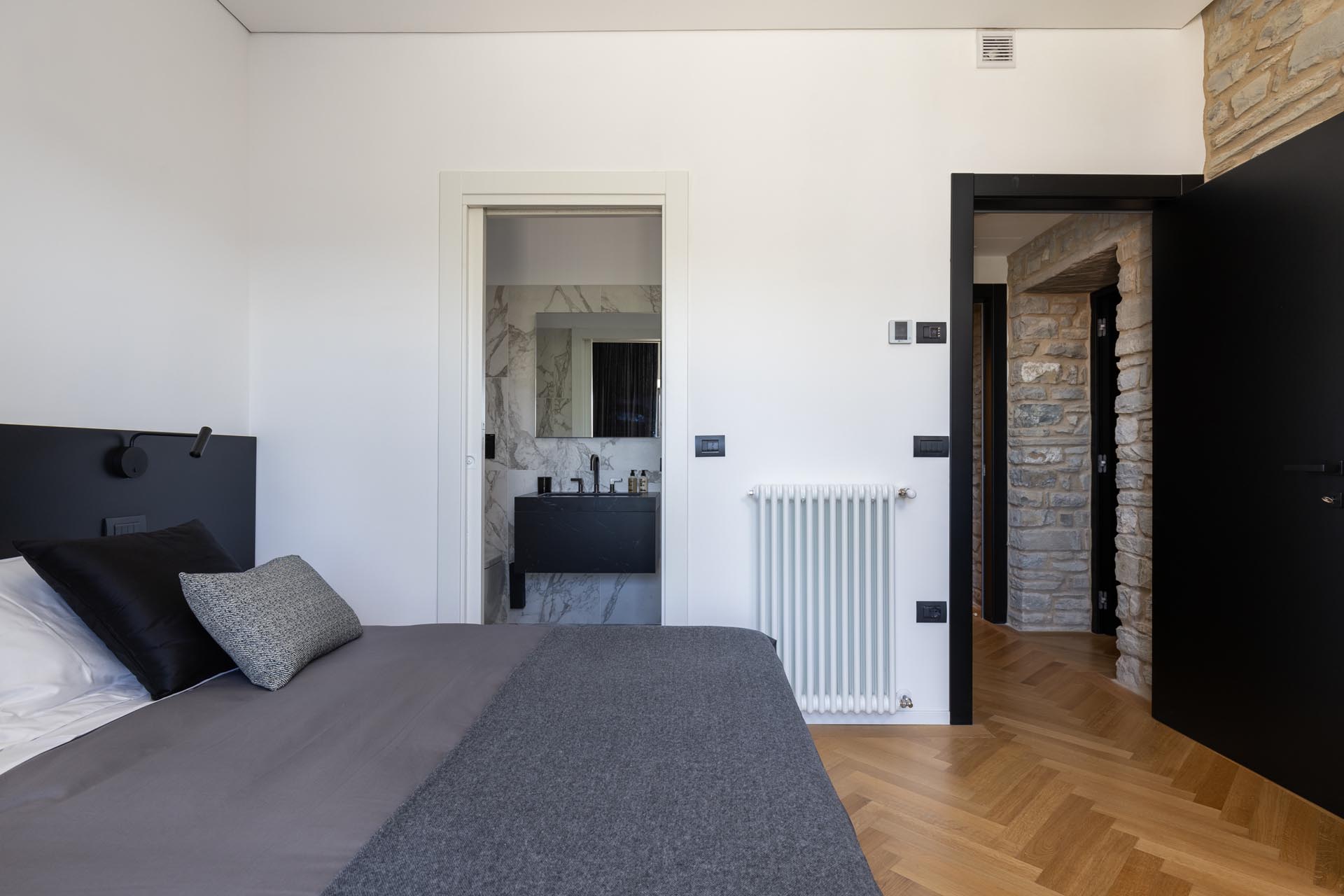 Centuries-old stones and original wooden beams have been thoughtfully integrated with wrought metal frames and fixtures, various marble types, colours, and modern fabrics.