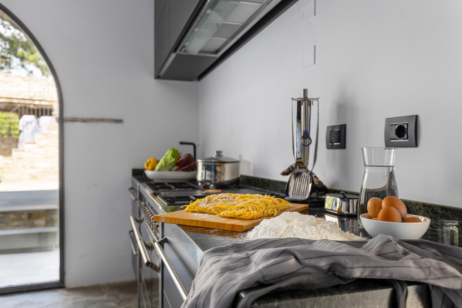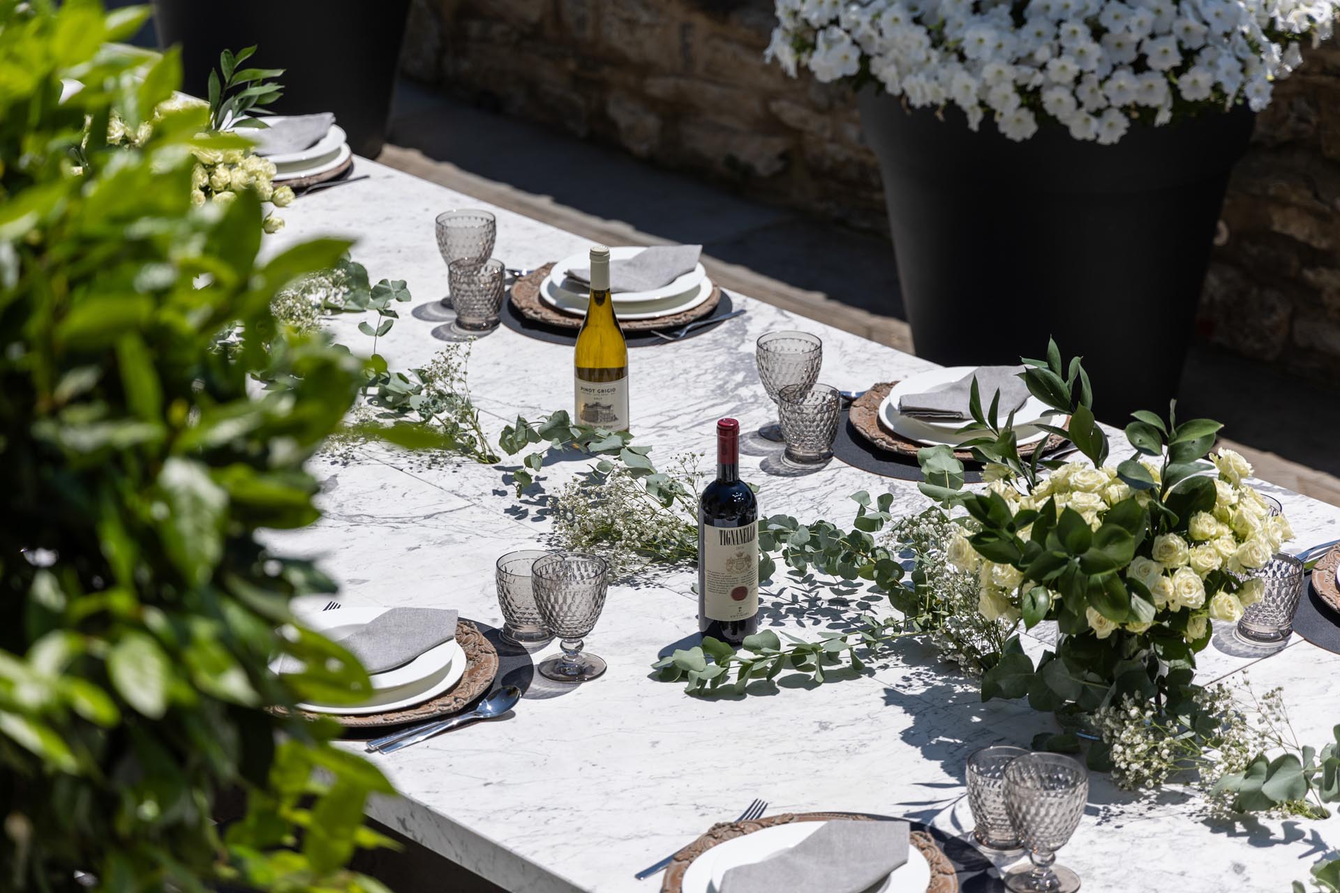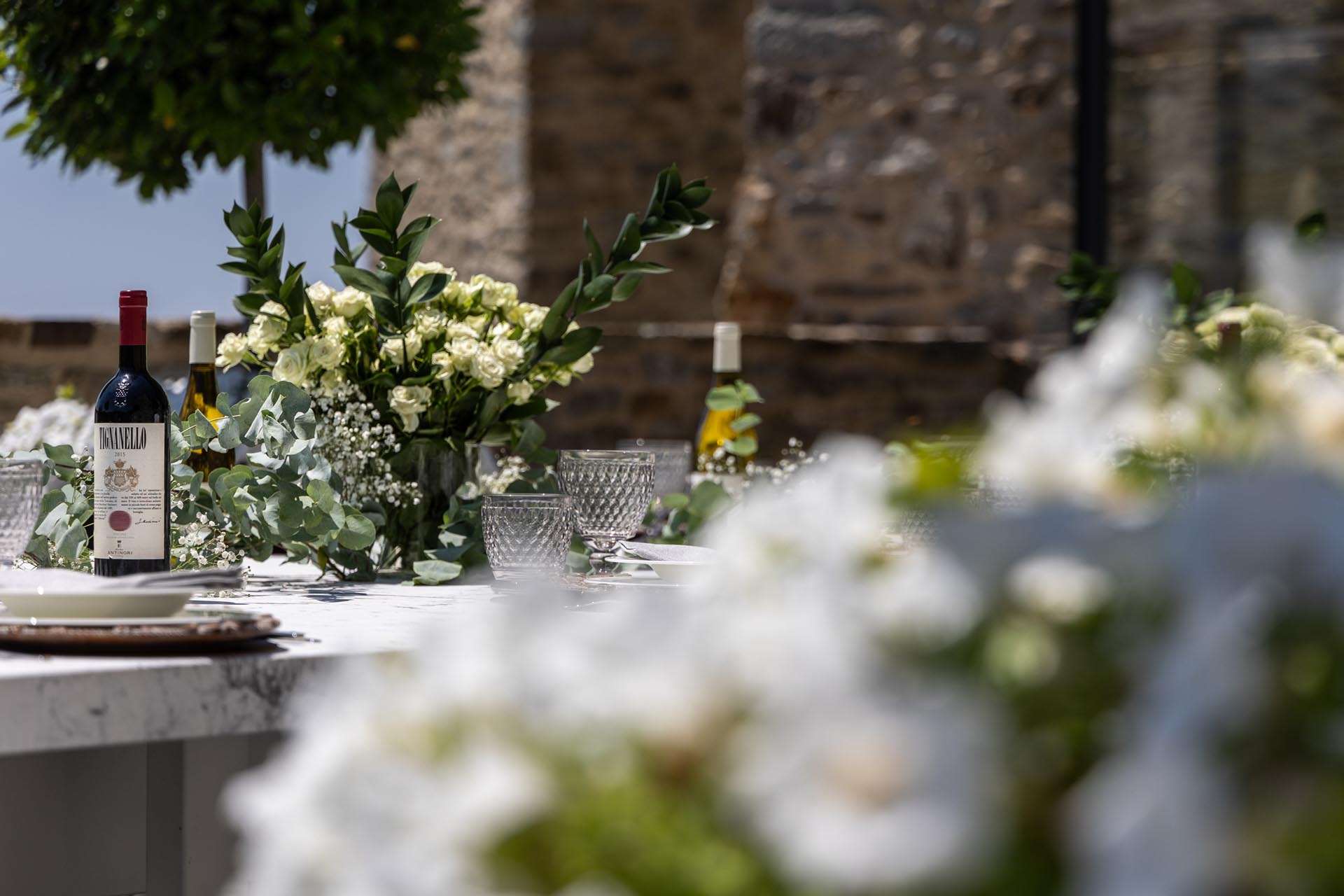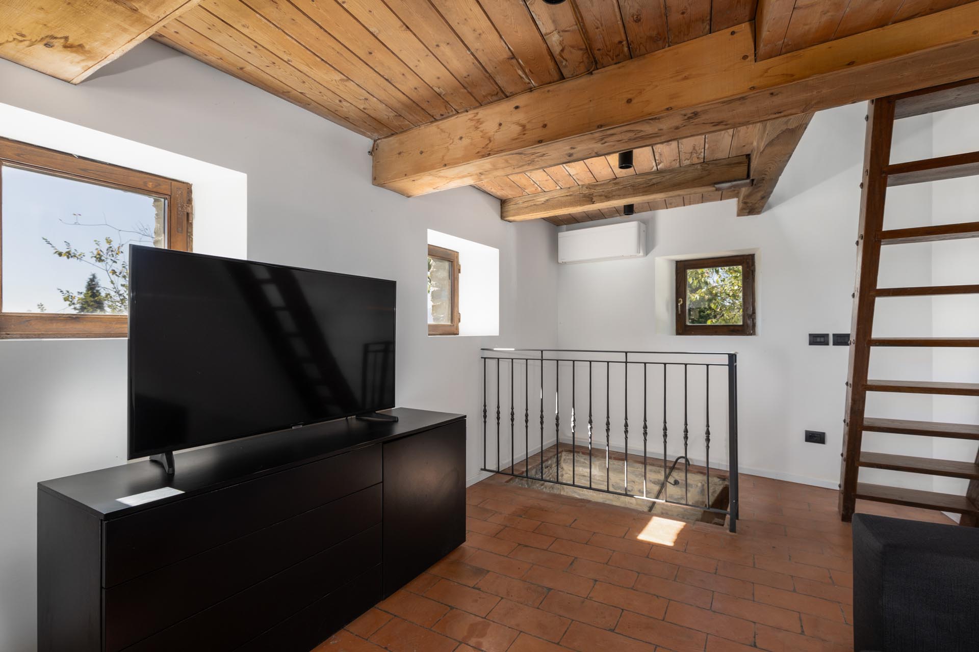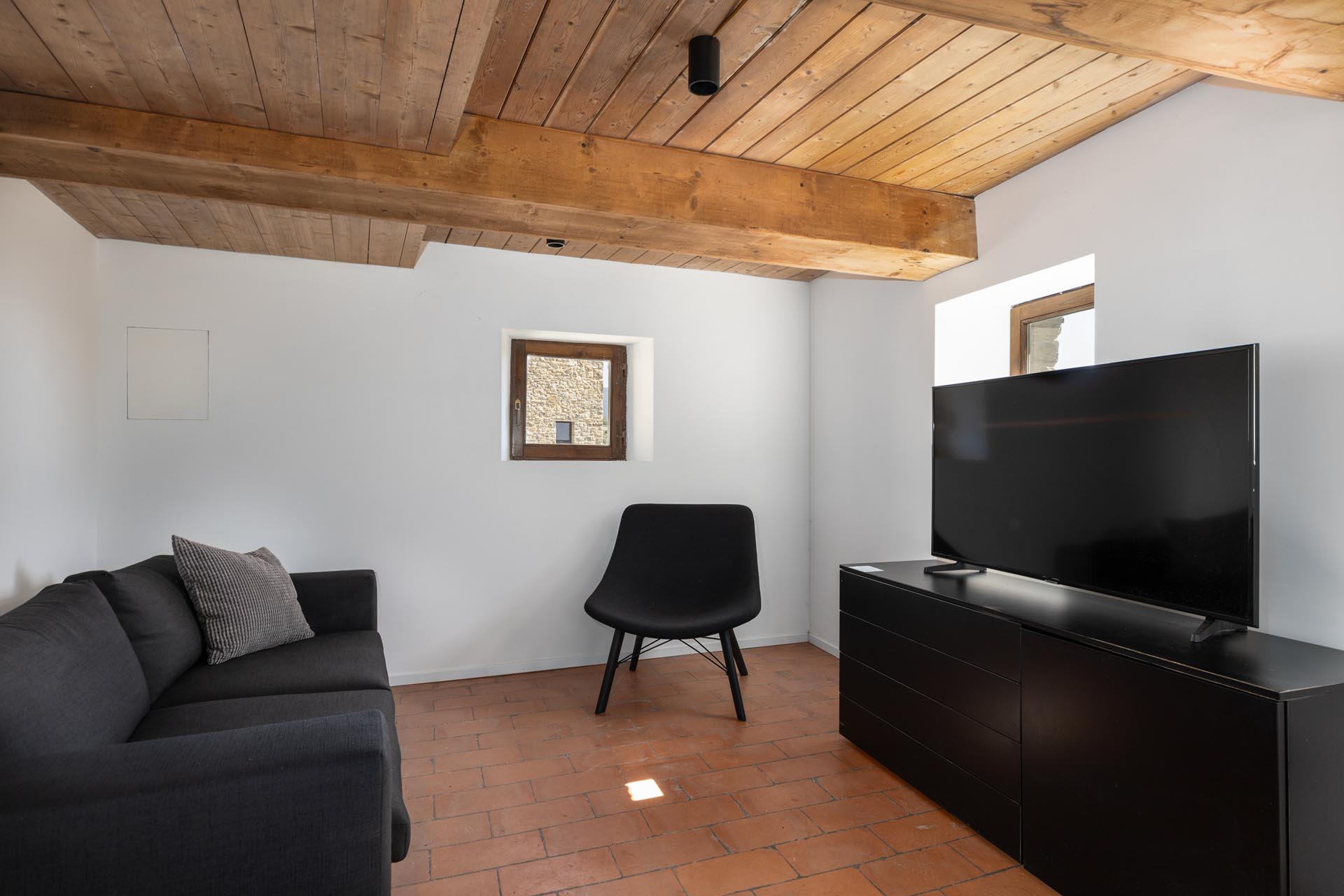 The castle, with its three structures (Castle, Church, House), combines authentic restoration with modern features. It includes a family chapel, a spacious living room with a wellequipped kitchen, laundry facilities, and a wine-tasting room. The Castle offers a large living area with a professional kitchen and an outdoor dining terrace, while the House area features a comfy media room with a sofa and TV.
