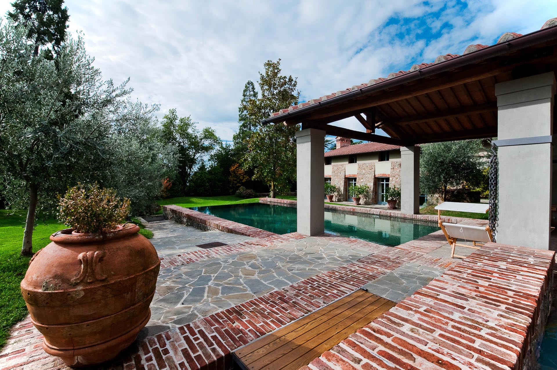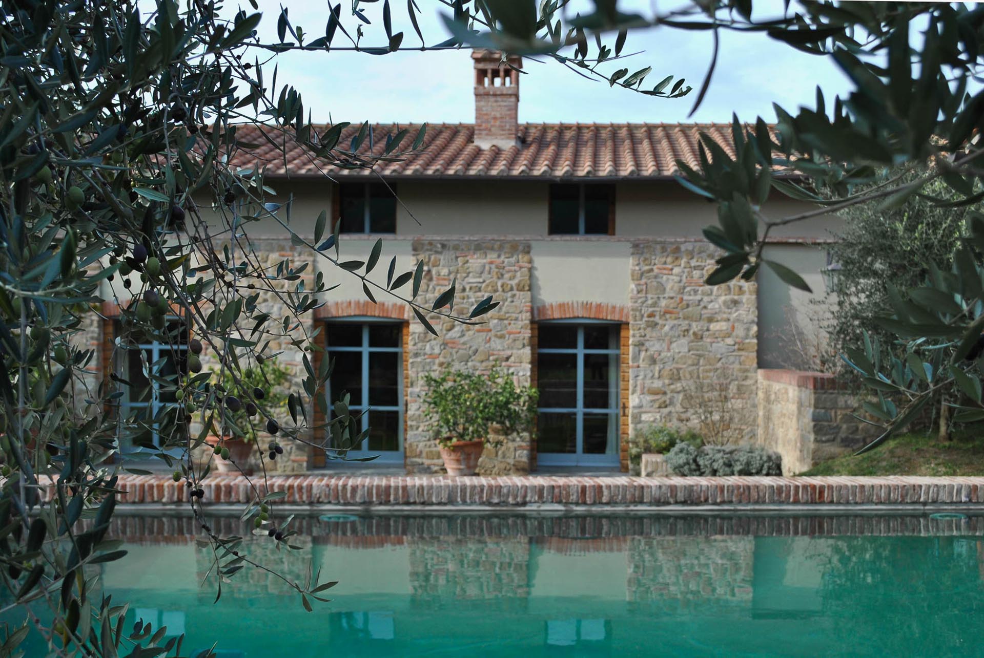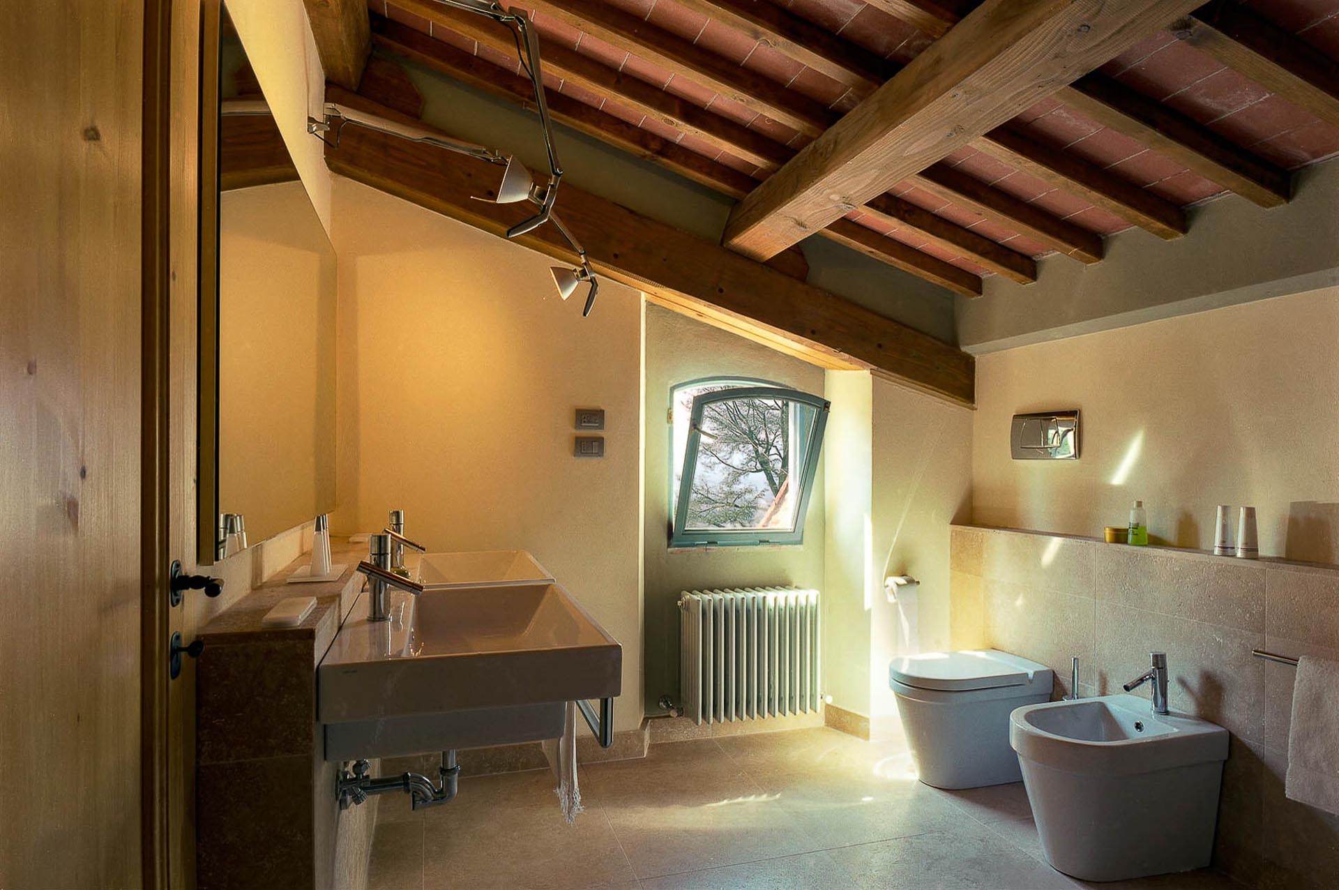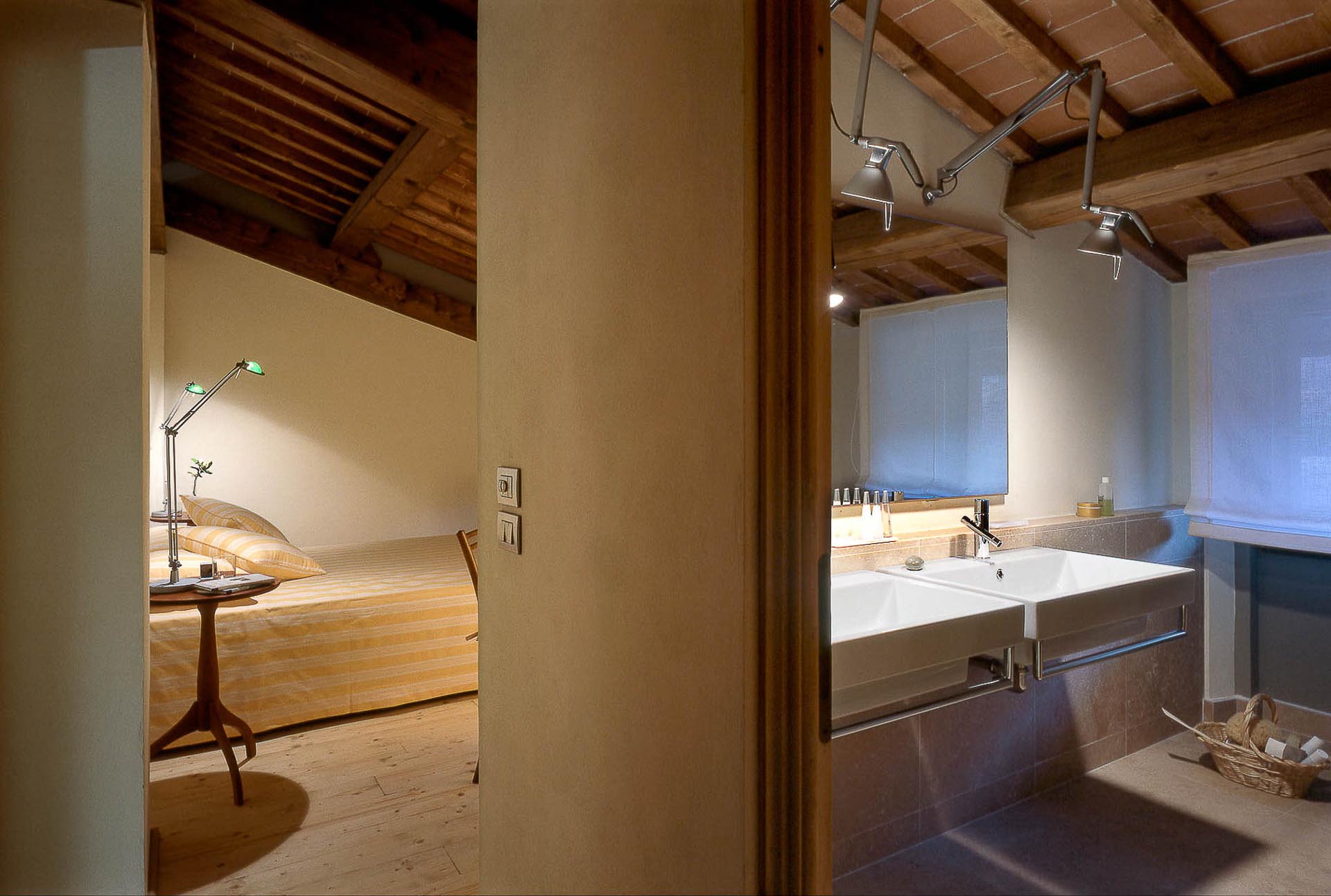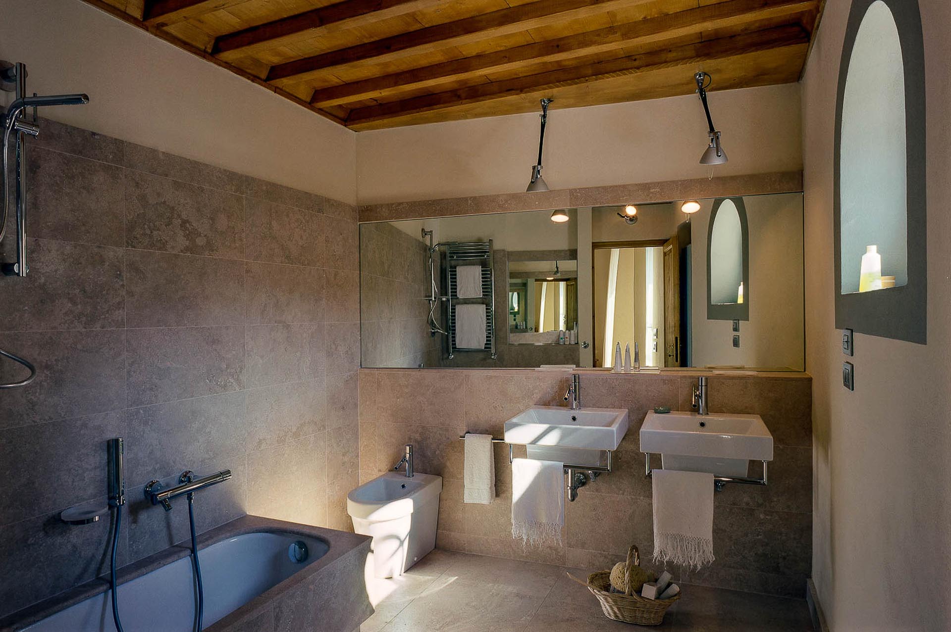 The interior design results from a classic yet renovated style with original handmade terracotta floor and woodbeamed ceilings. Elements of classic Italian architecture are combined with contemporary touches such as LED lights set in antique lamp holders, the steel kitchens in industrial style, the bathroom’s design inspired by the feeling of modern life. Materials, such as travertine marble, serene stone, and wood features have been sourced locally.