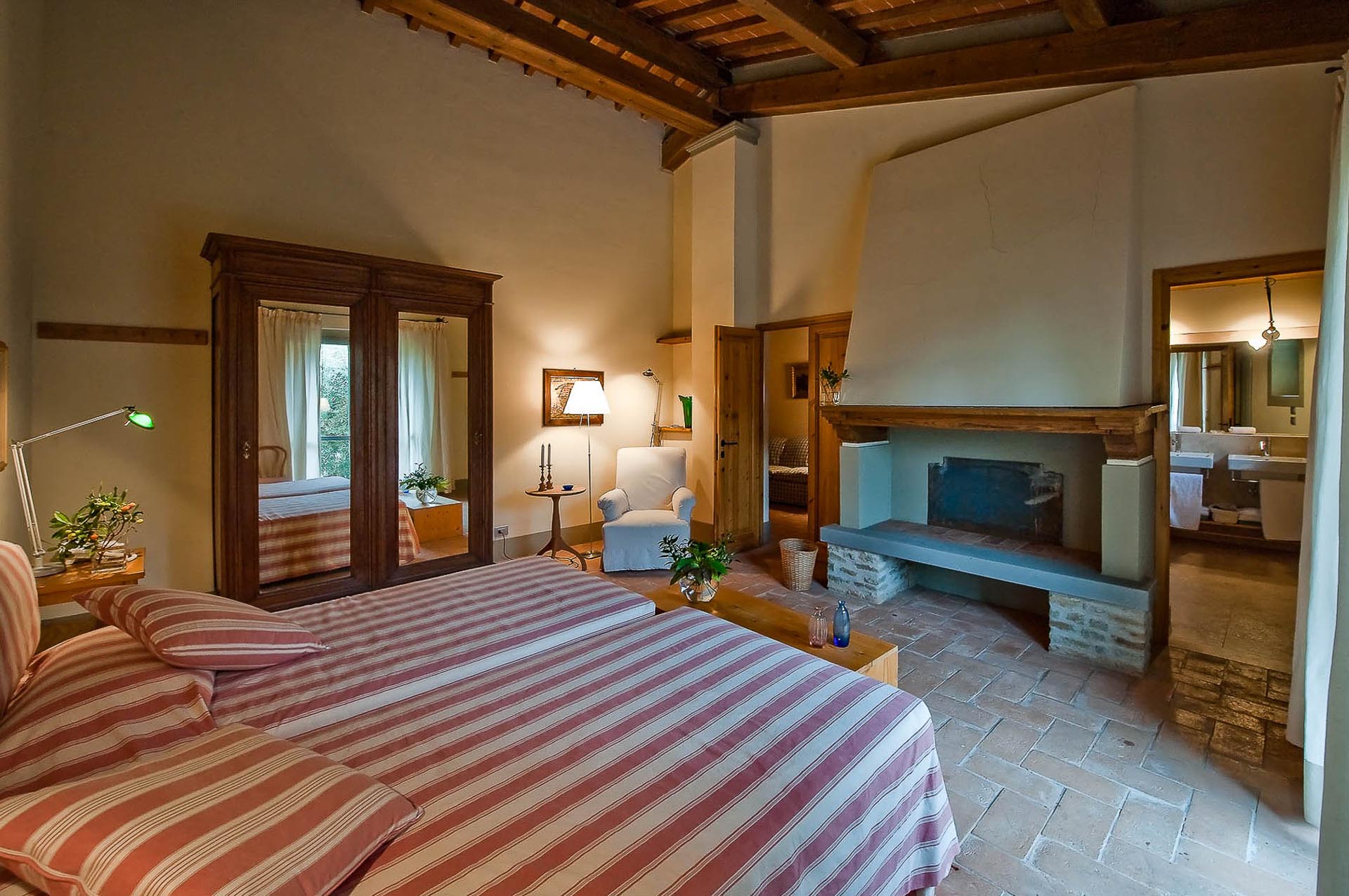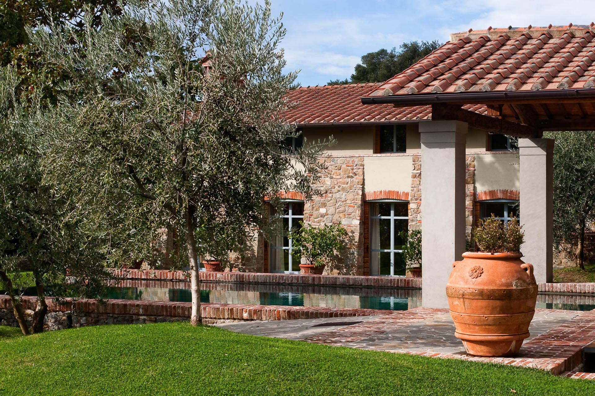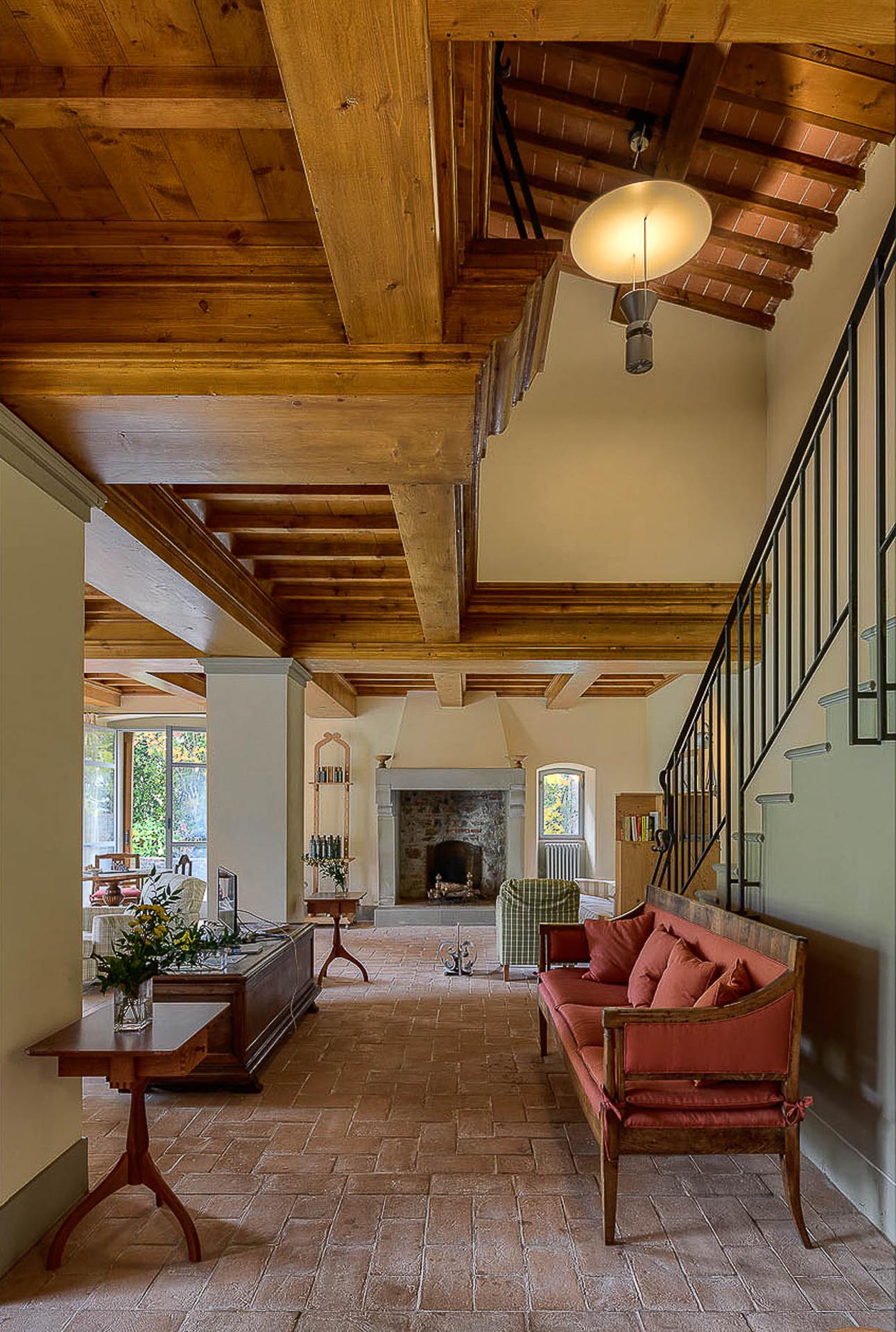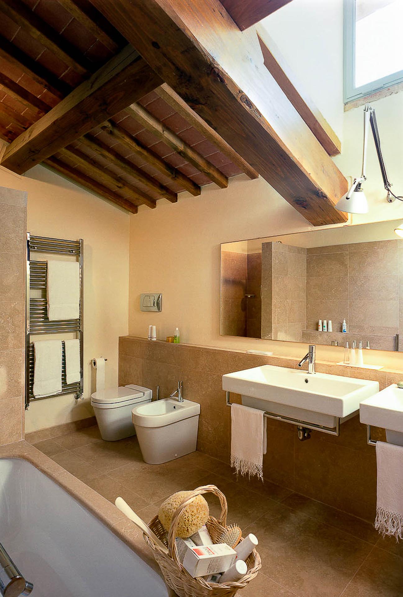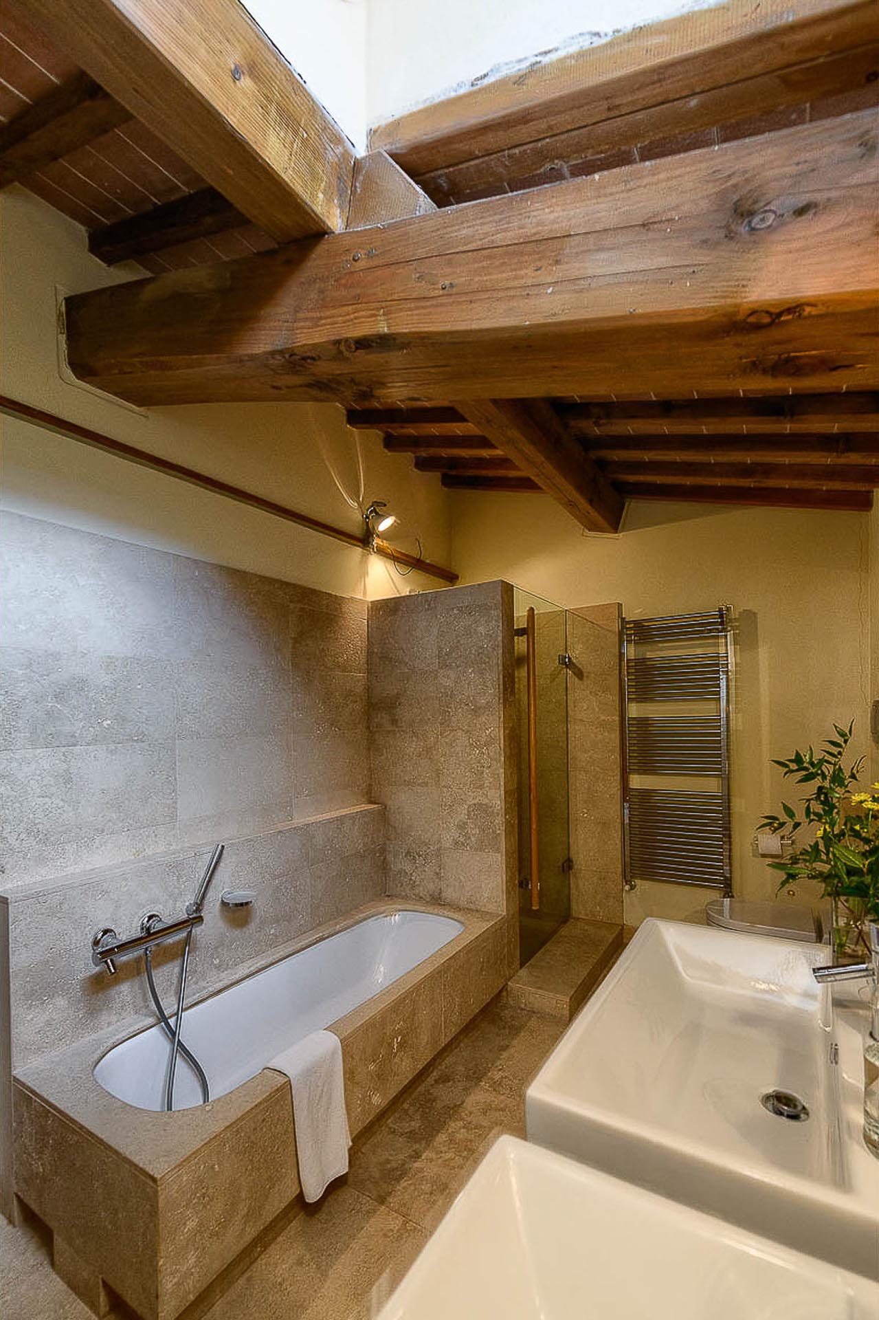 The interior design results from a classic yet renovated style with original handmade terracotta floor and woodbeamed ceilings. Elements of classic Italian architecture are combined with contemporary touches such as LED lights set in antique lamp holders, the steel kitchens in industrial style, the bathroom’s design inspired by the feeling of modern life. Materials, such as travertine marble, serene stone, and wood features have been sourced locally.