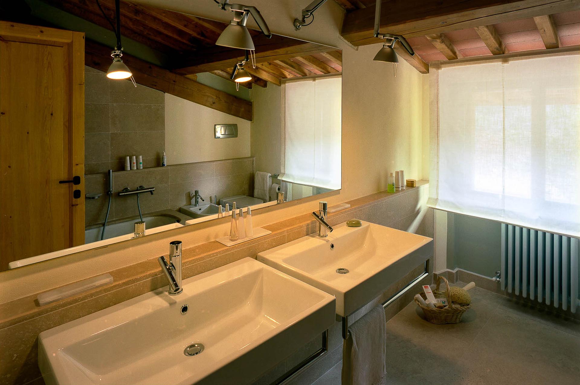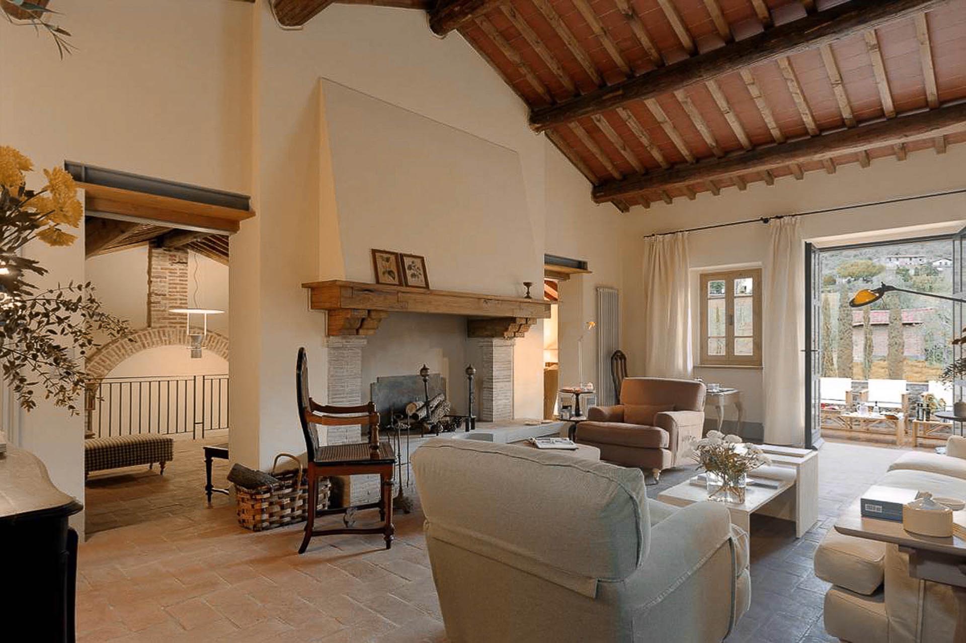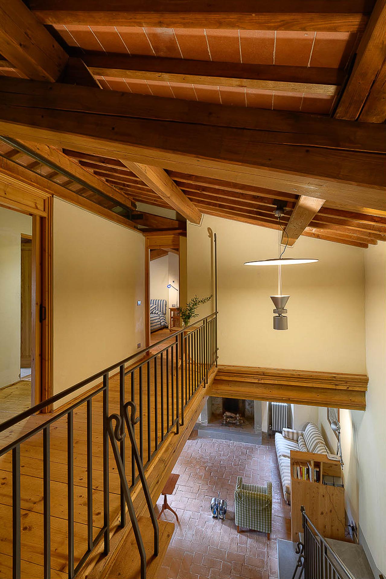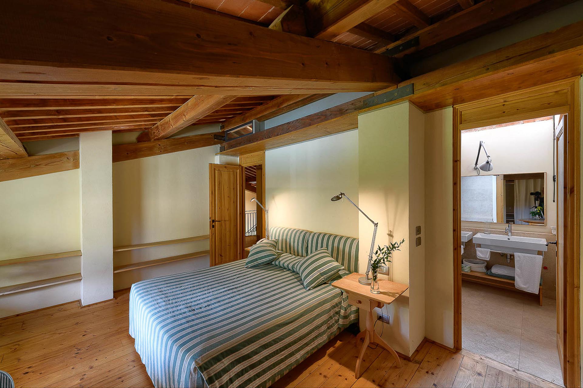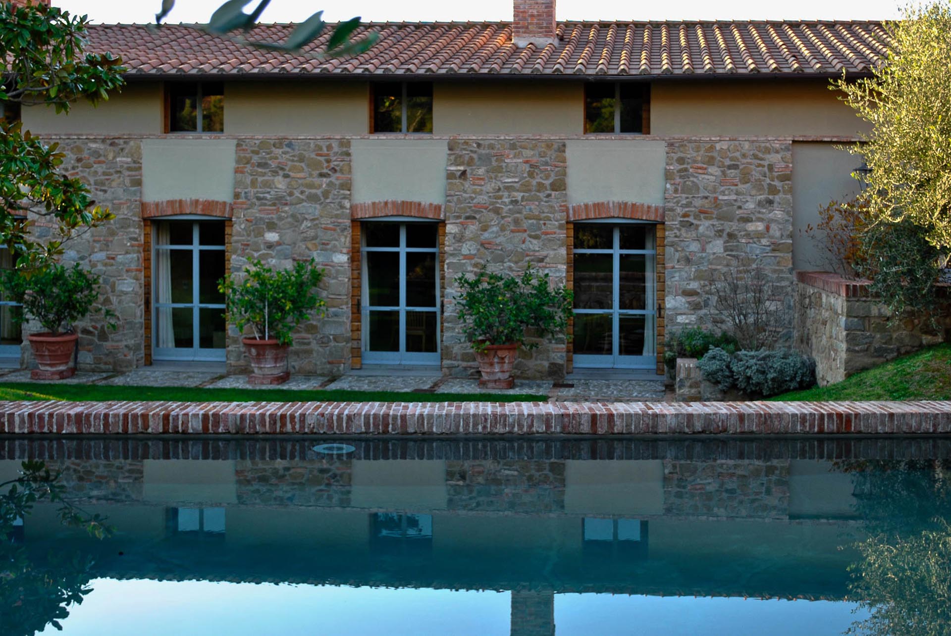 The interior design results from a classic yet renovated style with original handmade terracotta floor and woodbeamed ceilings. Elements of classic Italian architecture are combined with contemporary touches such as LED lights set in antique lamp holders, the steel kitchens in industrial style, the bathroom’s design inspired by the feeling of modern life. Materials, such as travertine marble, serene stone, and wood features have been sourced locally.