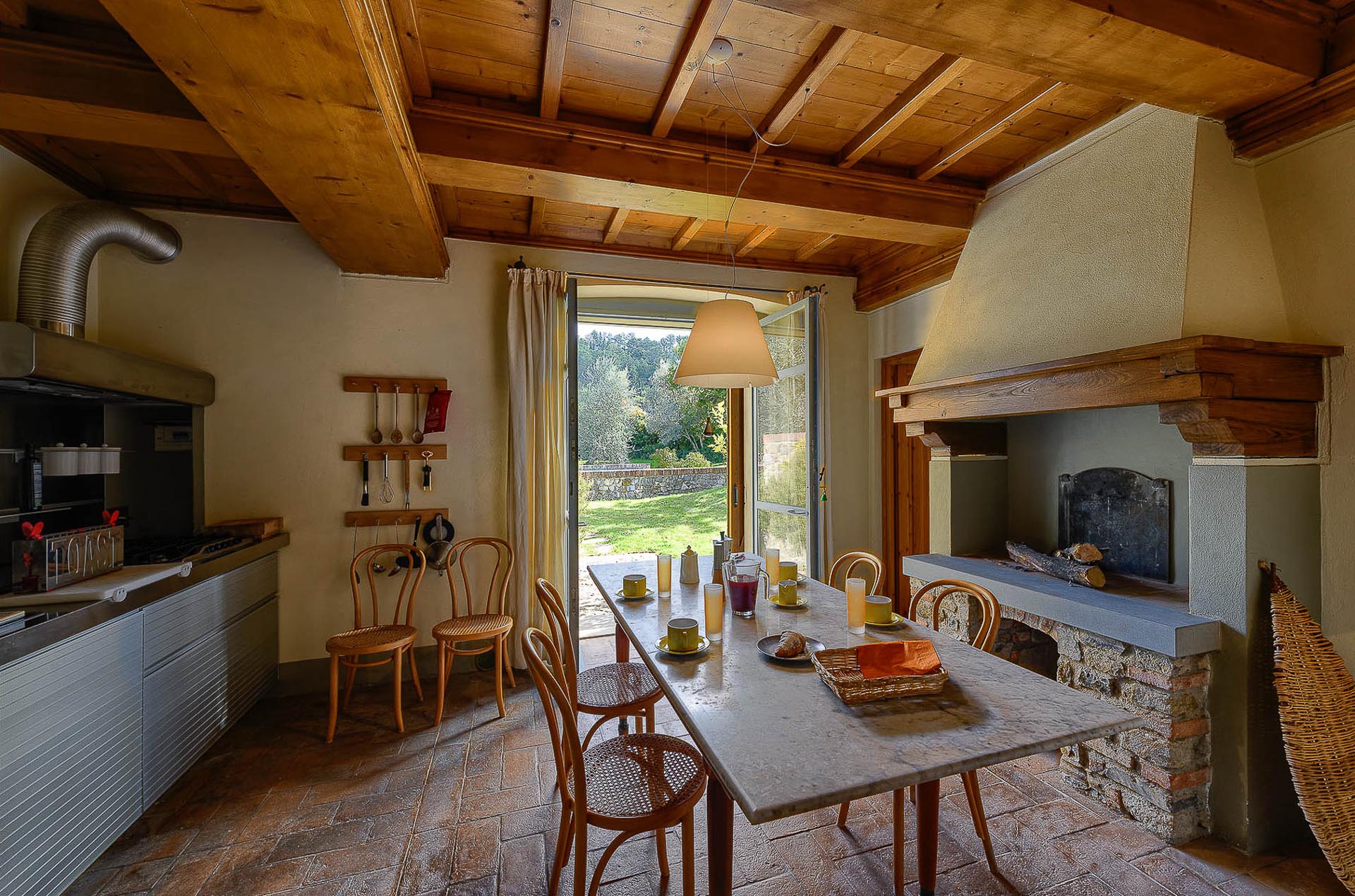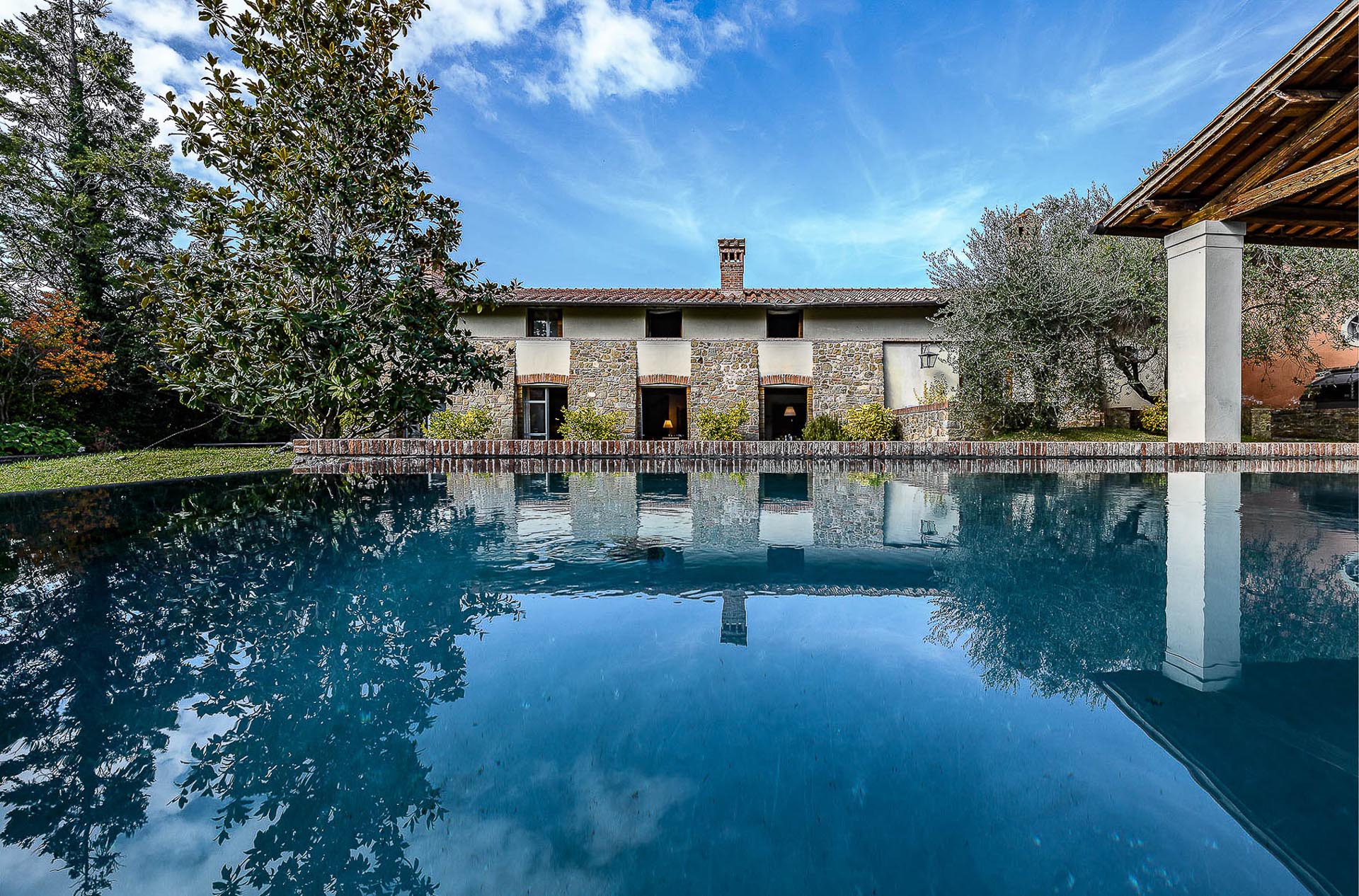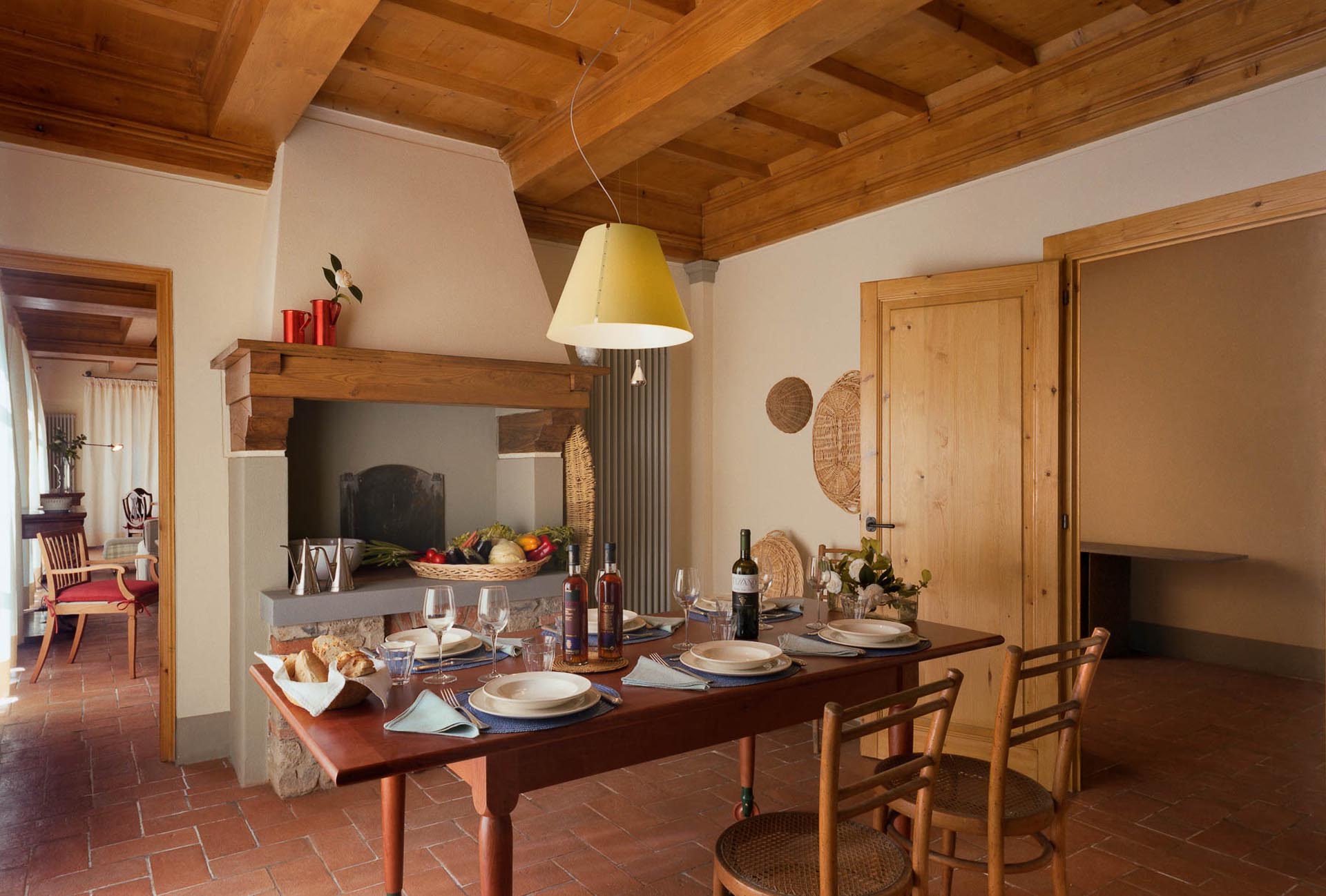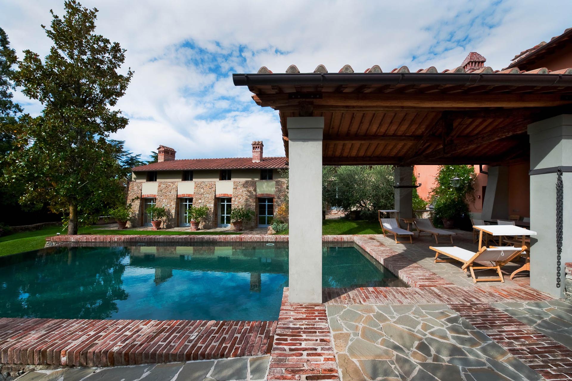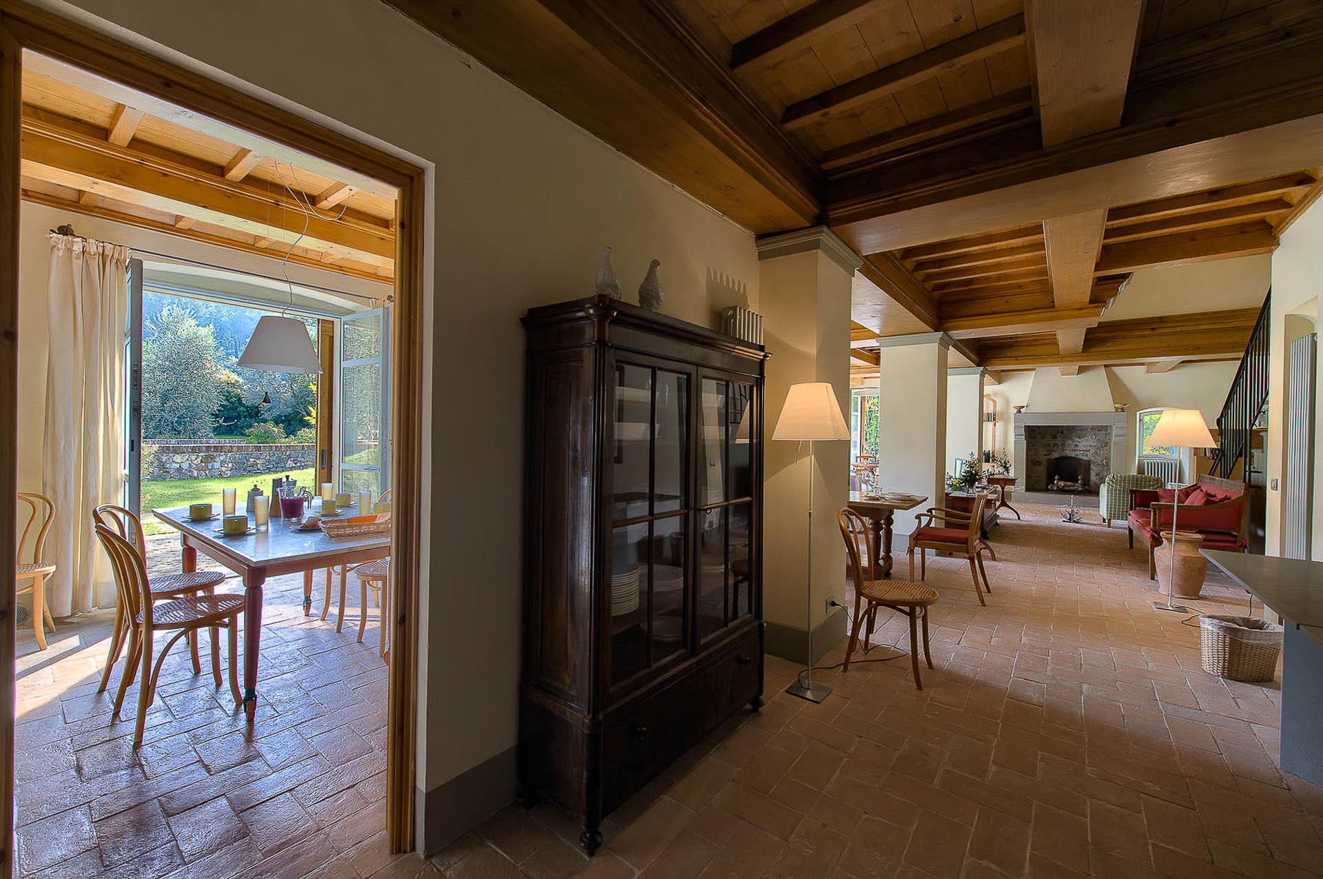 The interior design results from a classic yet renovated style with original handmade terracotta floor and woodbeamed ceilings. Elements of classic Italian architecture are combined with contemporary touches such as LED lights set in antique lamp holders, the steel kitchens in industrial style, the bathroom’s design inspired by the feeling of modern life. Materials, such as travertine marble, serene stone, and wood features have been sourced locally.