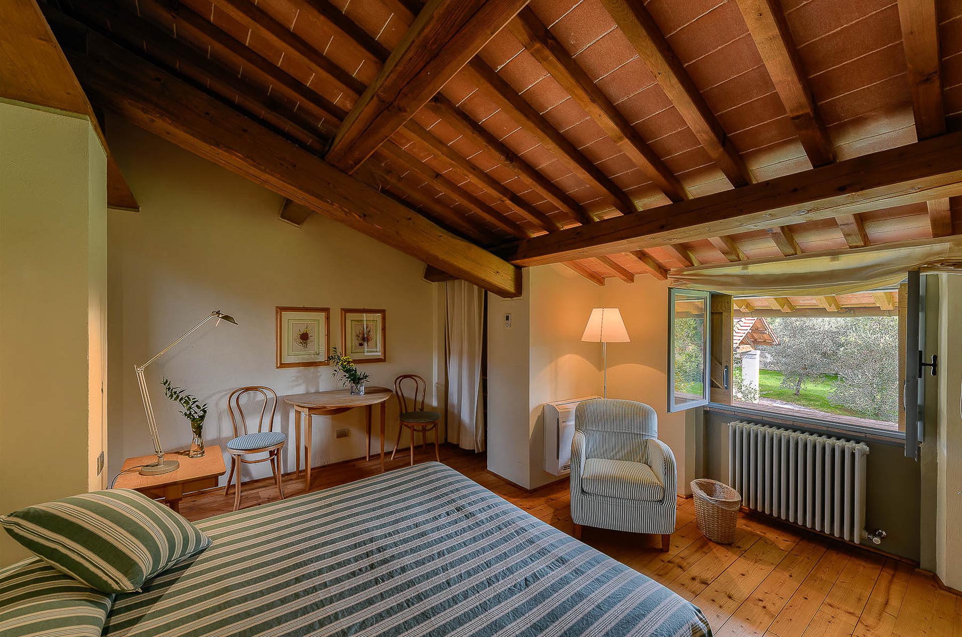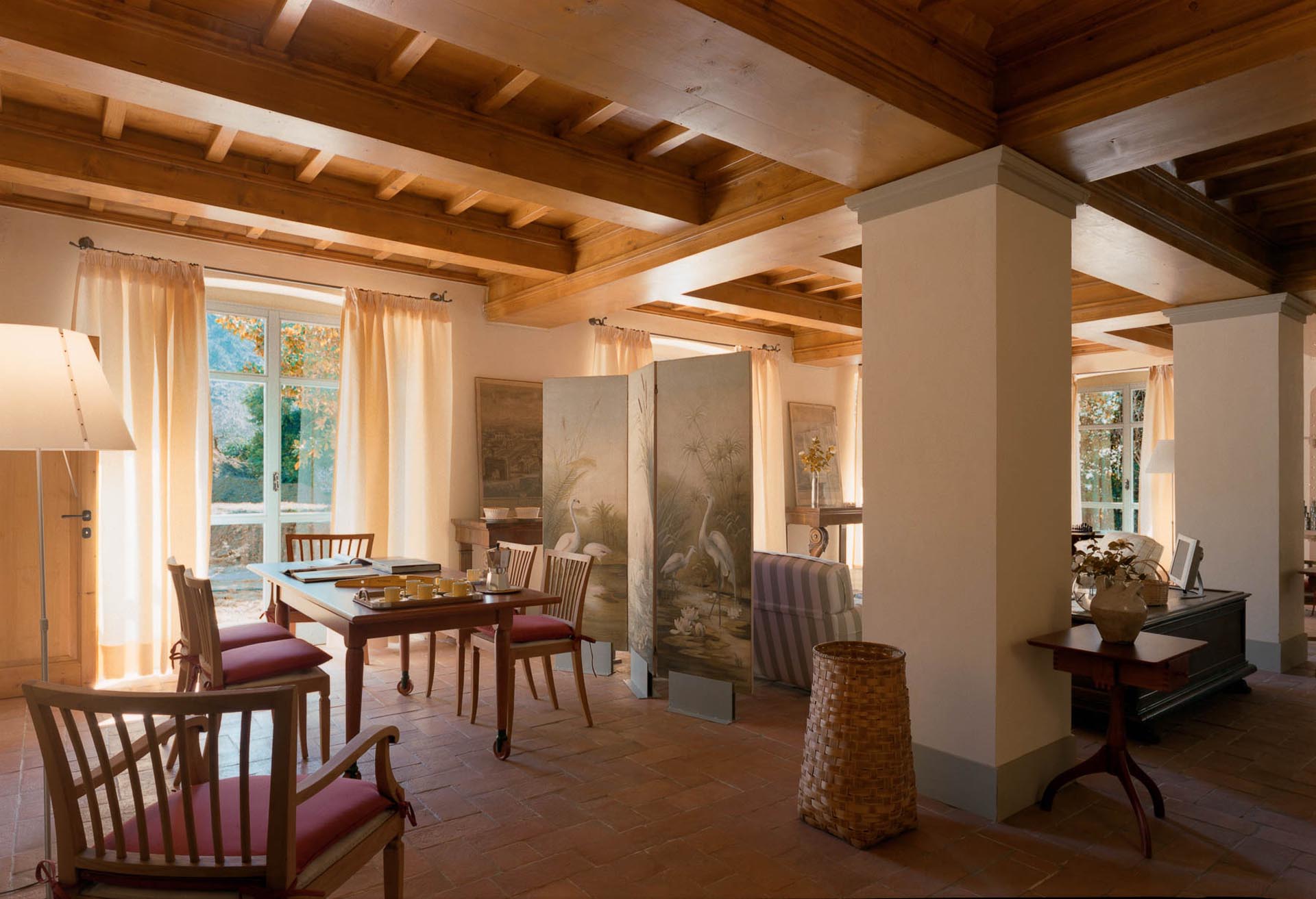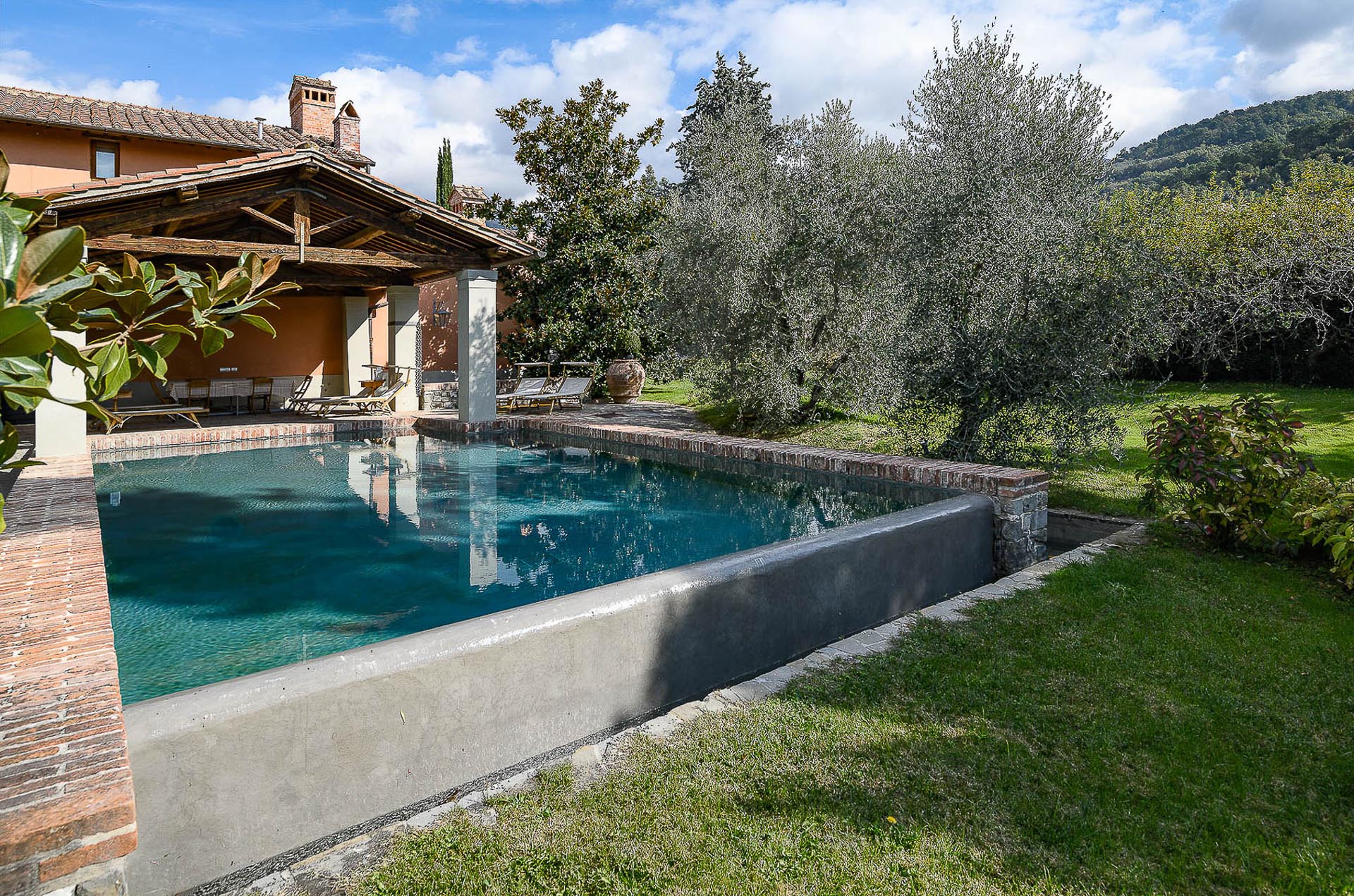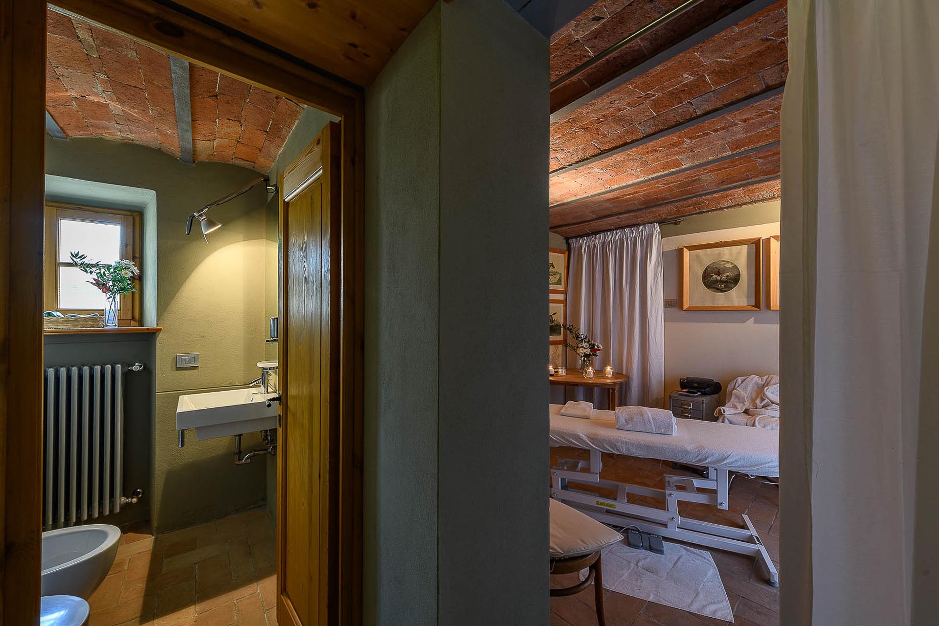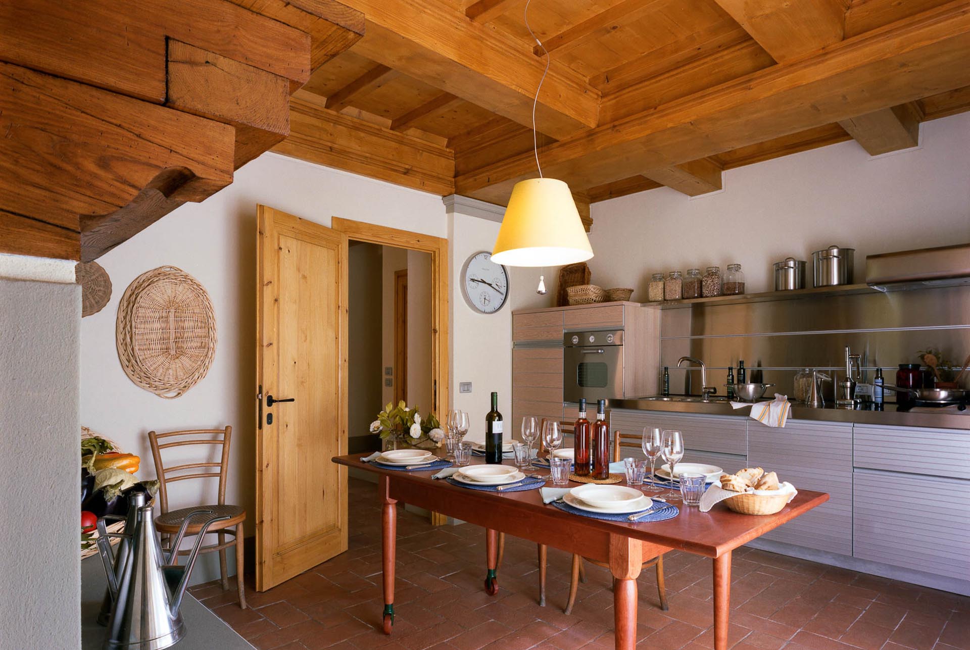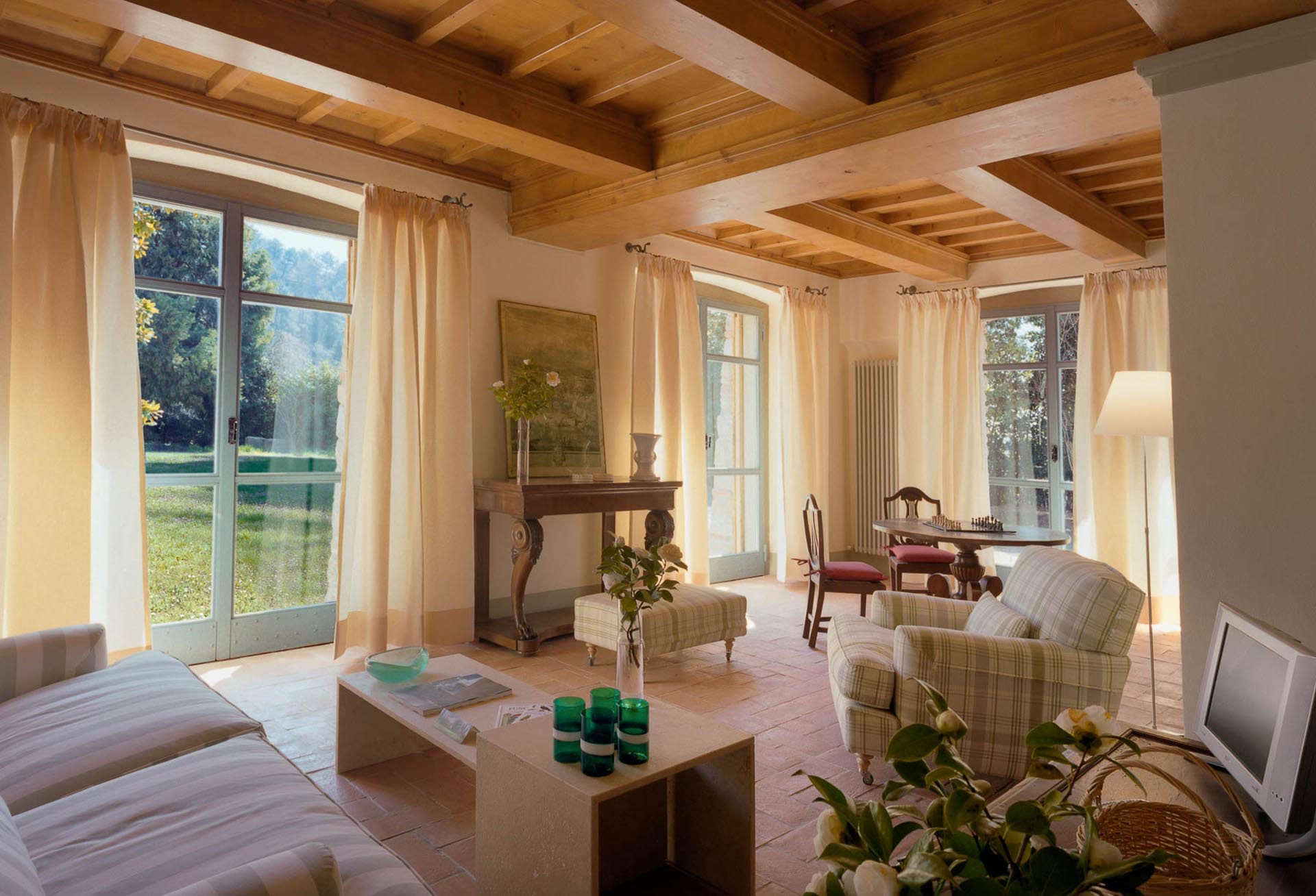 The interior design results from a classic yet renovated style with original handmade terracotta floor and woodbeamed ceilings. Elements of classic Italian architecture are combined with contemporary touches such as LED lights set in antique lamp holders, the steel kitchens in industrial style, the bathroom’s design inspired by the feeling of modern life. Materials, such as travertine marble, serene stone, and wood features have been sourced locally.