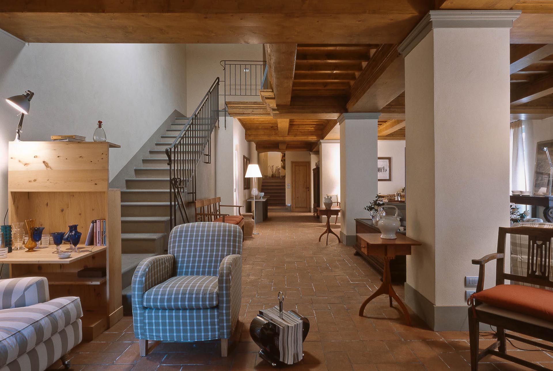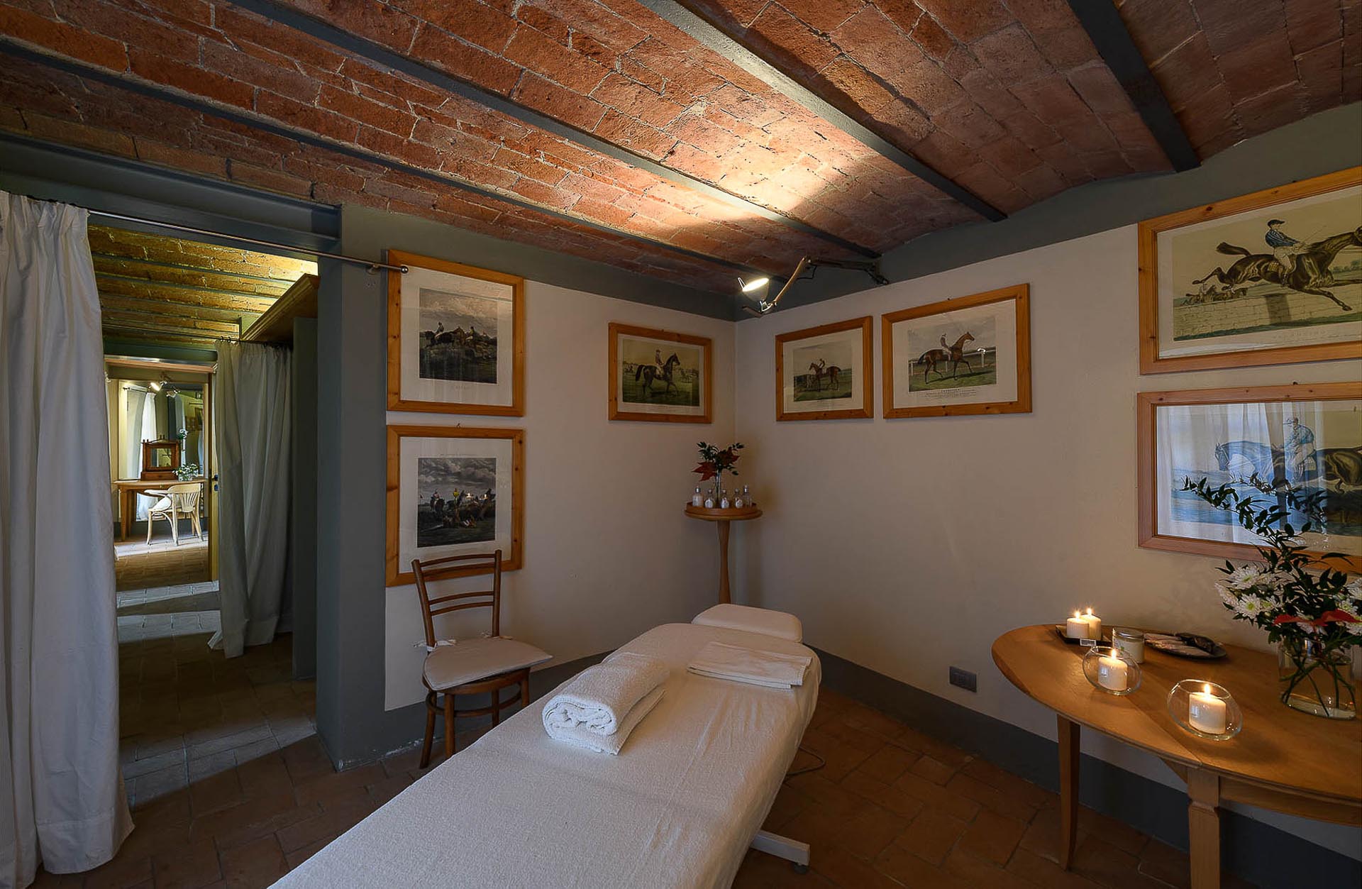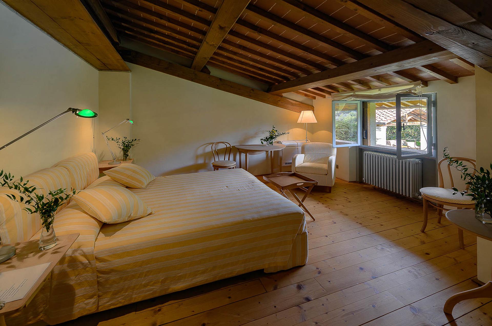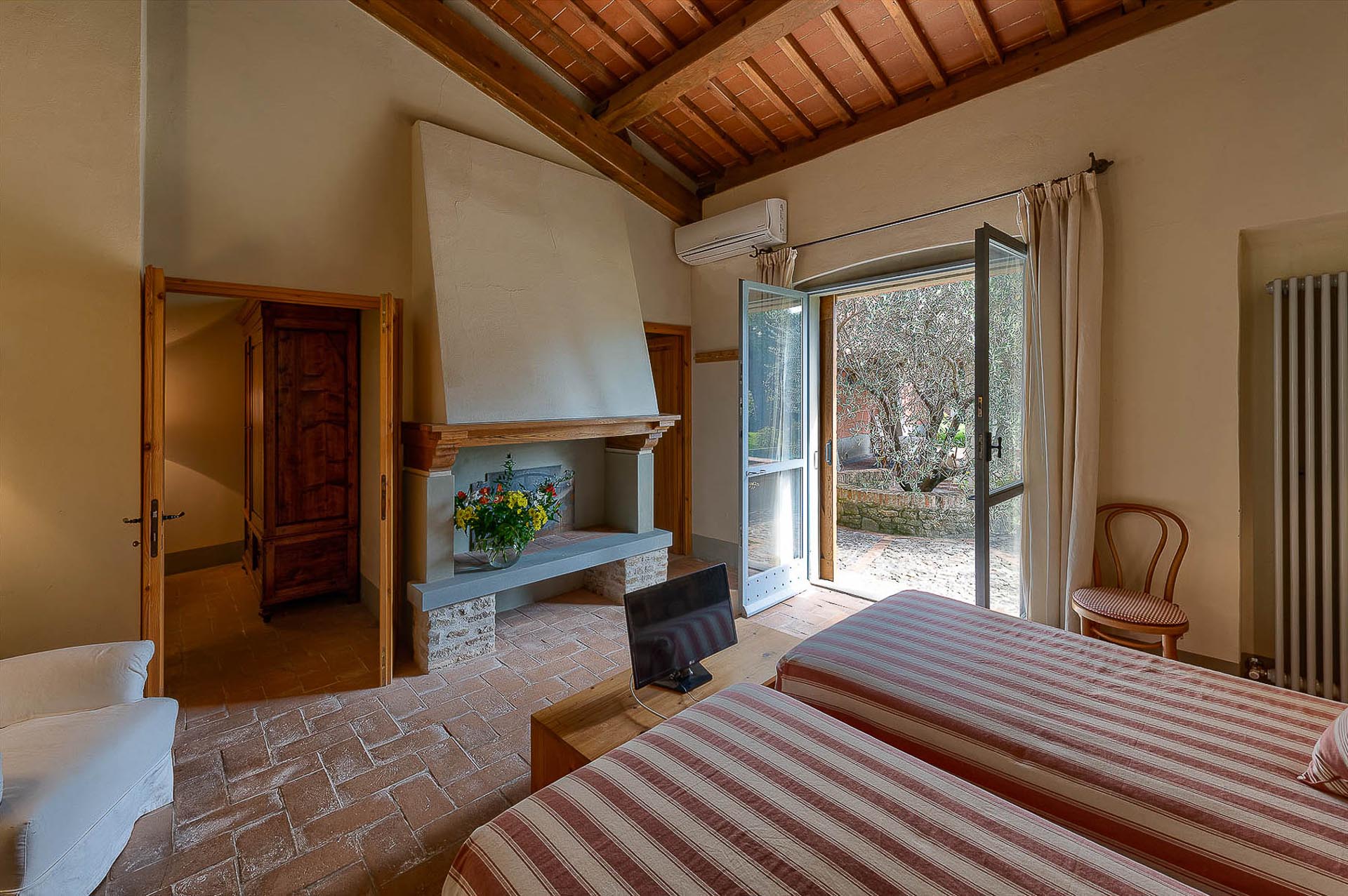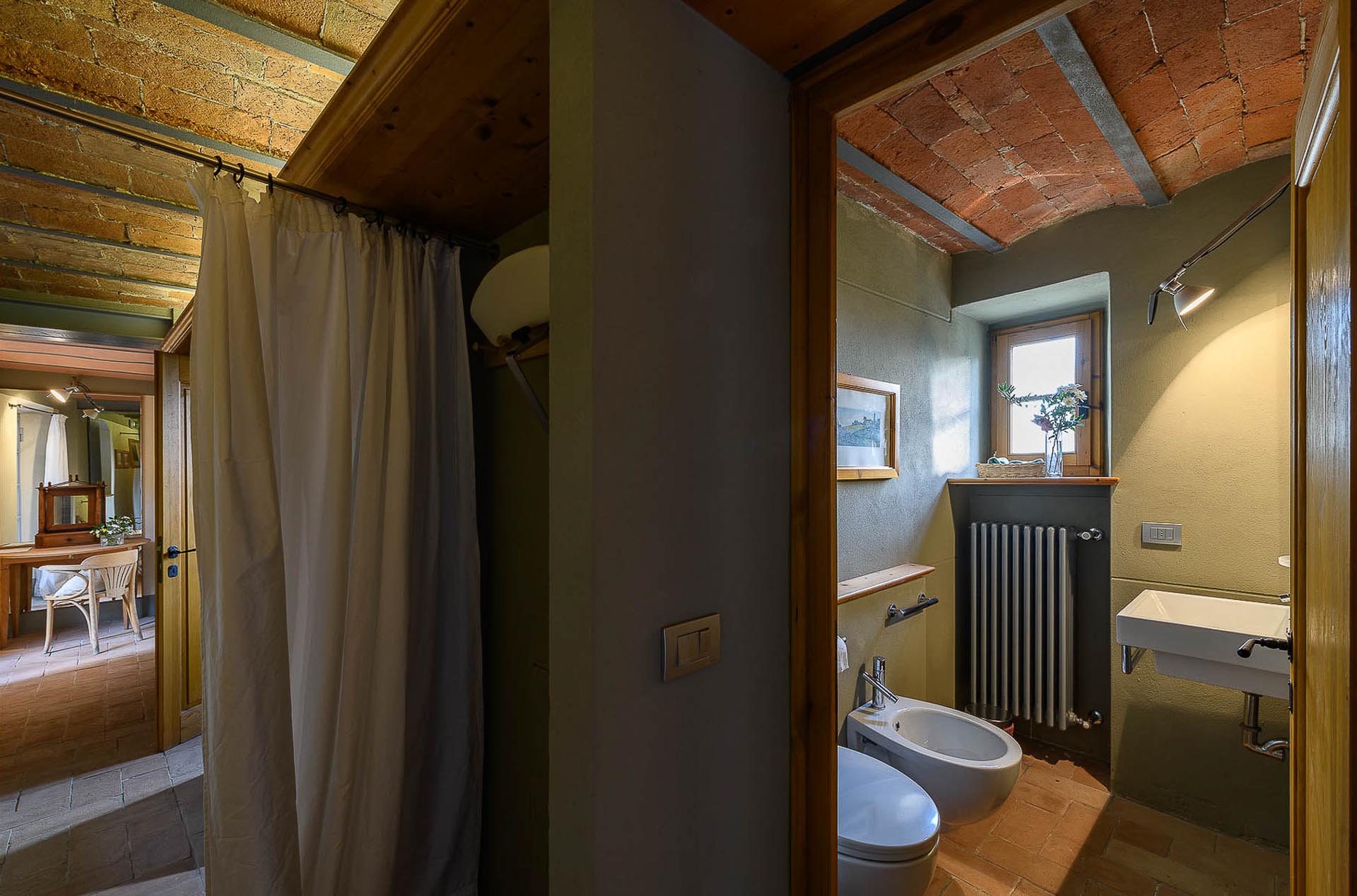 The interior design results from a classic yet renovated style with original handmade terracotta floor and woodbeamed ceilings. Elements of classic Italian architecture are combined with contemporary touches such as LED lights set in antique lamp holders, the steel kitchens in industrial style, the bathroom’s design inspired by the feeling of modern life. Materials, such as travertine marble, serene stone, and wood features have been sourced locally.