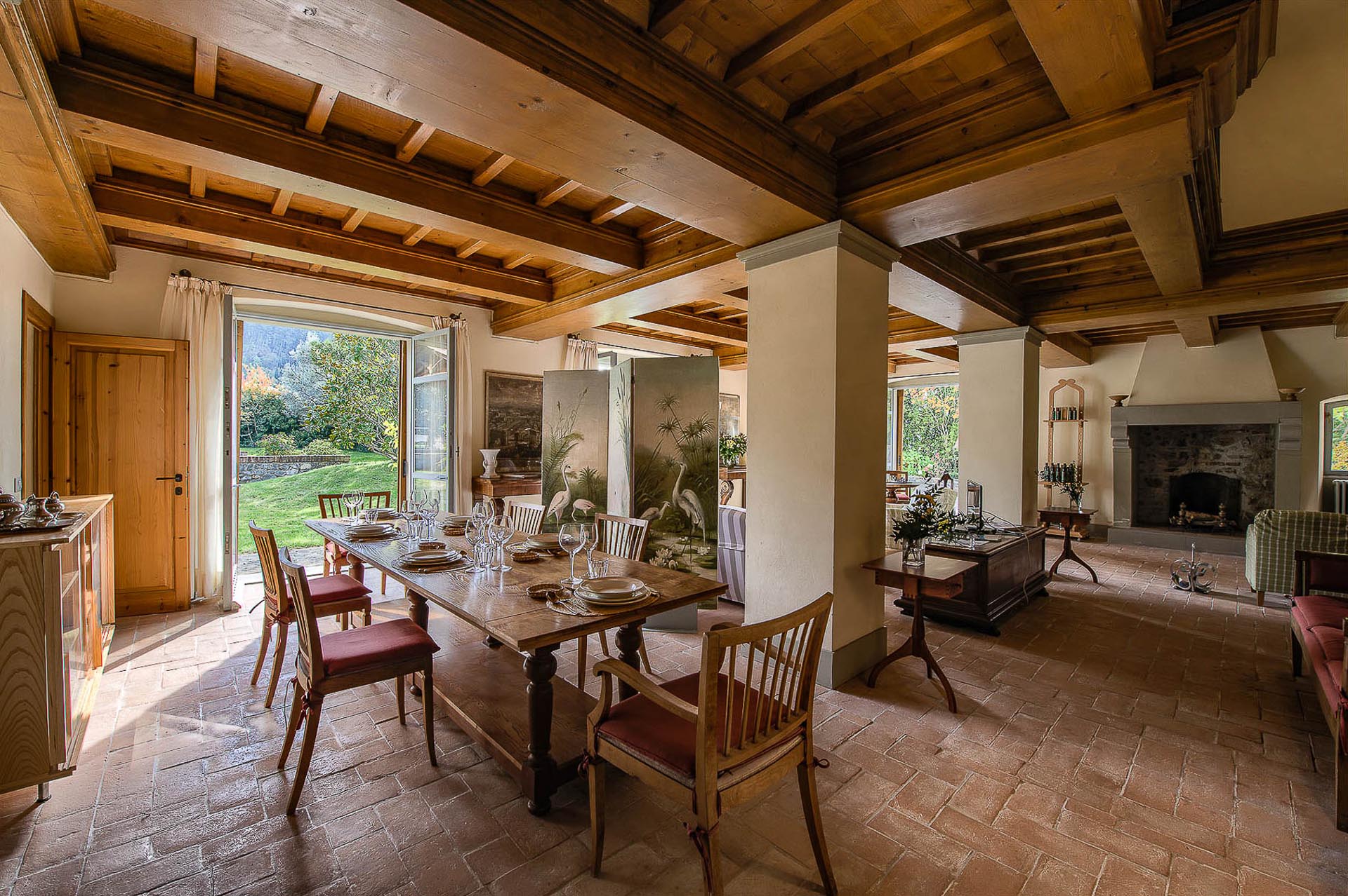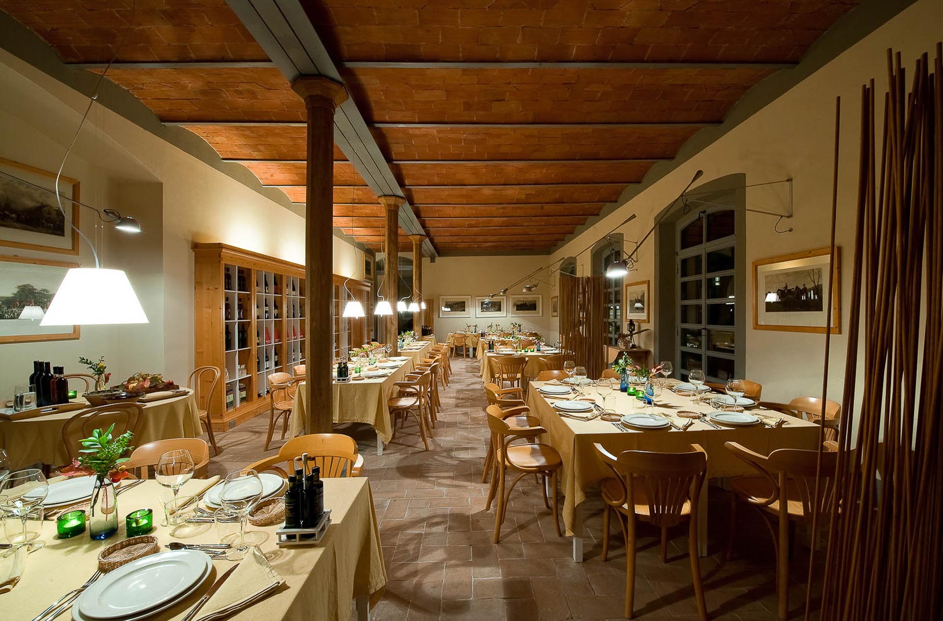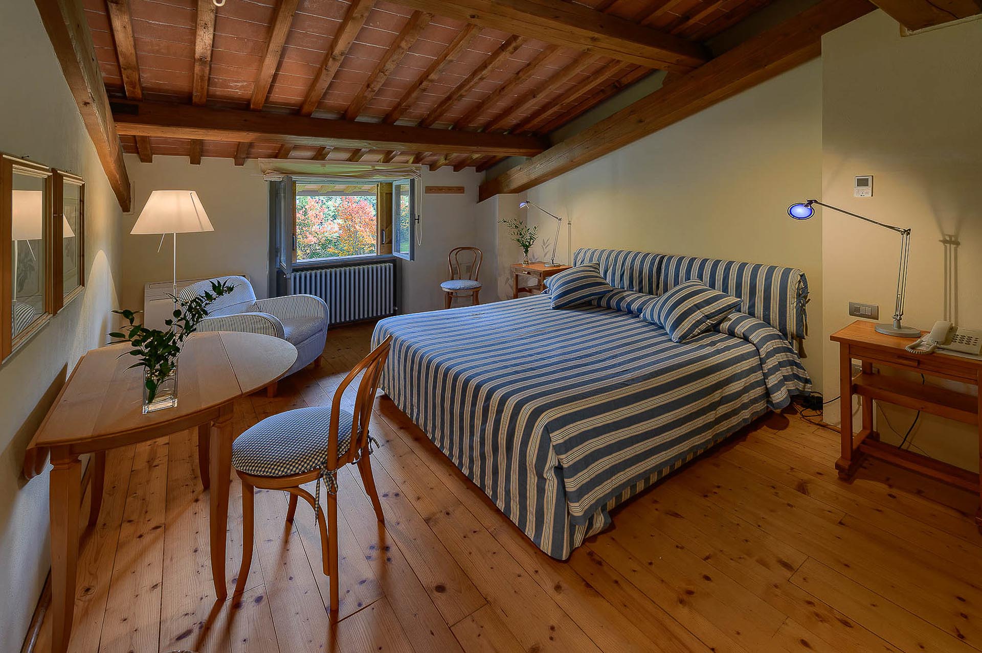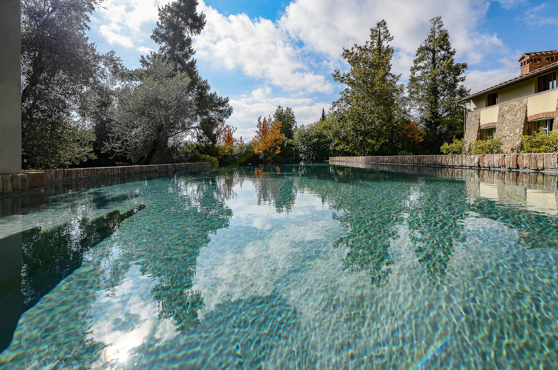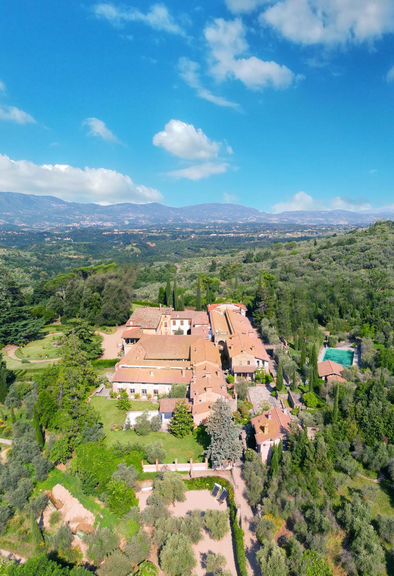 The interior design results from a classic yet renovated style with original handmade terracotta floor and woodbeamed ceilings. Elements of classic Italian architecture are combined with contemporary touches such as LED lights set in antique lamp holders, the steel kitchens in industrial style, the bathroom’s design inspired by the feeling of modern life. Materials, such as travertine marble, serene stone, and wood features have been sourced locally.
