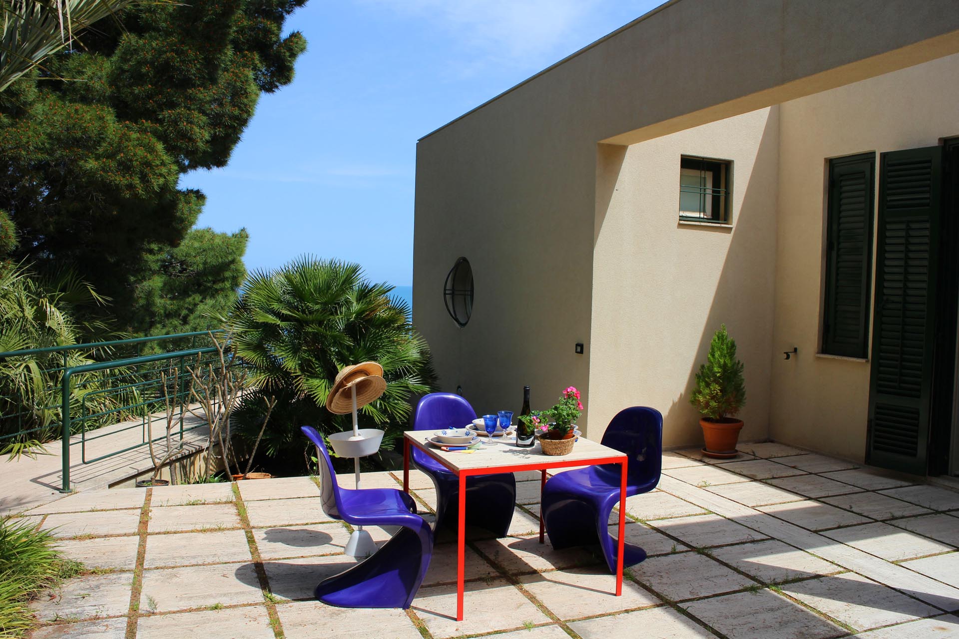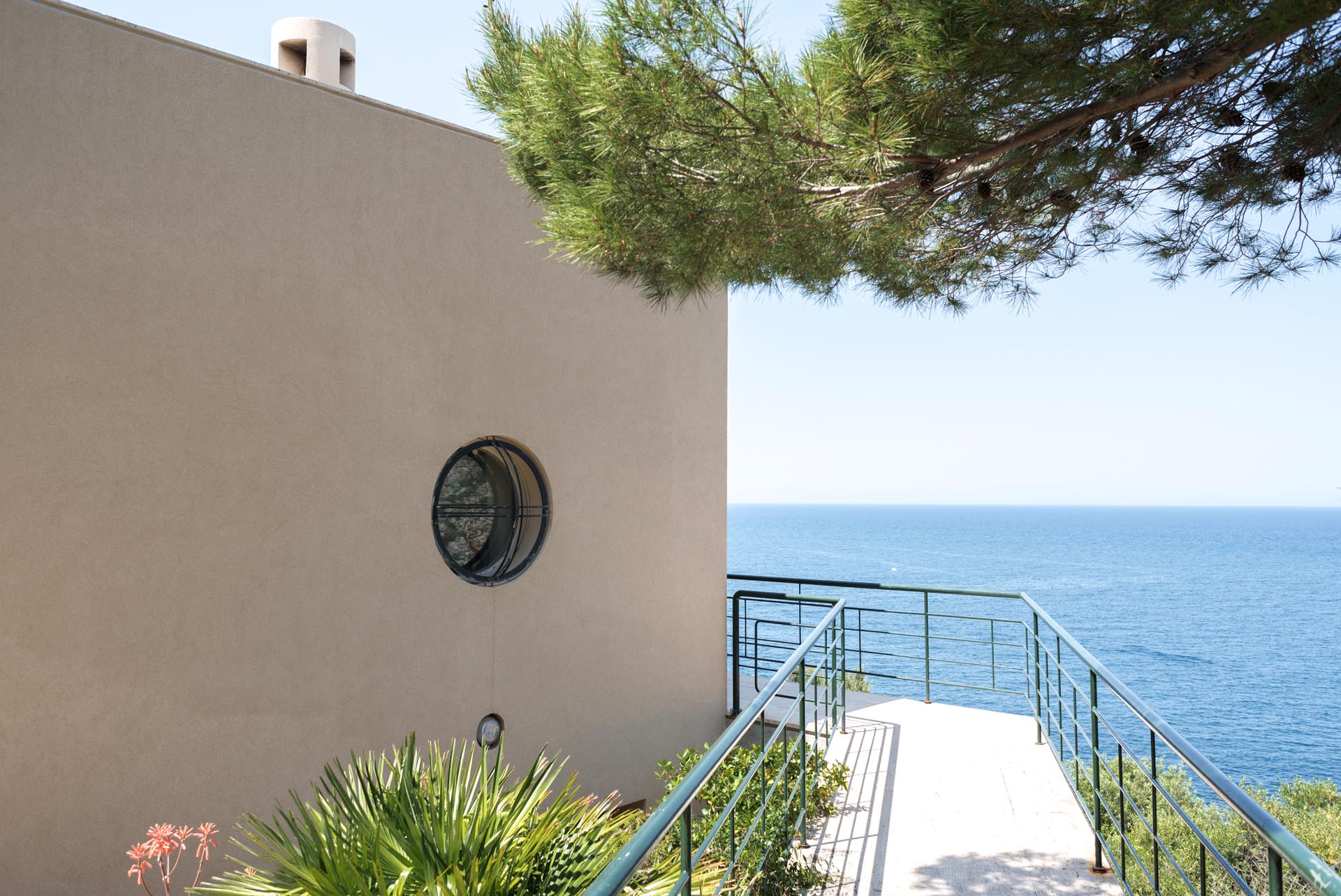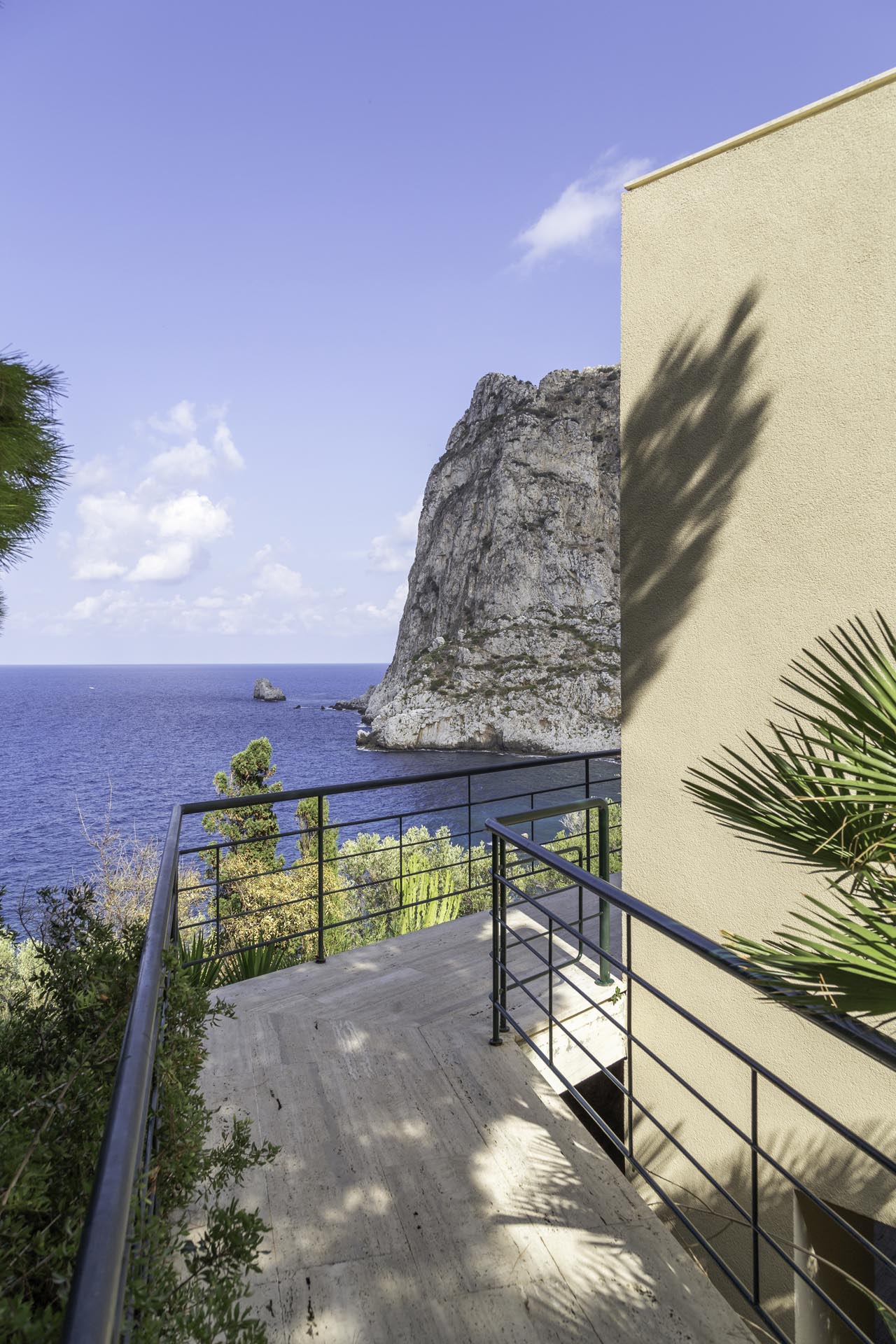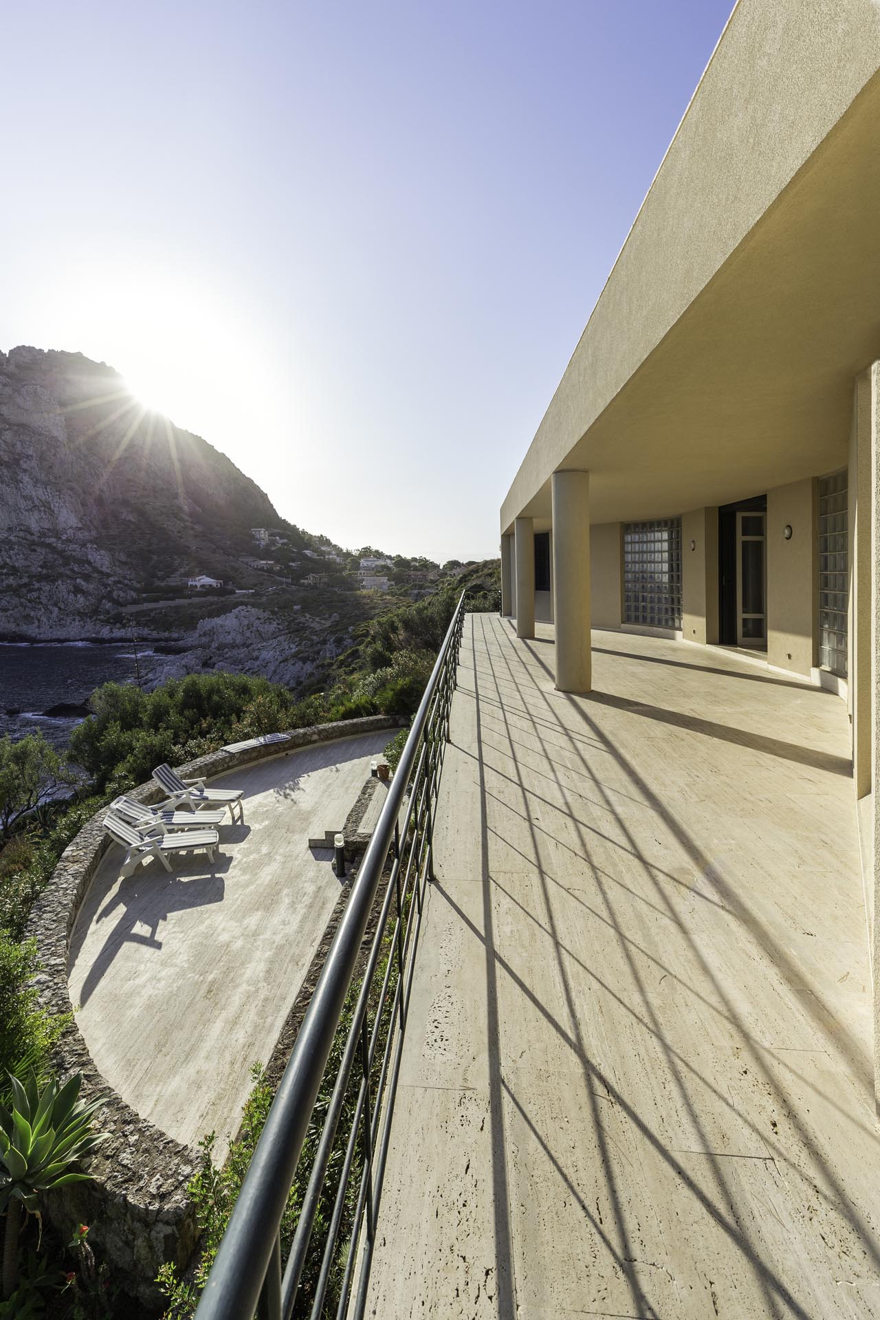 Located near the charming town of Bagheria half an hour away from Palermo, in Sicily, the house comes with its garden made up of olive trees, palms and agaves and with private access to the sea. Set on the highest point of his hills, the three-level house affords views of the scenic landscape from almost every angle.