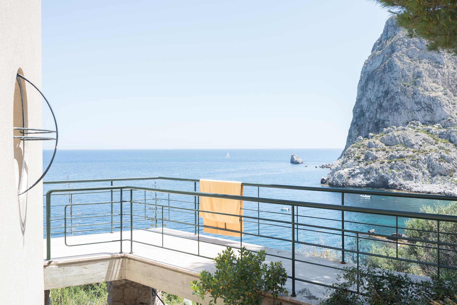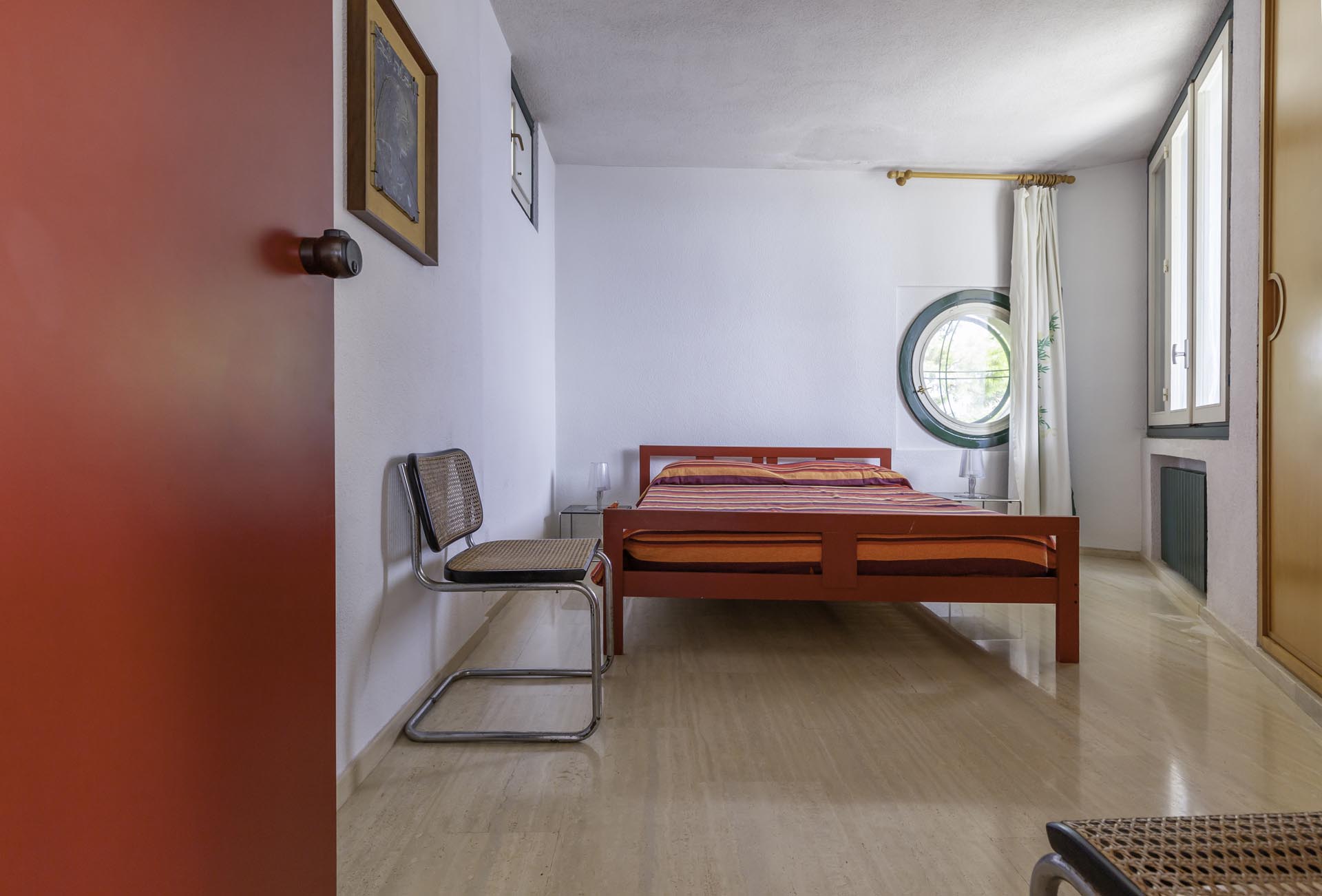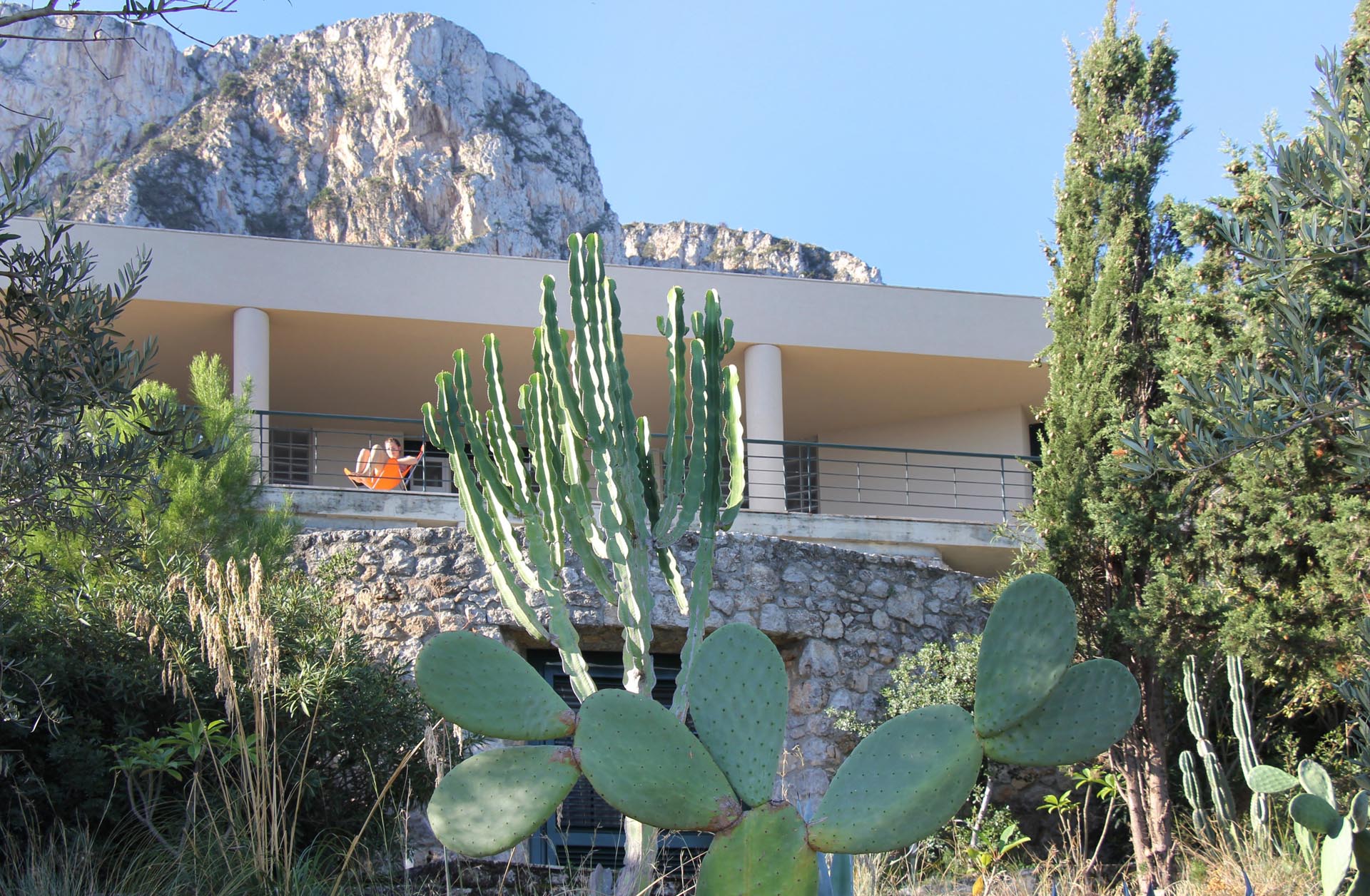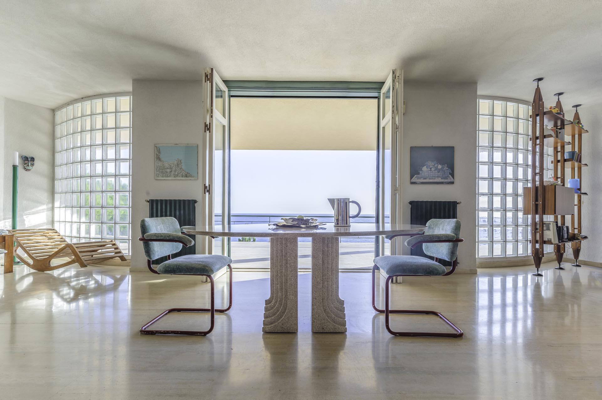 Located near the charming town of Bagheria half an hour away from Palermo, in Sicily, the house comes with its garden made up of olive trees, palms and agaves and with private access to the sea. Set on the highest point of his hills, the three-level house affords views of the scenic landscape from almost every angle.